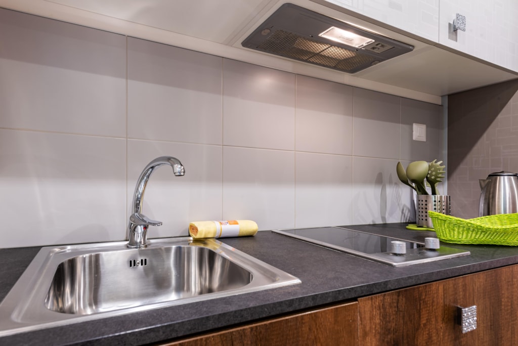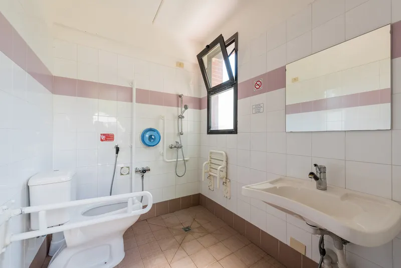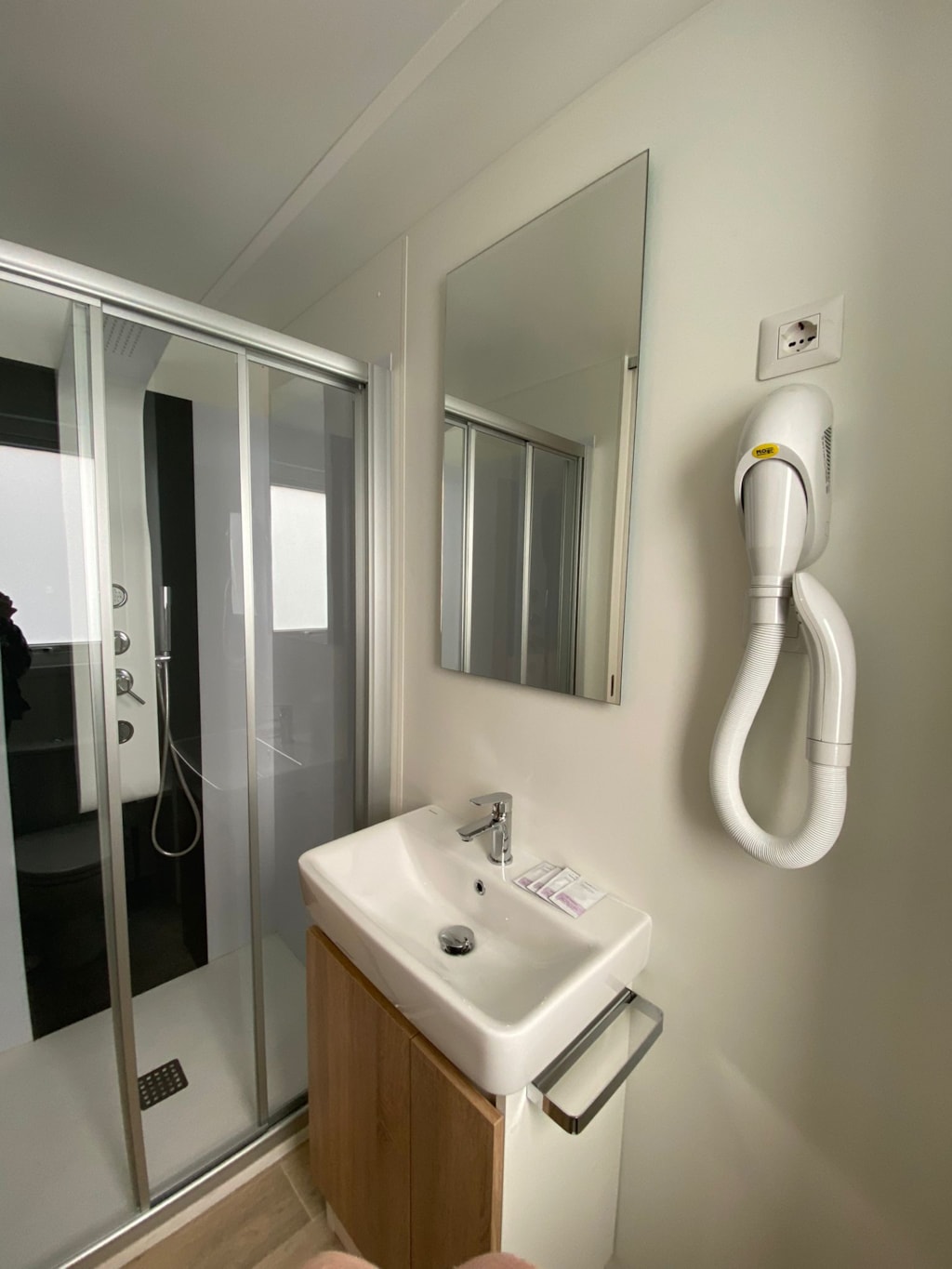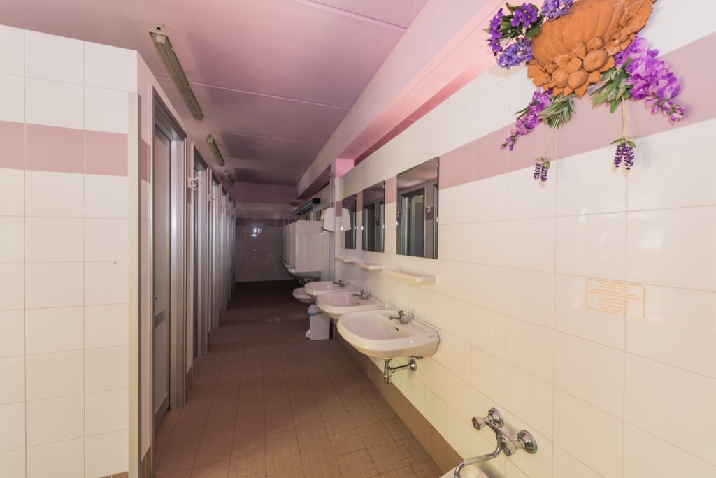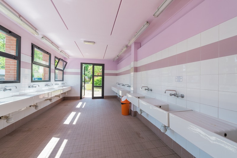 zu geringer Wasserdruck auf den Sanitäranlagen und keine Mischbatterien an Waschbecken und Duschen Badehauben