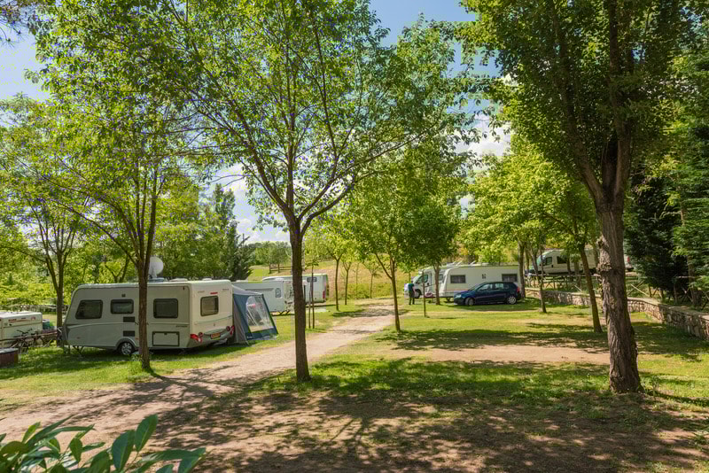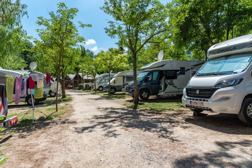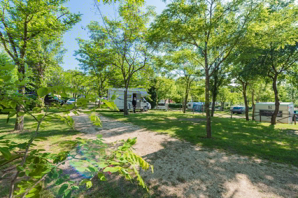 Große Stellplätze von ca. 80-100 m 2, grasbewachsen und schattig, alle mit Strom (10 Ampere) und europäischen Anschlüssen.