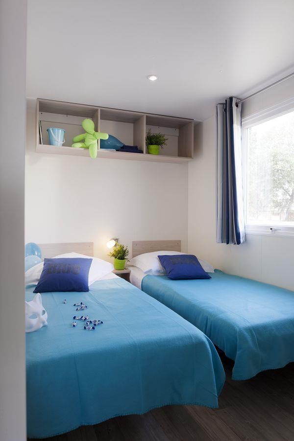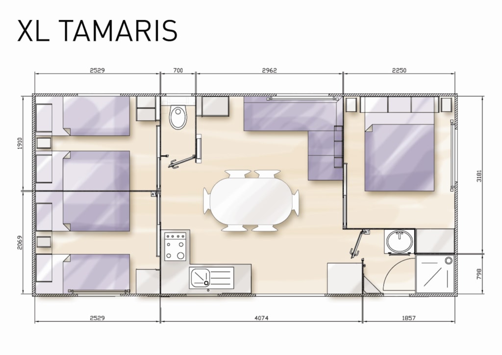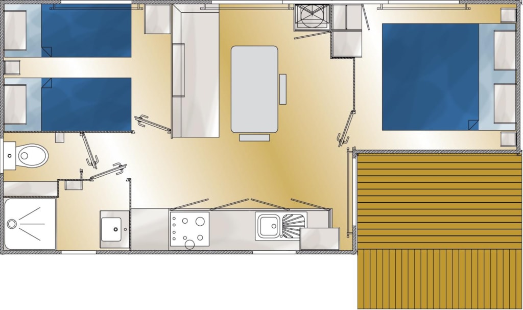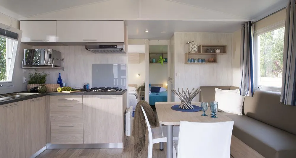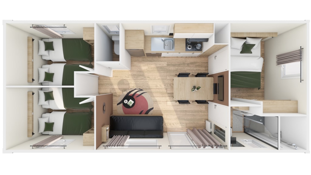 Mit dem besten Preis-Leistungs-Verhältnis ist unser Mobilheim Standard 32m² die ideale Unterkunft für einen Familien- oder Freundesurlaub. Dieses voll ausgestattete Mobilheim bietet Platz für bis zu 6 Personen und verfügt über 3 geräumige Schlafzimmer für optimalen Komfort. Das Wohnzimmer mit Fernseher und die vollständig ausgestattete Küche bieten alles, was Sie für angenehme gemeinsame Momente benötigen.