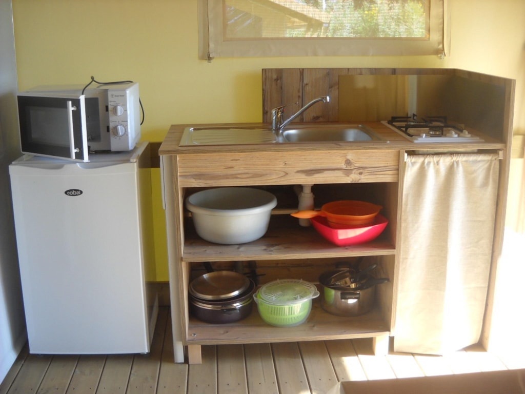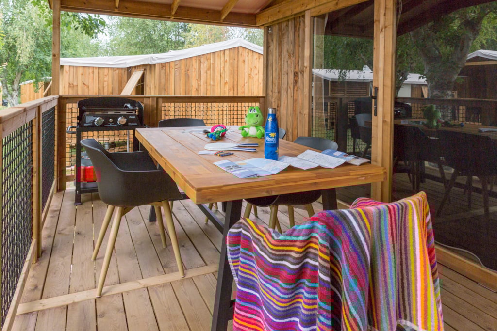 Dieses geräumige Zelt verfügt über zwei Schlafzimmer und bietet ausreichend Platz zum Entspannen. Die überdachte Terrasse von 8m² ist ideal, um den Abend im Freien zu genießen, sei es bei einer Mahlzeit oder einfach zum Entspannen nach einem abenteuerlichen Tag. Obwohl das Zelt kein eigenes Bad oder keine Toilette hat, befindet sich ein moderner Sanitärblock in der Nähe, der Ihnen Komfort bietet.