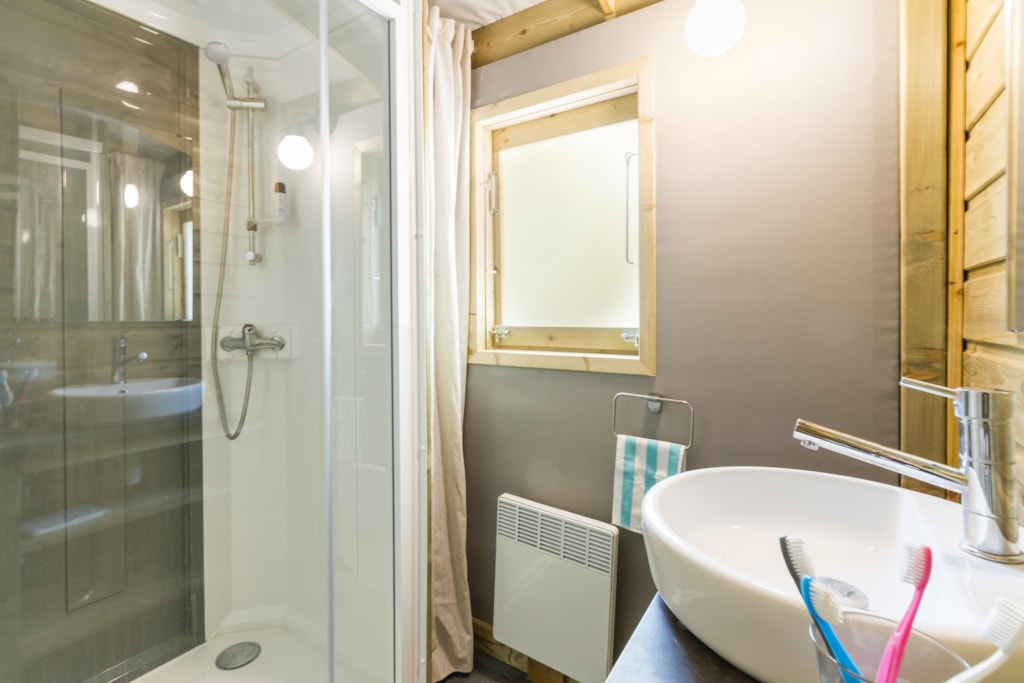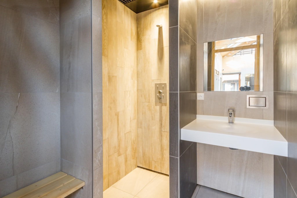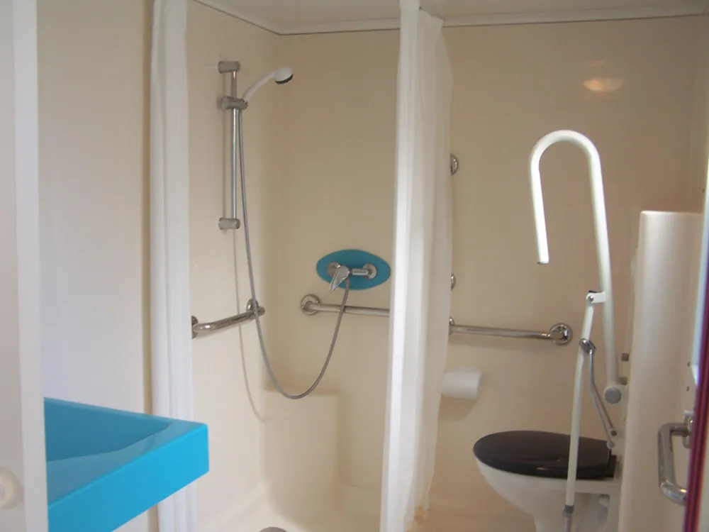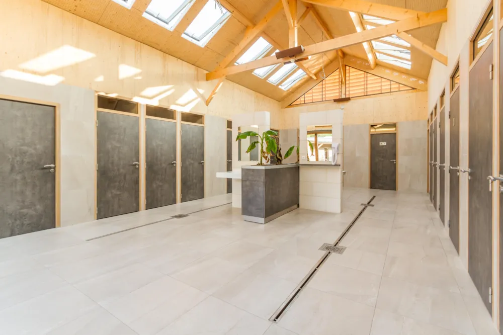 Ruime prive sanitair met separate ruime douche, wc en wastafel met koelkast. Heel ruime staanplaats, die ook super goed afwatert bij een regenbui. Ideaal!