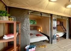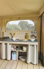 Zwischen dem Mobilheim und dem Zelt ist das Coco Sweet eine ungewöhnliche Dauerunterkunft mit 4 Betten, 2 Schlafzimmern und einem Wohnzimmer mit Kochnische für Mahlzeiten.