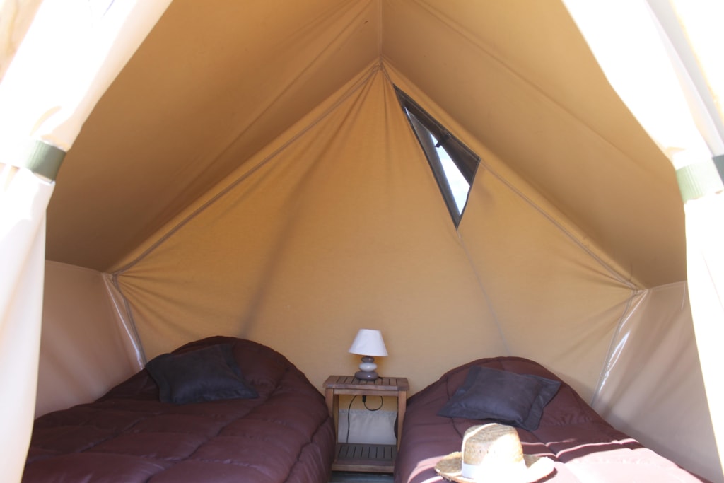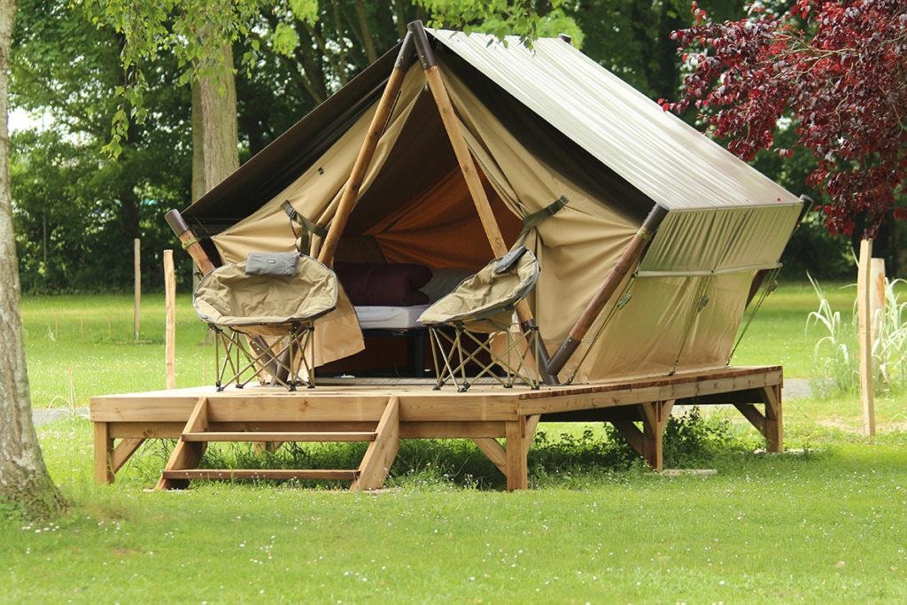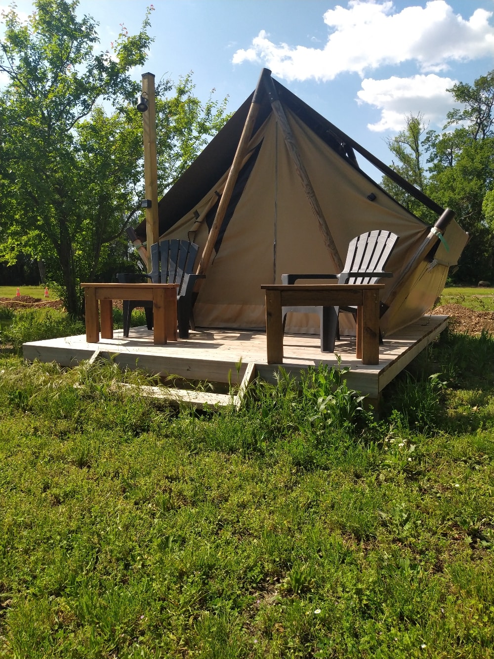 Übernachtung in einem wiederbesuchten Kanadier mit 2 echten Betten und einer Terrasse auf Stelzen.