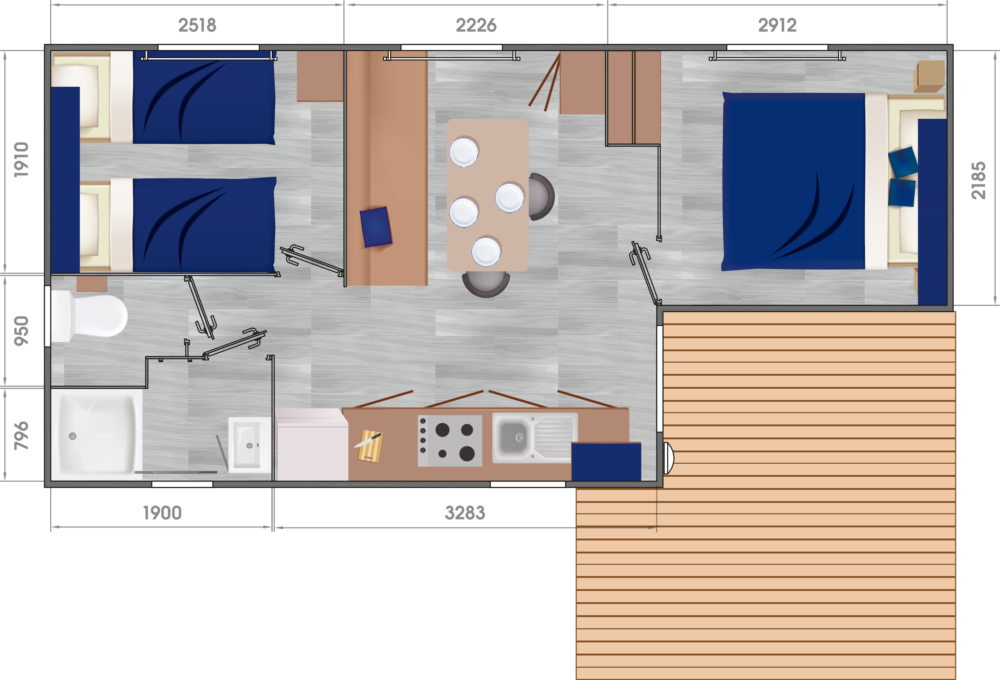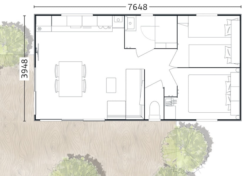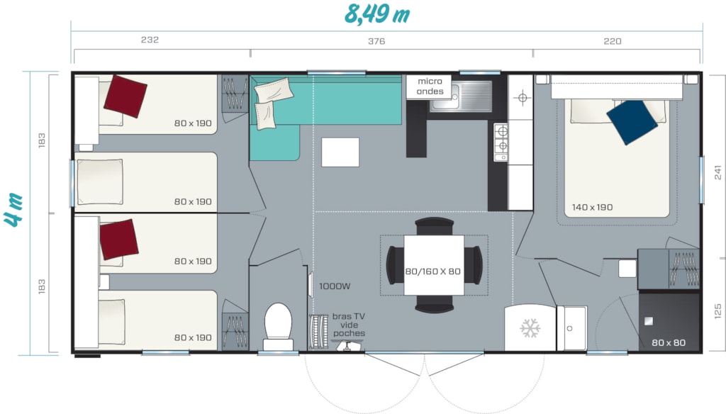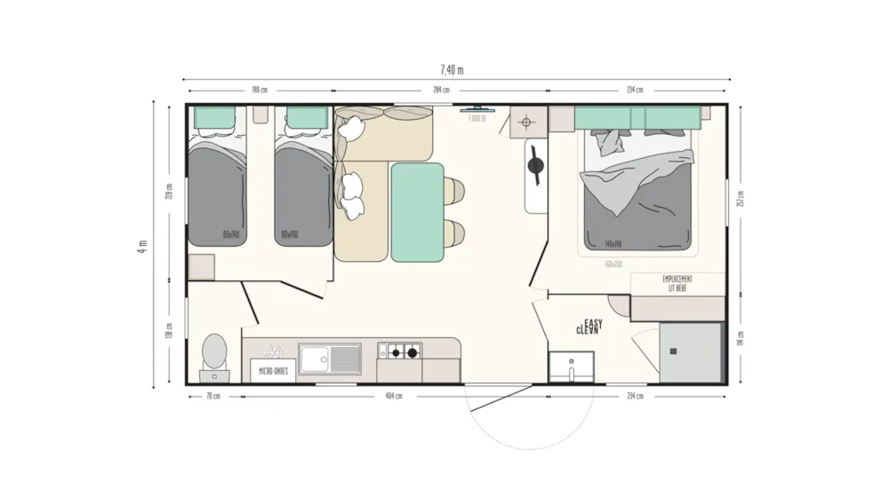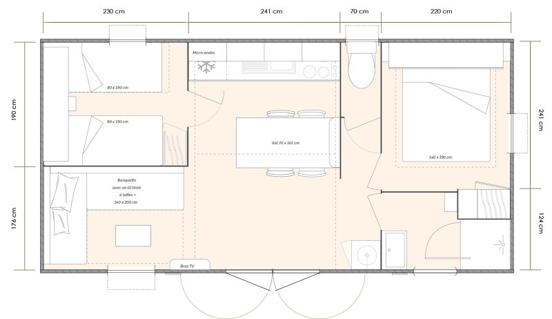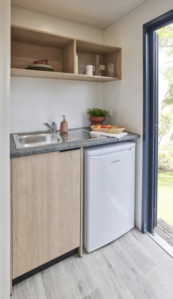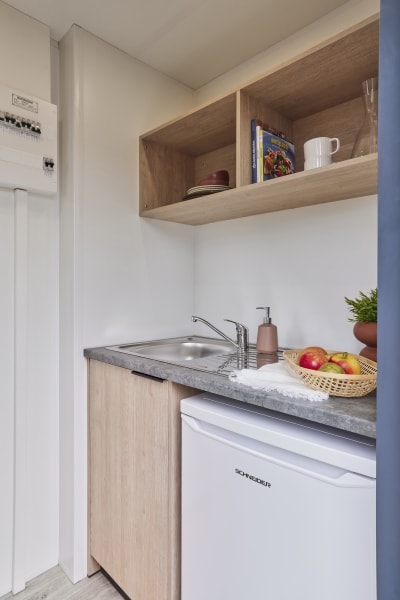 - Ausgestattet mit einem Raum mit Spüle + Kühlschrank oben und Stauraum, einem Badezimmer mit 80x100-Dusche und einem WC.