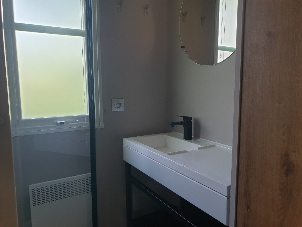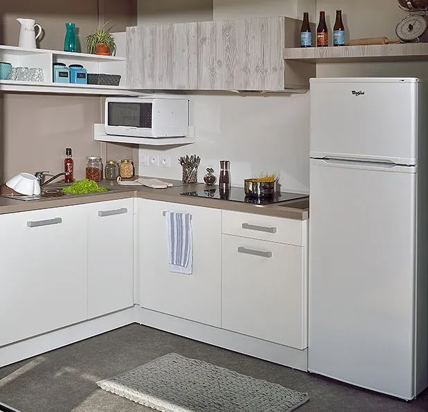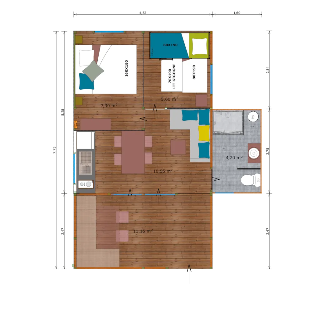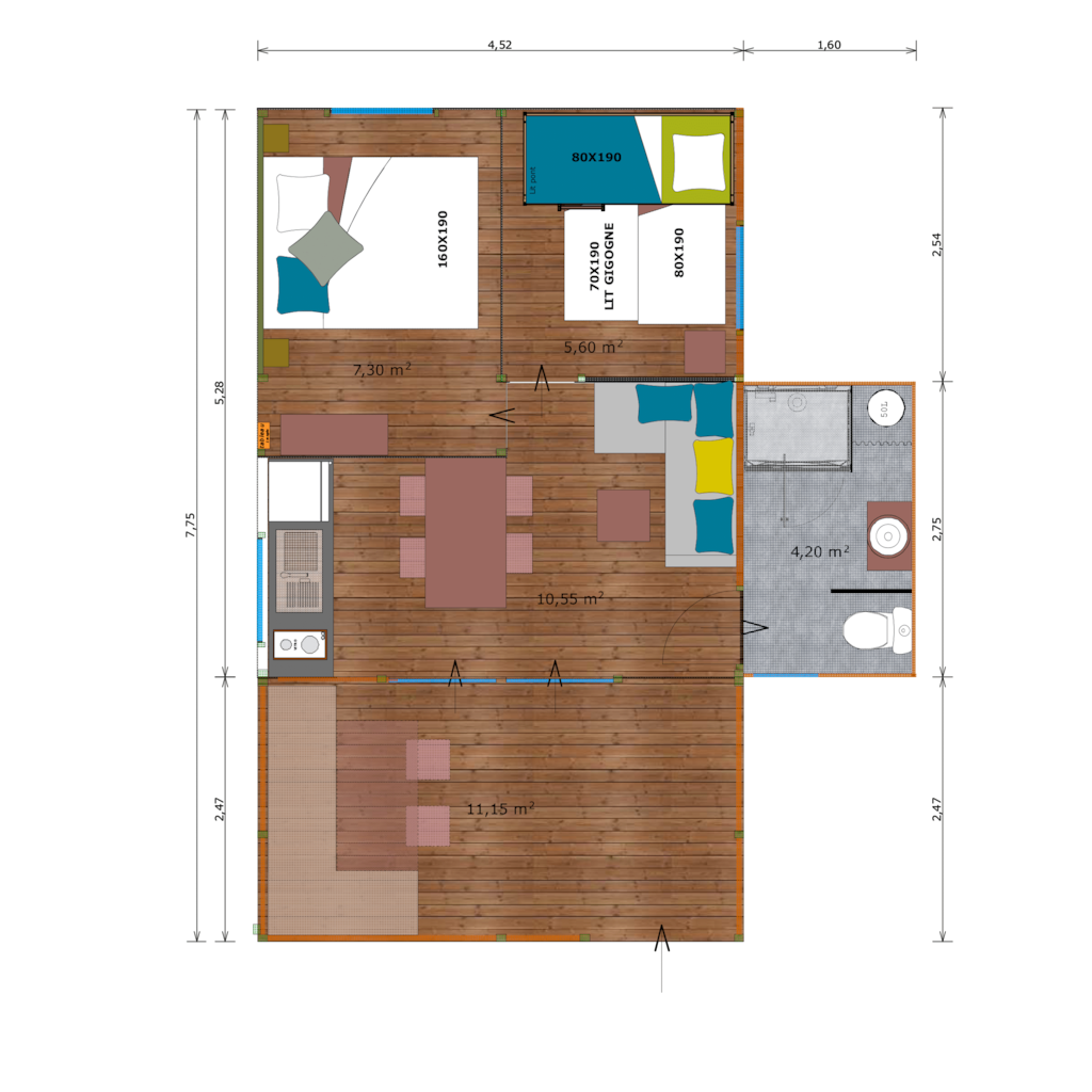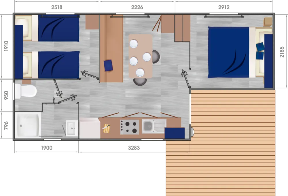 - Ausgestattet mit einem Raum mit Spüle + Kühlschrank oben und Stauraum, einem Badezimmer mit 80x100-Dusche und einem WC.