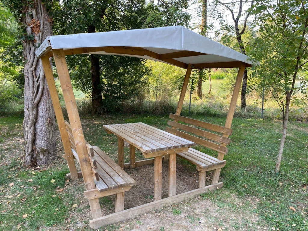 - Ausgestattet mit einem Gartenhaus, einem kleinen Kühlschrank, 2 Liegestühlen und einem überdachten Picknicktisch