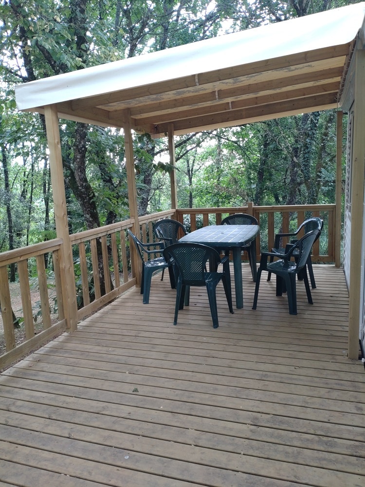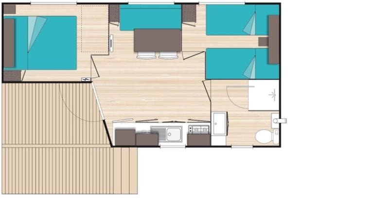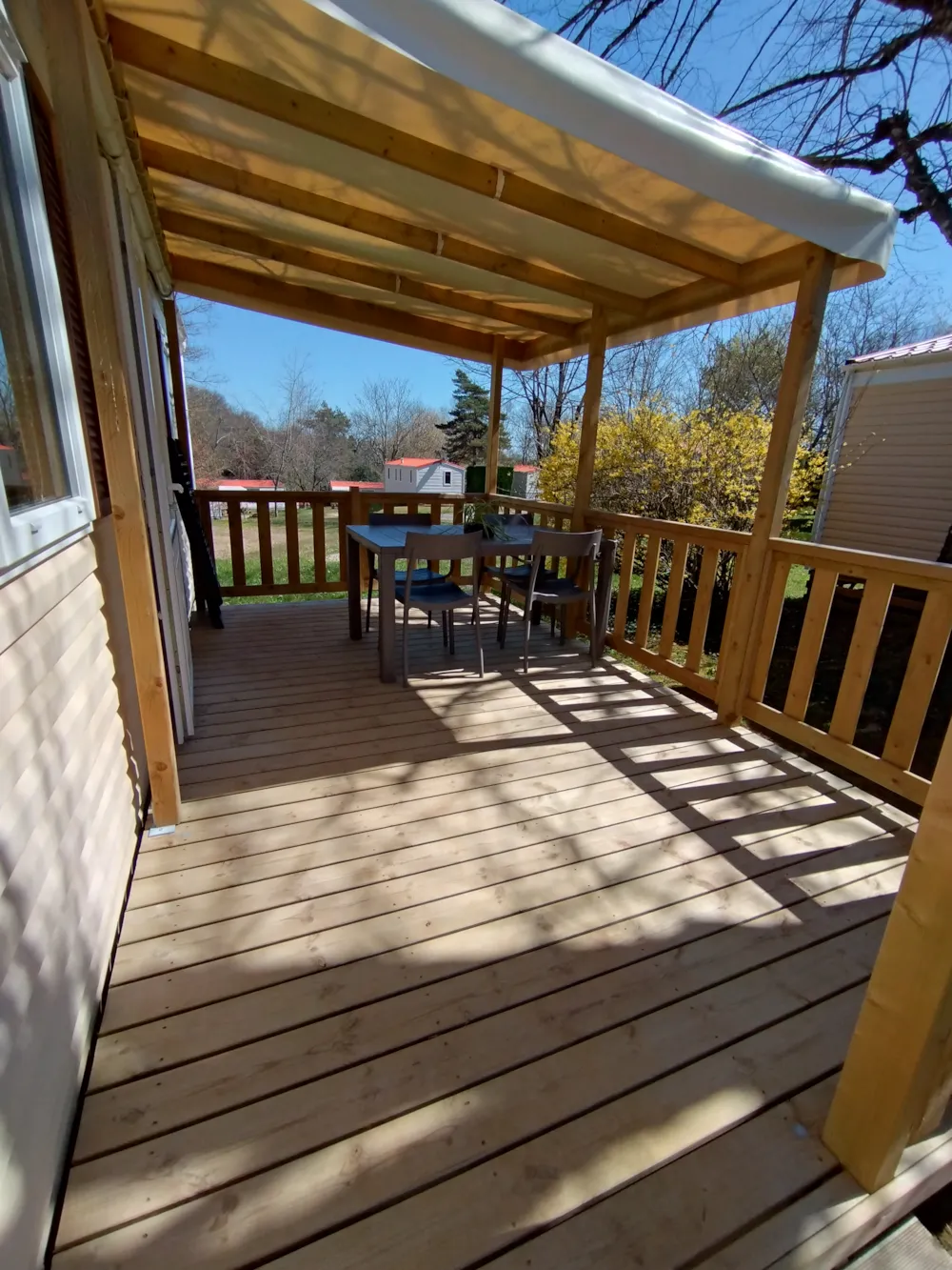 Confortable et tout équipé, ce mobil-home est idéal pour une famille de 6 personnes. Sa terrasse vous permettra de profiter pleinement du cadre vallonné, arboré et fleuri de notre camping. Surélevée et en bois, elle est d’une surface agréable de 15 m² : l’idéal pour accueillir vos repas sa table de jardin.