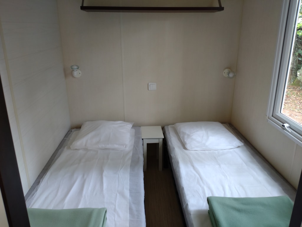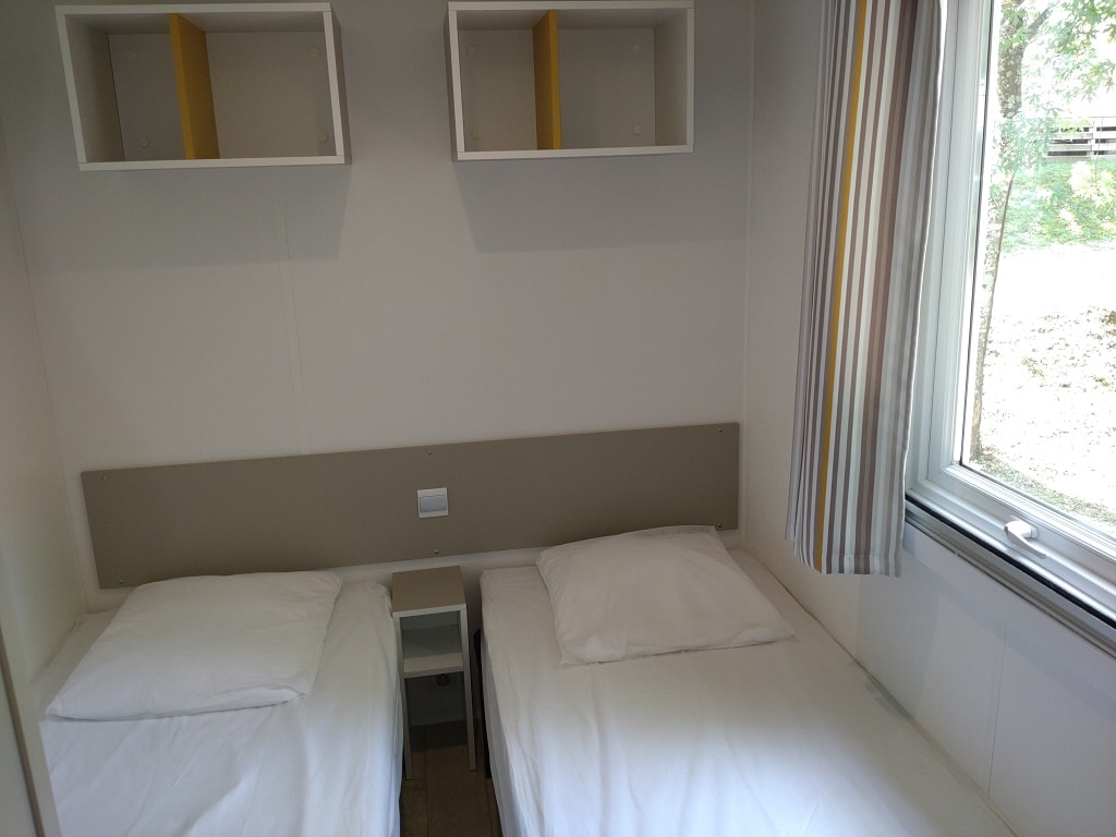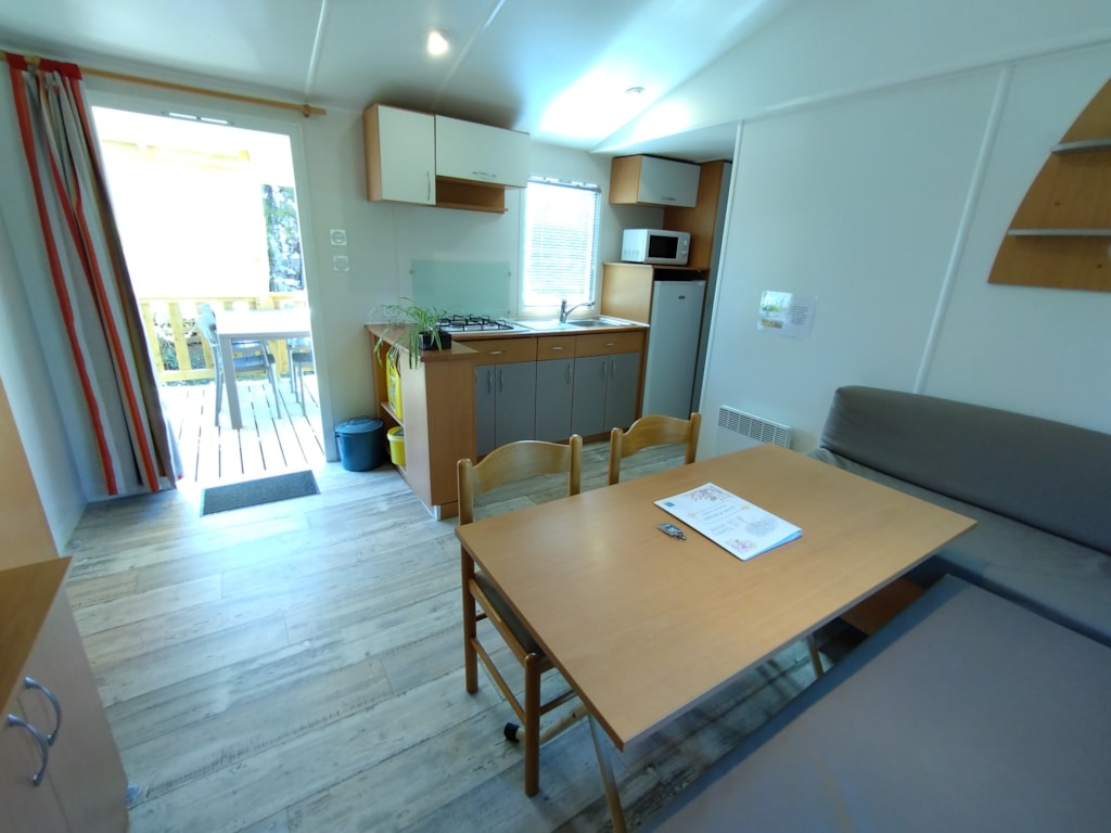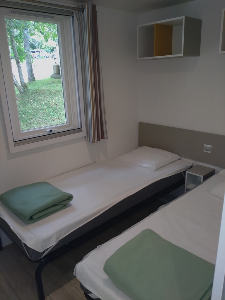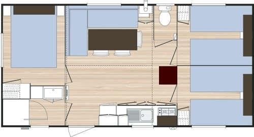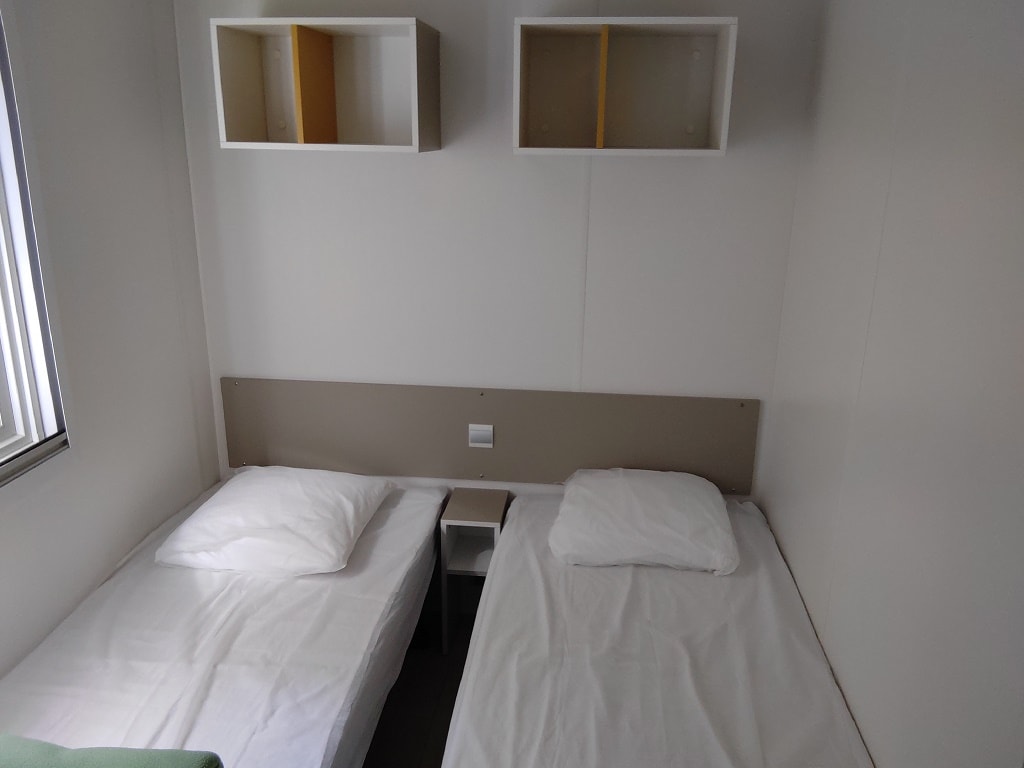 Confortable et bien configuré, ce mobil-home est idéal pour une famille de 4 personnes. Il dispose d'une grande pièce de vie avec cuisine ouverte et toute équipée (frigo-congélateur, cafetière, 4 feux gaz, micro-onde, TV), d'une chambre parentale avec accès direct à la salle de bain ainsi que d'une chambre avec deux lits simples, chacunes équipées de stores occultants et moustiquaires aux fenêtres.