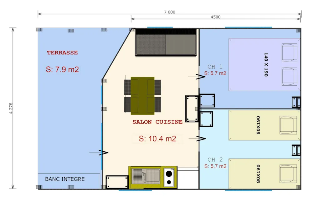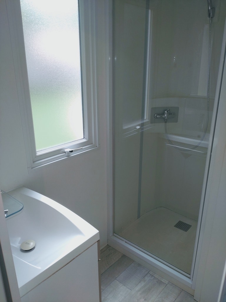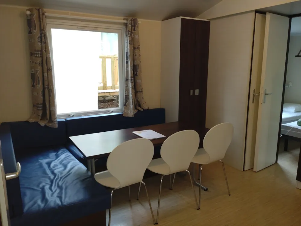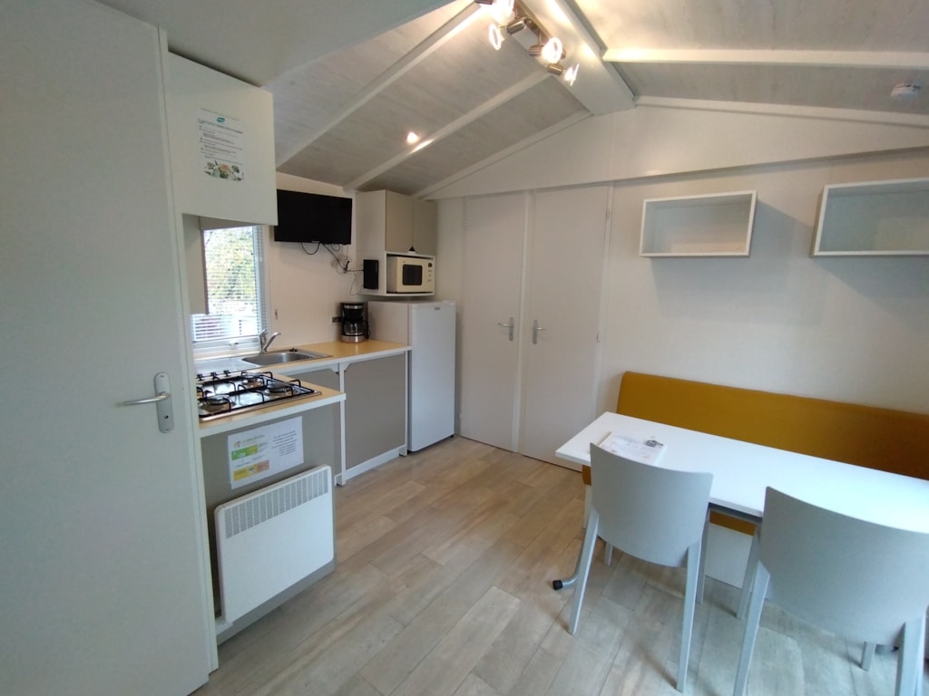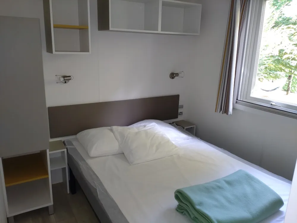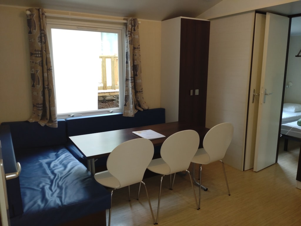 Confortable et bien configuré, ce mobil-home est idéal pour une famille de 4 personnes. Il dispose d'une grande pièce de vie avec cuisine ouverte et toute équipée (frigo-congélateur, cafetière, 4 feux gaz, micro-onde, TV), d'une chambre parentale avec accès direct à la salle de bain ainsi que d'une chambre avec deux lits simples, chacunes équipées de stores occultants et moustiquaires aux fenêtres.