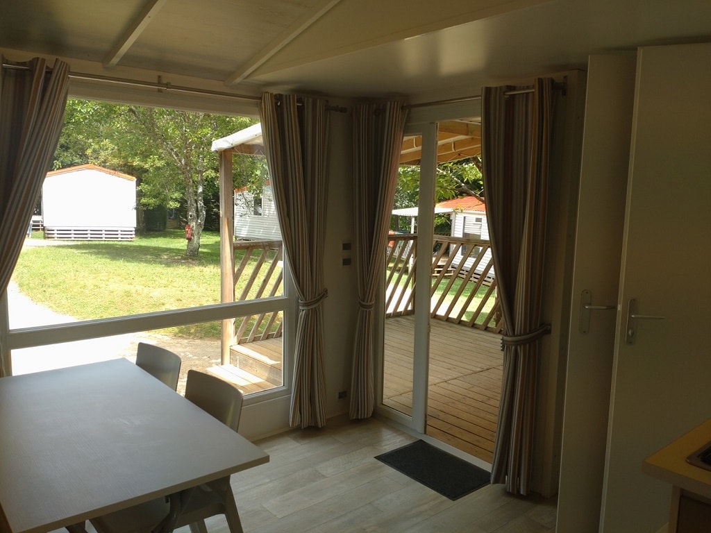 Récent , spacieux et confortable ce mobil-home vous invite à passer vos vacances en Dordogne dans les meilleures conditions. Ses 28 m² de surface intérieure comprennent 3 chambres équipées de stores occultants et moustiquaires, dont une parentale. Avec 6 couchages en chambre et 2 couchages hors chambre, ce locatif a une capacité d’accueil de 8 personnes. Idéal pour une famille de 6, il dispose de nombreux rangements, d’une salle d’eau avec douche et lavabo, d'une cuisine équipée (frigo-congélateur, micro-onde, cafetière,4 feux gaz) et d'une terrasse couverte.
