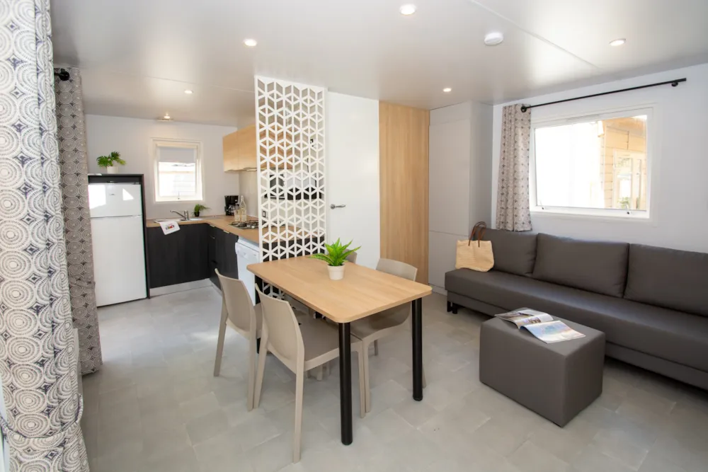 Dieses Mobilheim ist so konzipiert, dass die Bewegung und die Nutzung der Geräte erleichtert werden. Der klimatisierte Wohnbereich umfasst eine ausgestattete Küche mit Kühlschrank, 4-Flammen-Herd, Mikrowelle und Kaffeemaschine. Der Schlafbereich besteht aus zwei Schlafzimmern:
