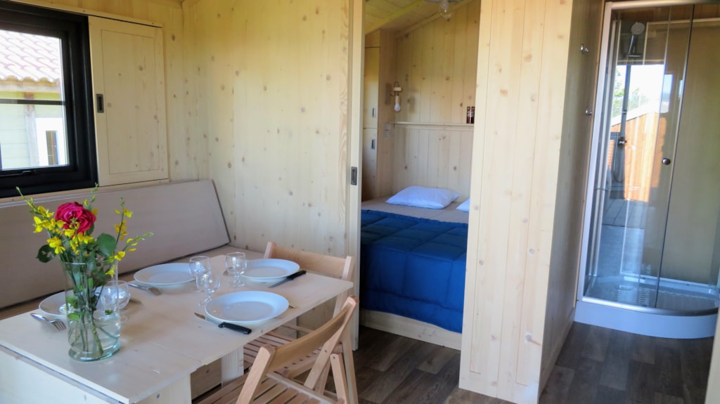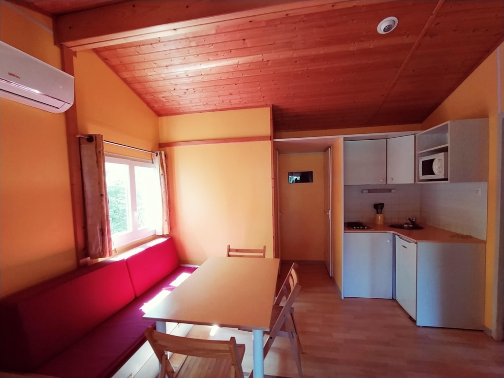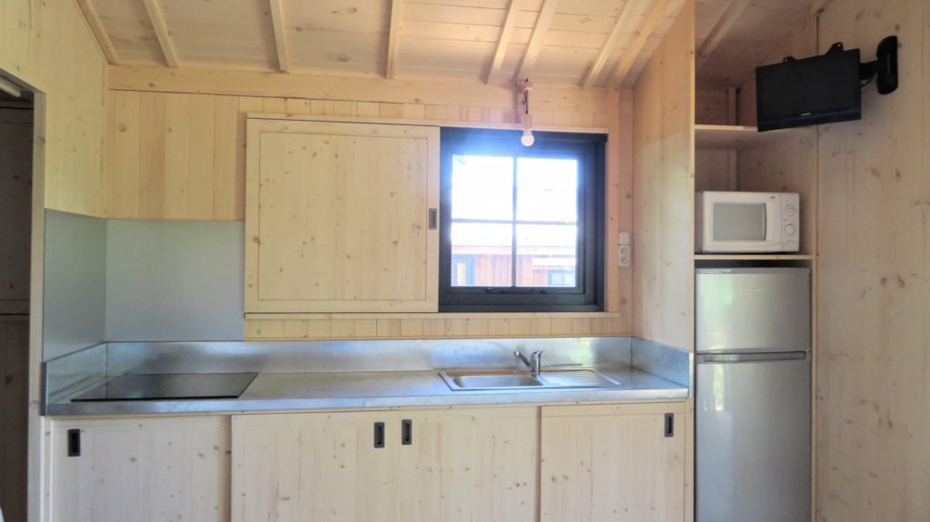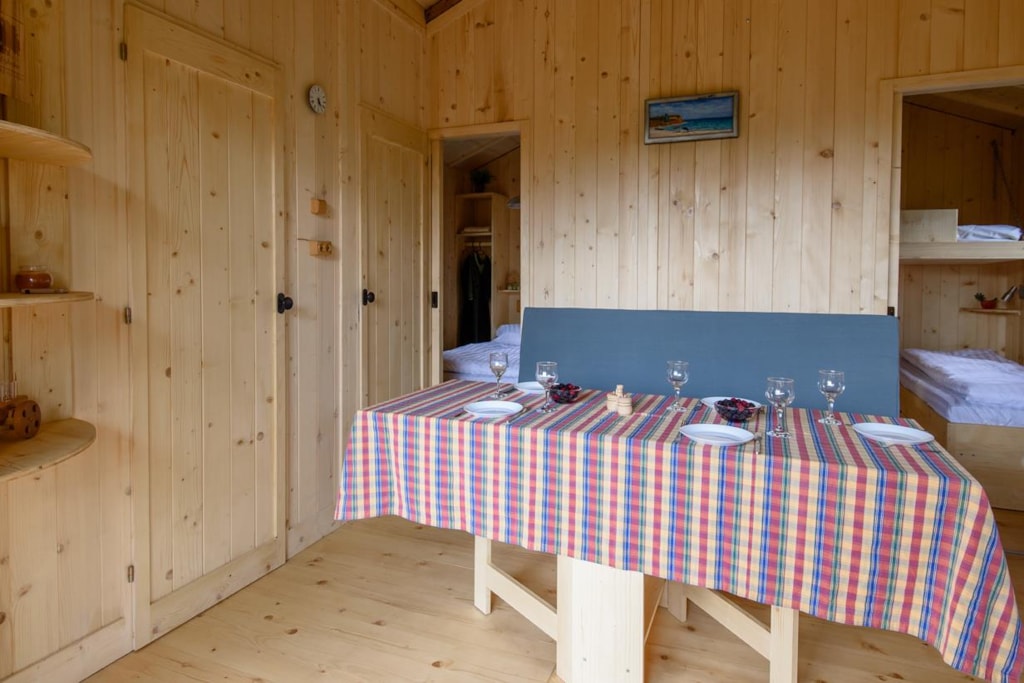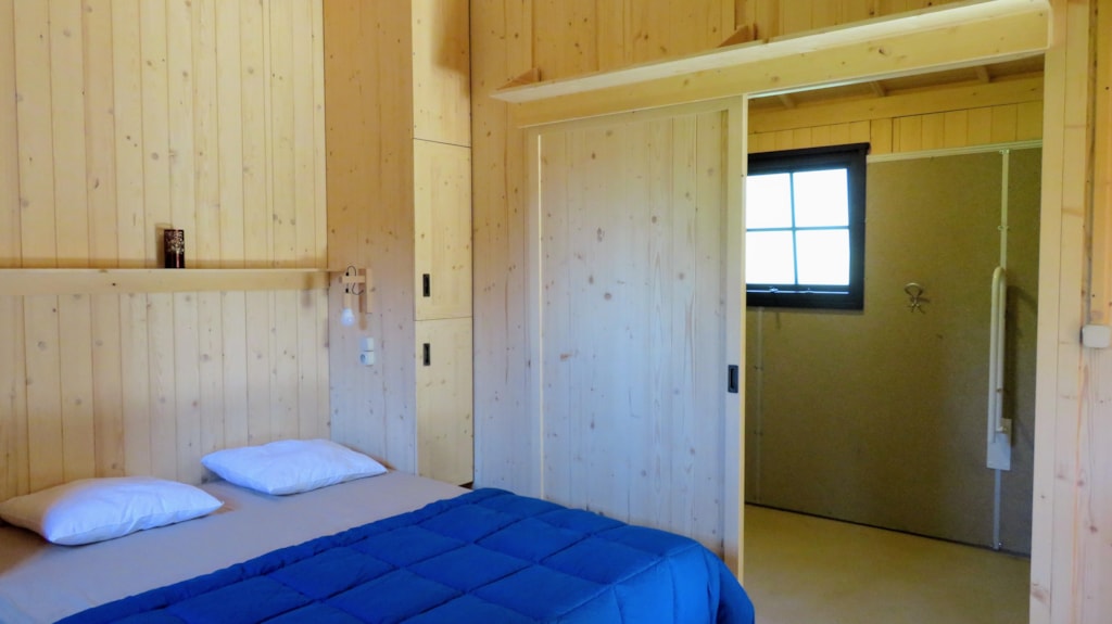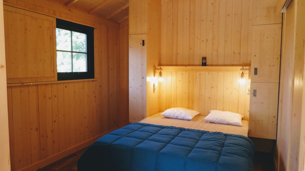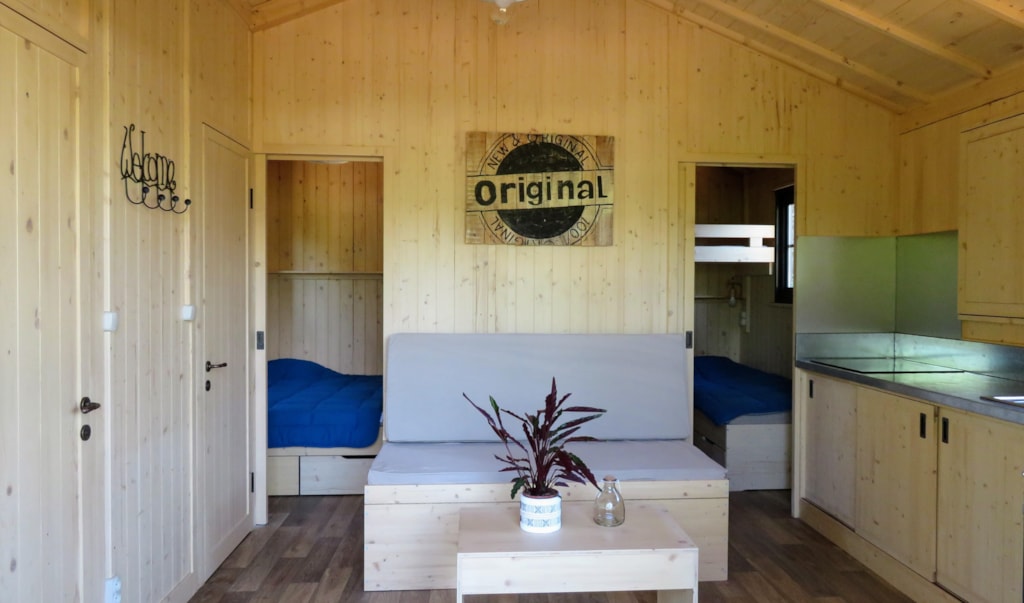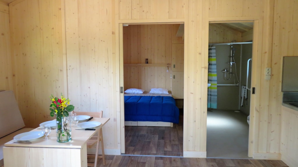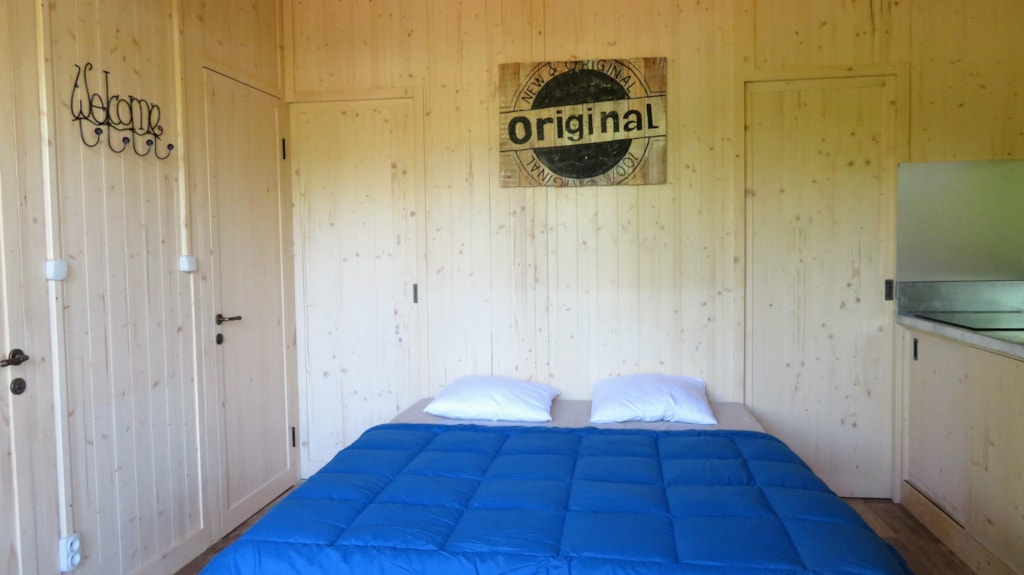 Die Feroe Lodge bietet Platz für bis zu 4 Personen. Es gibt 1 Schlafzimmer mit einem Doppelbett (160 x 200) und ein Doppelschlafsofa (160 x 200) im Wohnzimmer. Ideal für eine Familie oder eine Gruppe von Freunden. Vollständig ausgestattete Lodge. Essbereich, Küche mit Mikrowelle, Cerankochfeld, Kühl-/Gefrierschrank, Wasserkocher, Toaster und Filterkaffeemaschine. Fernseher und umkehrbare Klimaanlage. Bettdecken und Kopfkissen werden bereitgestellt. 1 Badezimmer mit Dusche und WC. Überdachte Terrasse von 12m2 mit Picknicktisch