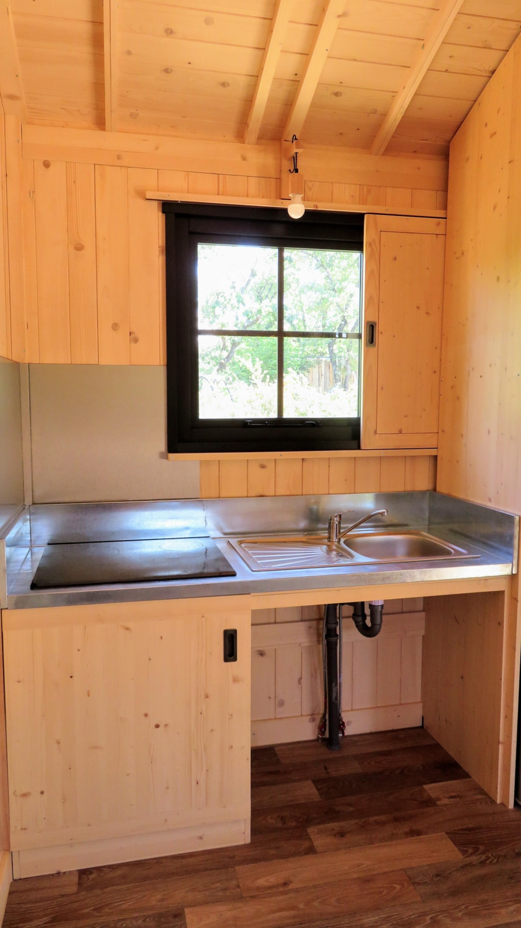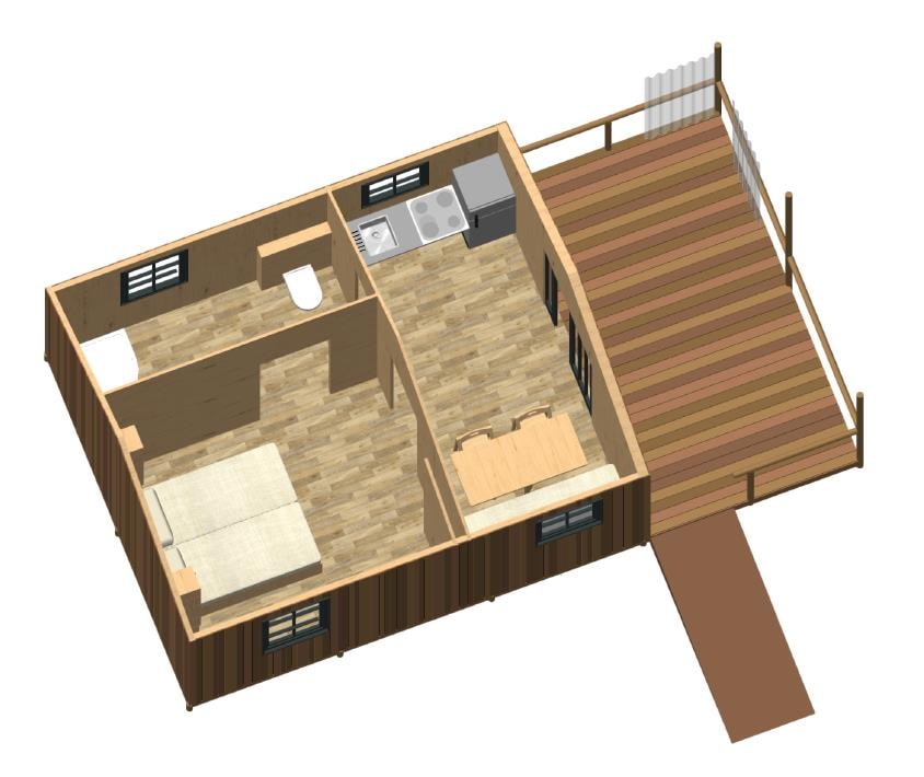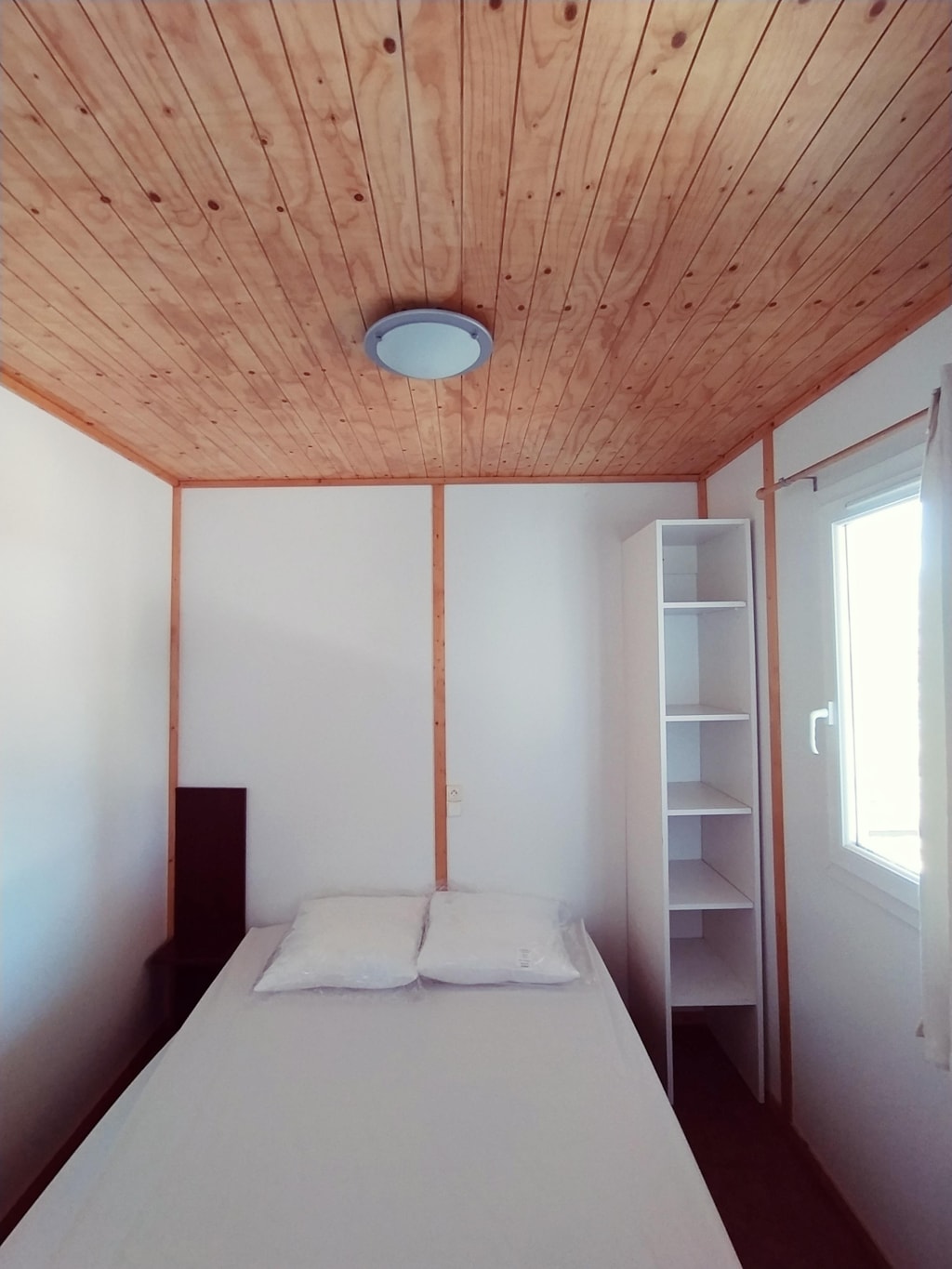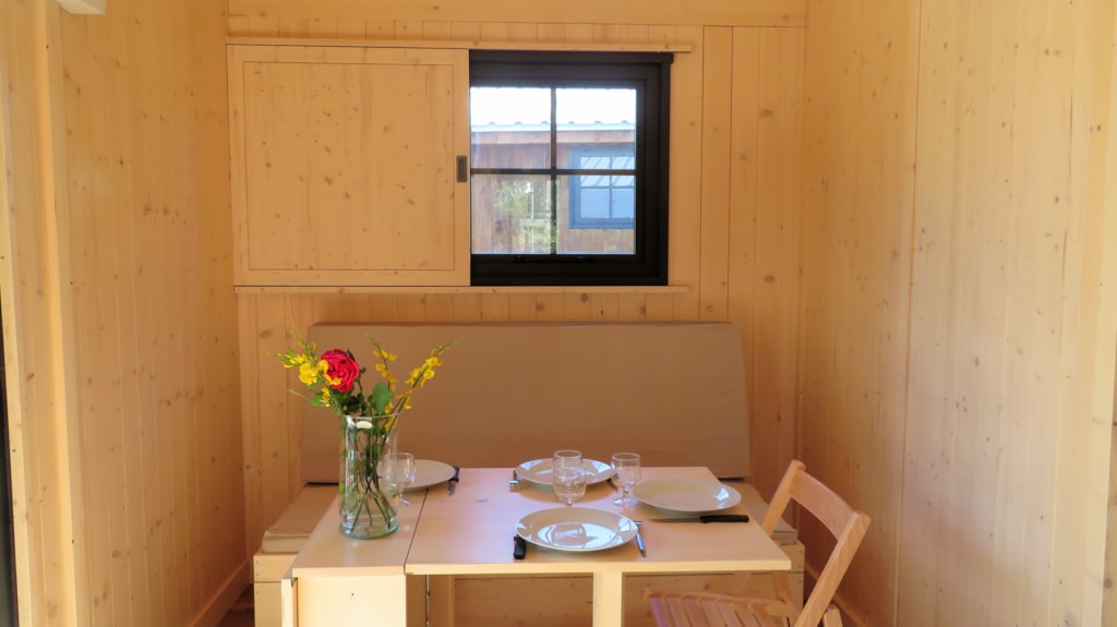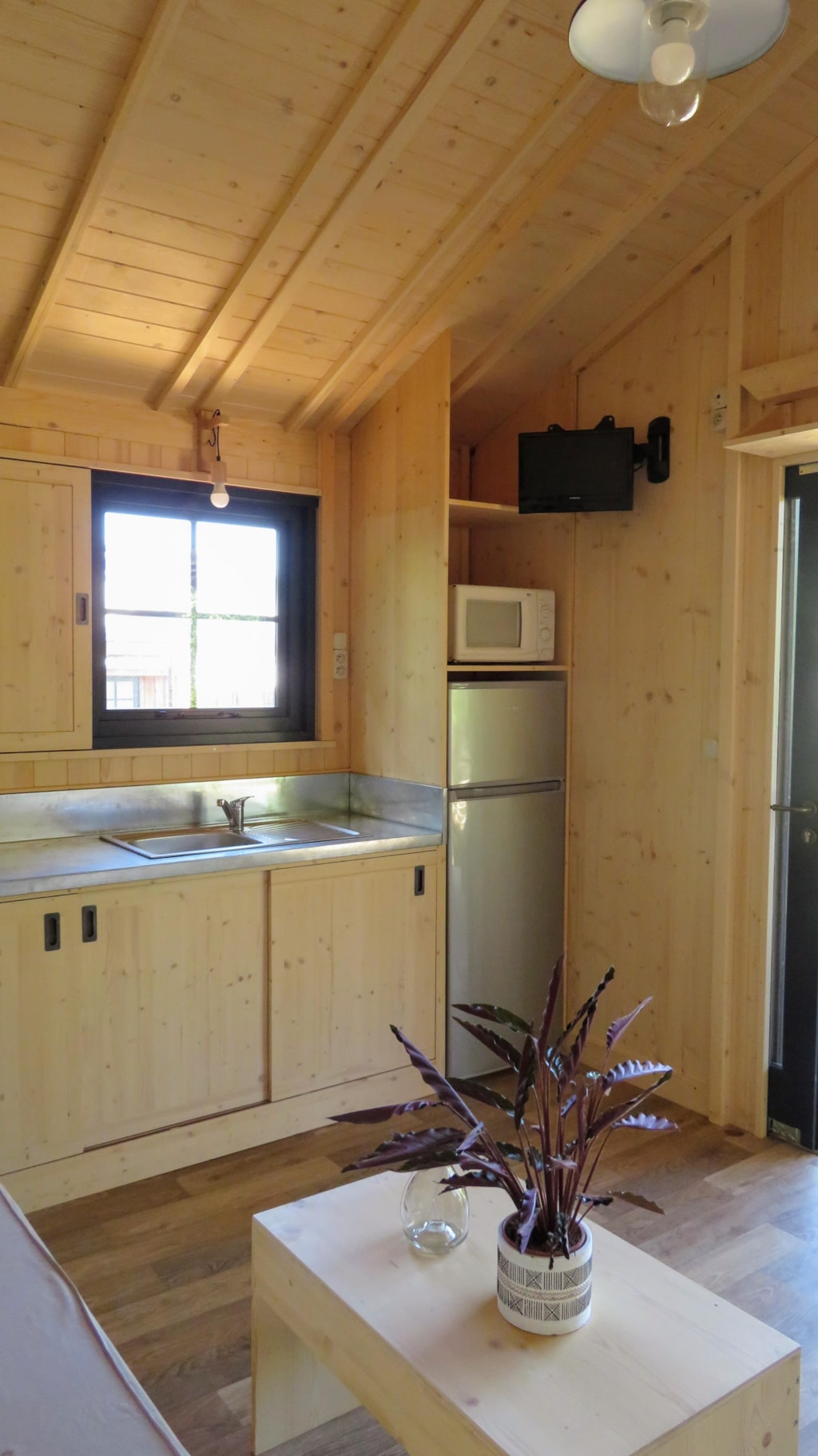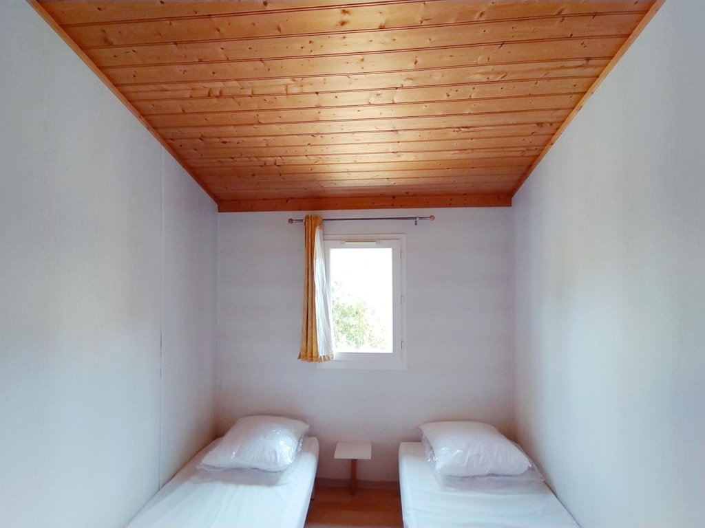 Die Feroe Lodge bietet Platz für bis zu 4 Personen. Es gibt 1 Schlafzimmer mit einem Doppelbett (160 x 200) und ein Doppelschlafsofa (160 x 200) im Wohnzimmer. Ideal für eine Familie oder eine Gruppe von Freunden. Vollständig ausgestattete Lodge. Essbereich, Küche mit Mikrowelle, Cerankochfeld, Kühl-/Gefrierschrank, Wasserkocher, Toaster und Filterkaffeemaschine. Fernseher und umkehrbare Klimaanlage. Bettdecken und Kopfkissen werden bereitgestellt. 1 Badezimmer mit Dusche und WC. Überdachte Terrasse von 12m2 mit Picknicktisch