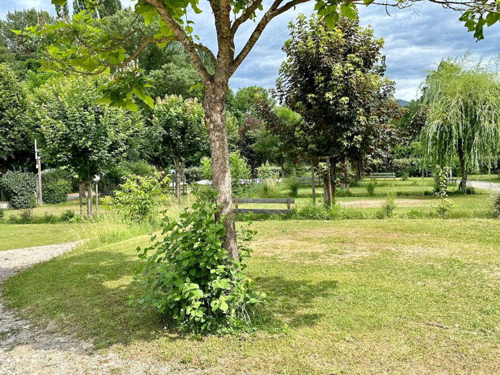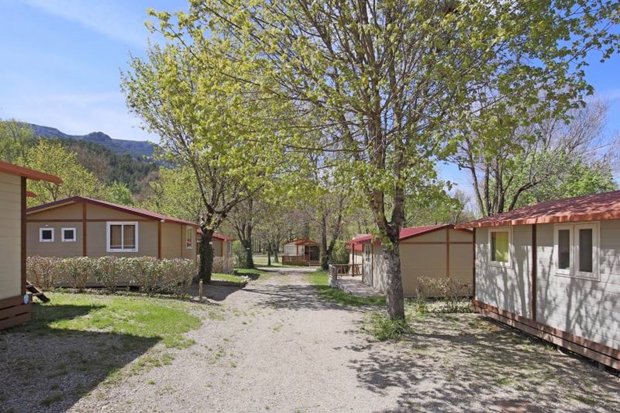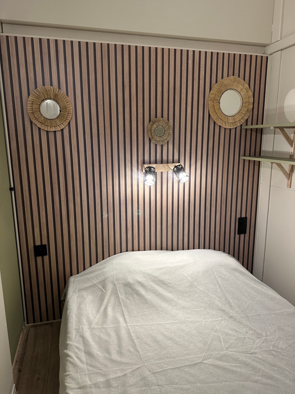Chalet Némo PMR (2 personnes) de 20 m2 avec terrasse couverte de 8 m², adapté aux personnes à mobilité réduite ou pour couple, comprenant un séjour-cuisine, salle de bain avec WC et 1 chambre avec lit 2 personnes.