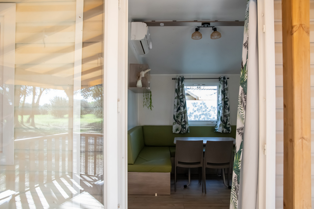 Mobil-home avec cuisine équipée et lave-vaisselle, salon + 2 chambres (une lit double 160x200 et une à deux lits simples 80x190) + salle de bain et WC séparés + terrasse couverte 15m² + climatisation