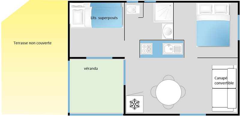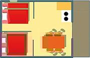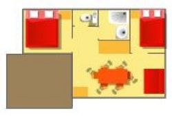 Es bietet eine halbschattige Terrasse, ein Wohnzimmer/Küche, 2 Schlafzimmer und ein komfortables Badezimmer.
