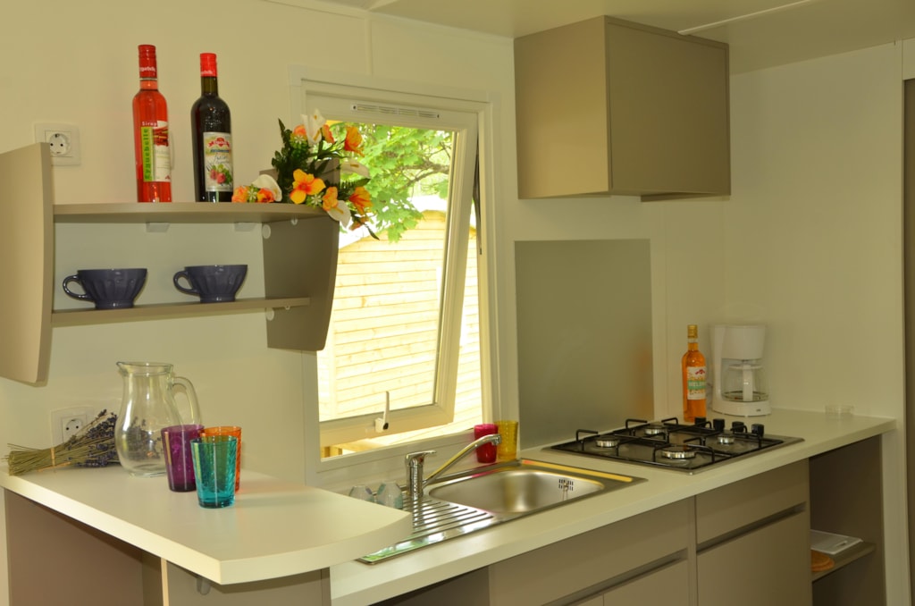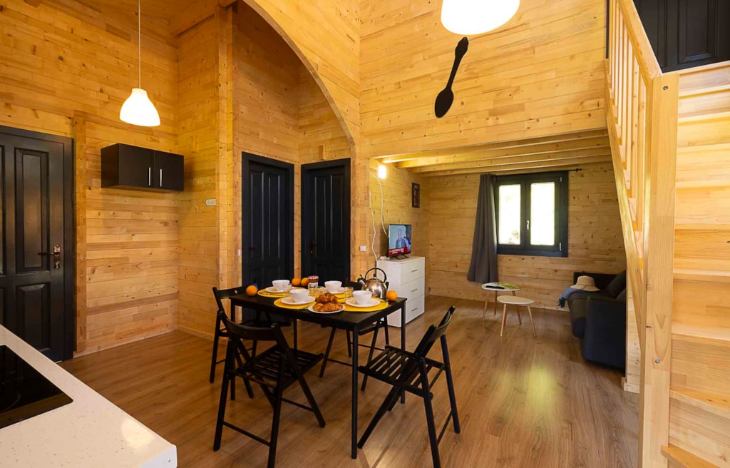 Der Küchenbereich ist mit einem Kühlschrank, einem 2-Flammen-Gasherd und komplettem Geschirr ausgestattet. Die Terrasse ist mit einem hölzernen Picknicktisch ausgestattet.