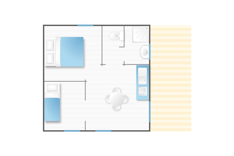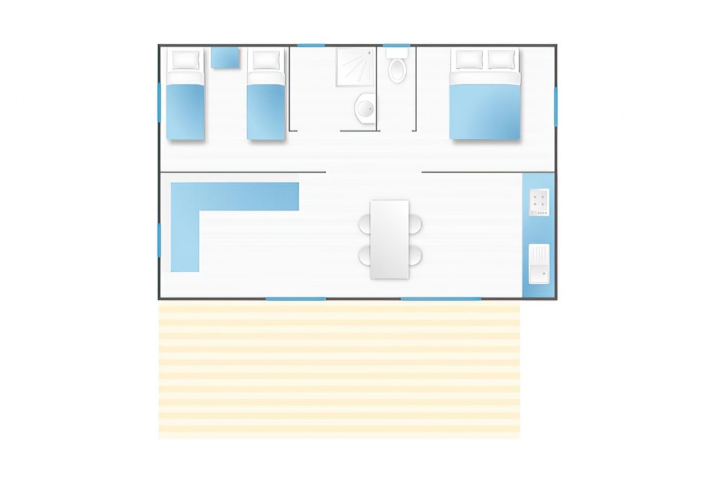 Unsere Coco Sweet sind außergewöhnliche Campingunterkünfte mit Glamping-Atmosphäre. Bedeckt eine Fläche von 16m2 plus einer kleinen überdachten Terrasse mit Gartentisch und Stuhl. Sie bieten Platz für bis zu 4 Personen. Ein Küchenbereich (ohne Wasser) ist mit Tisch und Hocker, Mikrowelle, 2 Gasbrennern und Geschirr ausgestattet. Ein Schlafbereich mit einem Doppelbett 140x190 und ein Schlafbereich mit 2 Einzelbetten 70x190, die als Sofa dienen, wenn Sie nur 2 Personen sind. Bettdecken und Kissen 60x60 sowie Bettlaken sind vorhanden. Bringen Sie Ihre Bettwäsche mit oder mieten Sie diese optional auf Anfrage. Im Kokos gibt es weder Wasser noch Toilette: In der Nähe befindet sich ein Brunnen und in der Nähe befinden sich die komfortablen Gemeinschaftstoiletten.