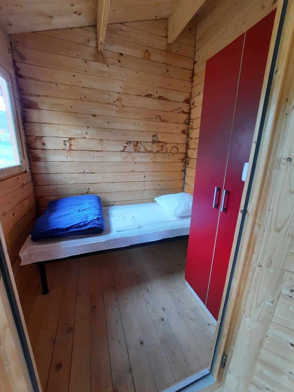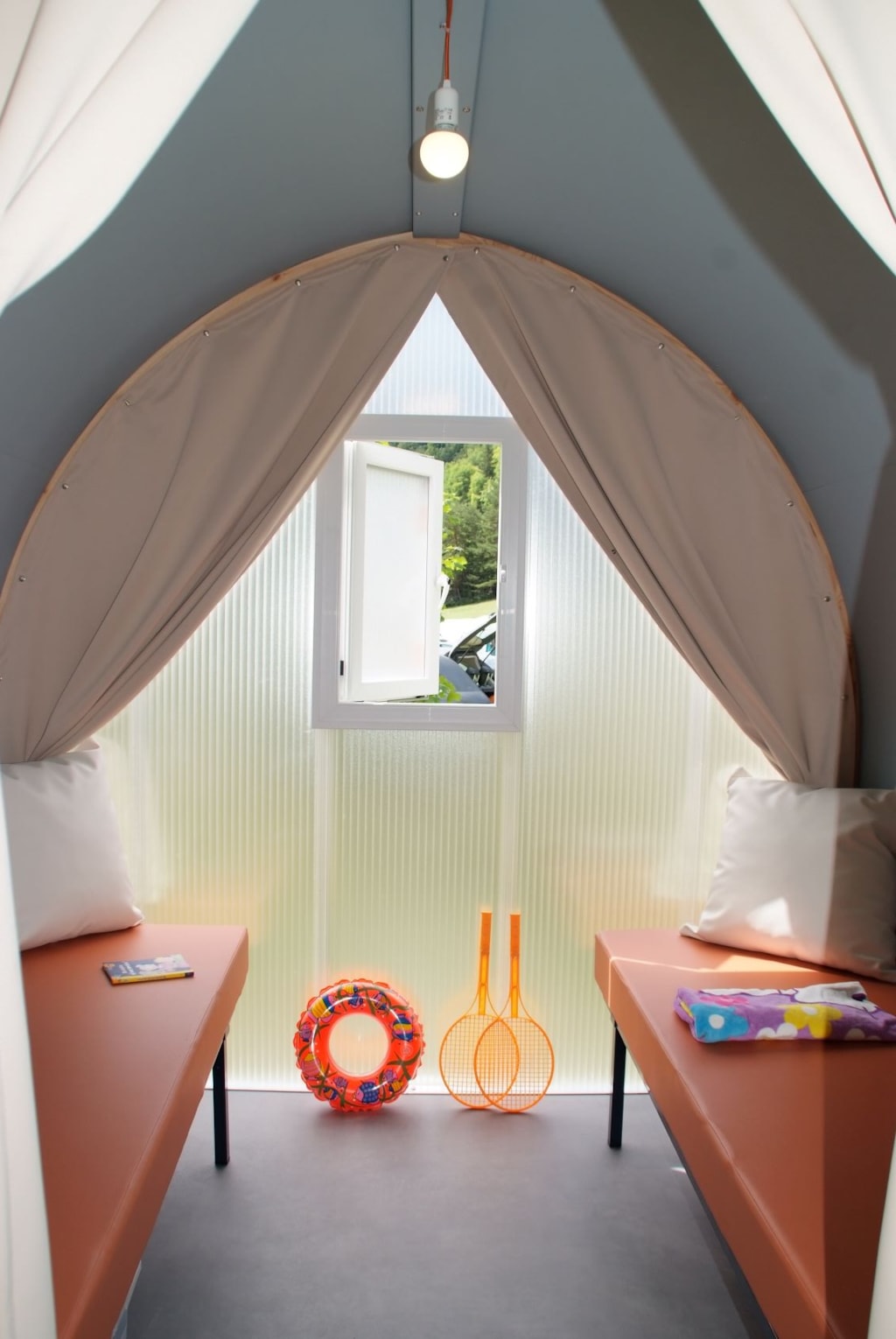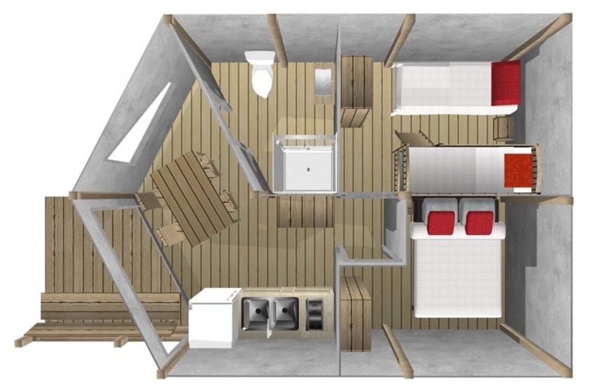 Das Rando Lodge-Zelt ist eine der ungewöhnlichen Campingunterkünfte mit Glamping-Atmosphäre. Aus Holz und Segeltuch gefertigt, bietet es eine kostengünstige und dennoch komfortable Lösung mit 2 Schlafzimmern für 5 Personen, Wohn-/Küchenbereich und einem kleinen halbüberdachten Bereich mit Picknicktisch. Ein Küchenbereich (ohne Wasser) ist mit einem Tisch, Hockern, einer Mikrowelle, 2 Gasbrennern und Geschirr ausgestattet. Ein Schlafbereich mit einem Doppelbett 140x190 und ein Schlafbereich mit 3 Einzelbetten 80x190 inklusive 1 Etagenbett. Bettdecken und Kissen 60x60 sowie Bettlaken sind vorhanden. Bringen Sie Ihre Bettwäsche mit oder mieten Sie diese optional auf Anfrage. Es gibt weder Wasser noch Toiletten: In der Nähe befinden sich ein Brunnen und komfortable Gemeinschaftstoiletten.