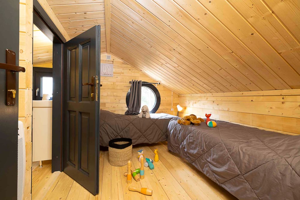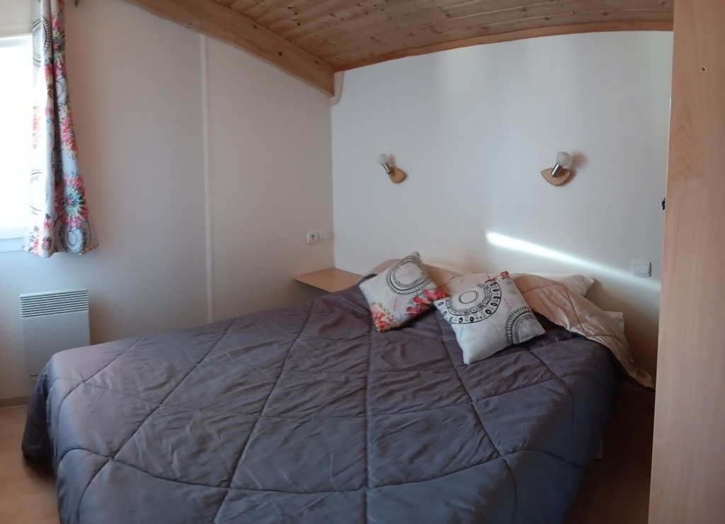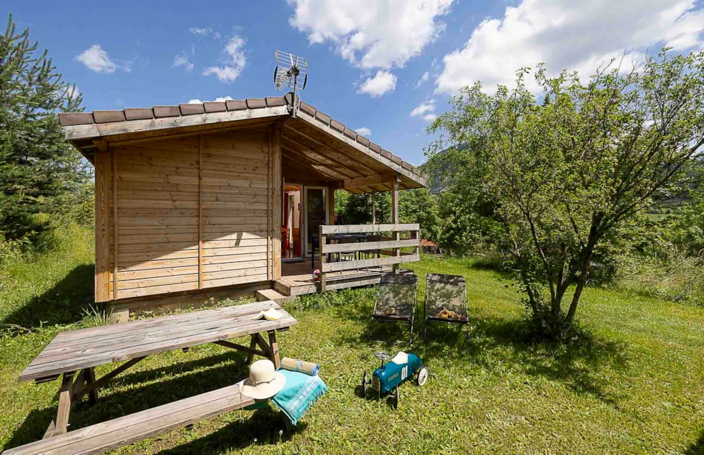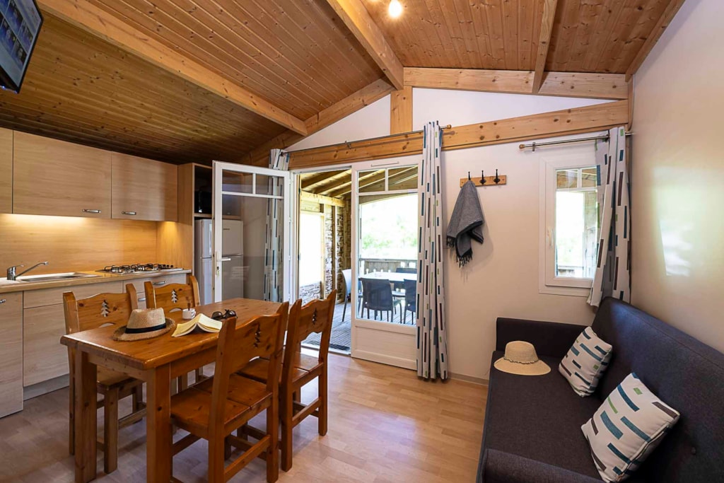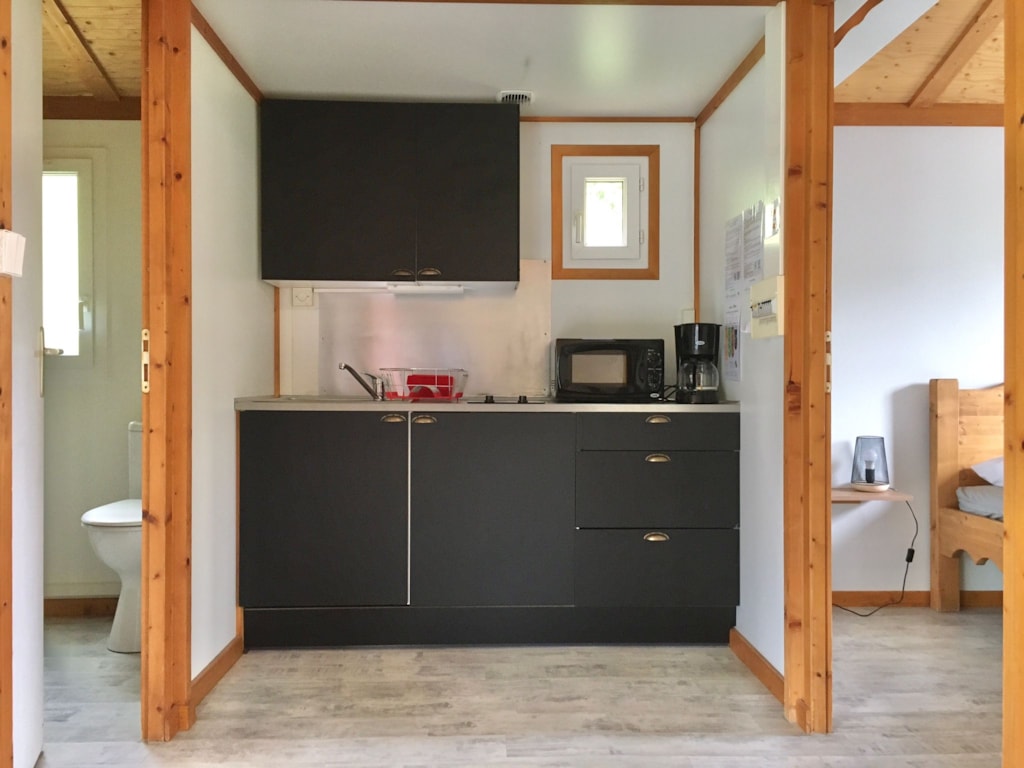 Kleines gemütliches Holzchalet mit 1 Schlafzimmer für ein Paar (140 x 190 Betten) und einem kleinen Schlafzimmer, das als Wohnzimmer dient, einem Wohnzimmer mit ausgestattetem Küchenbereich.