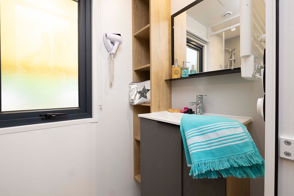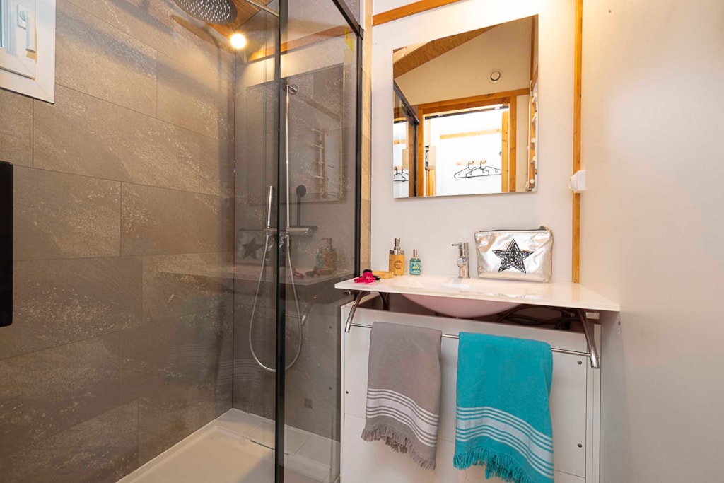 Sie ermöglichen Ihnen auch den Zugang zu den drei Toilettenblöcken des Campingplatzes, von denen einer über Familienbäder und ein Babybad verfügt. In allen Duschen können Sie die Wassertemperatur regulieren und Toilettenpapier ist in jeder Kabine vorhanden.