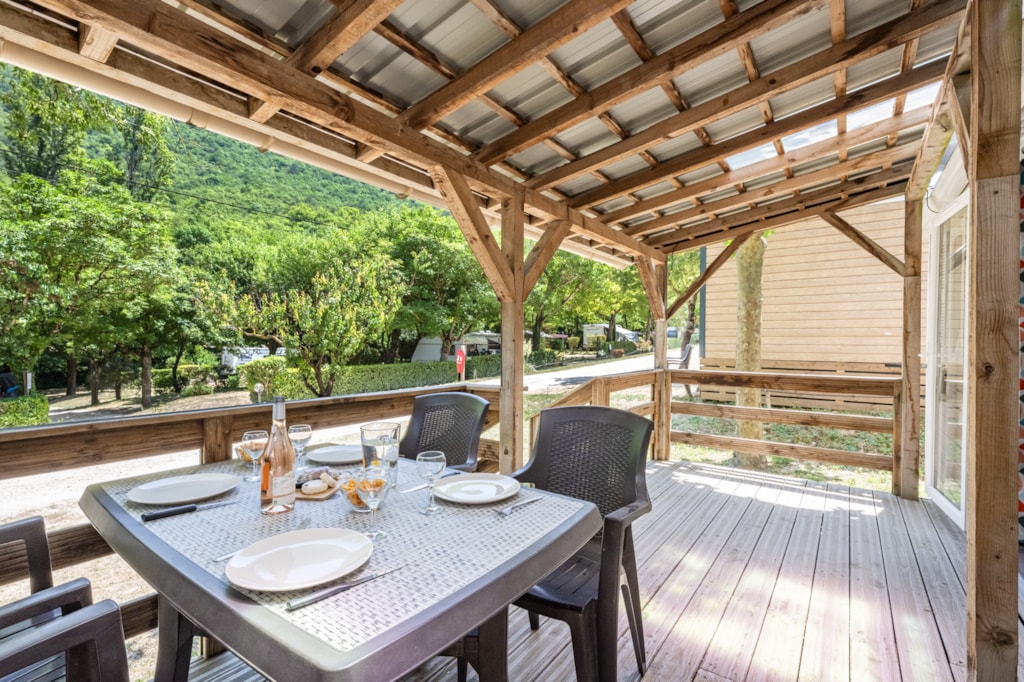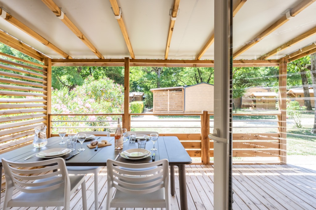 Ausstattung, komfortabel und erweitert durch eine überdachte Terrasse mit Gartenmöbeln.