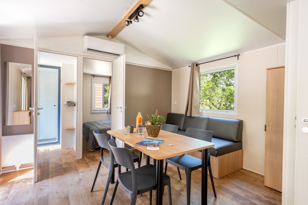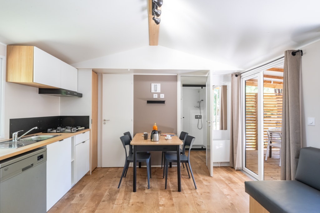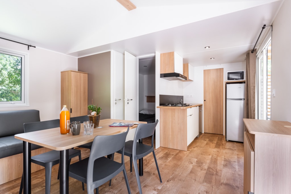 Entdecken Sie unser klimatisiertes COMFORT-Mobilheim, ideal für Familien- oder Freundesurlaube. Dieses geräumige Modell bietet Platz für bis zu 4 Personen und verfügt über 2 komfortable Schlafzimmer. Die Küche ist komplett ausgestattet, einschließlich einer Geschirrspülmaschine, um Ihren Aufenthalt noch angenehmer zu gestalten.