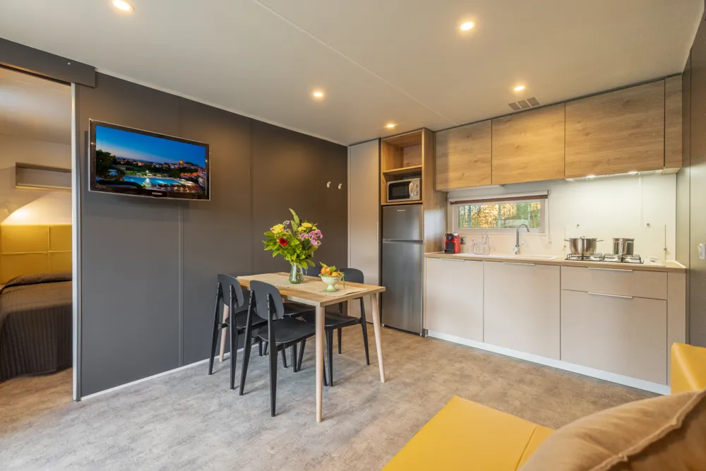 Das Mobilheim bietet eine neue Art zu leben, ein Erlebnis, das sich vom gewöhnlichen Alltag unterscheidet, aber mit allen Annehmlichkeiten, an die man gewöhnt ist, eingebettet in eine natürliche, gesunde, entspannende und geschützte Umgebung. Mobilheime sind die ideale Wahl für Familien, die einen komfortablen Urlaub in engem Kontakt mit der Natur verbringen möchten. Hergestellt nach hohen technischen Standards, bieten sie großzügigen Innenraum (34 m²) und Außenbereich. Neben der großen Außenterrasse (21 m²) sind die Mobilheime ausgestattet mit: Warm- und Kaltwasser, zwei Badezimmern mit Dusche und Waschbecken, WC und Bidet, Klimaanlage sowie allen notwendigen Geräten für den Alltag (Kochfeld, Kühlschrank, Mikrowelle, Geschirr, Besteck, verschiedene Utensilien usw.), sowie