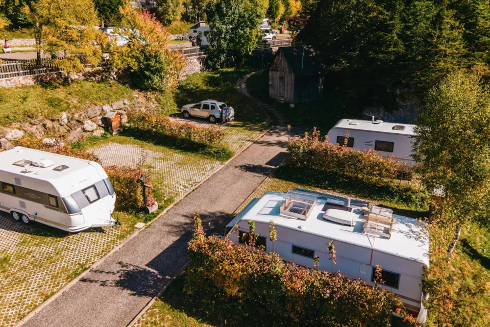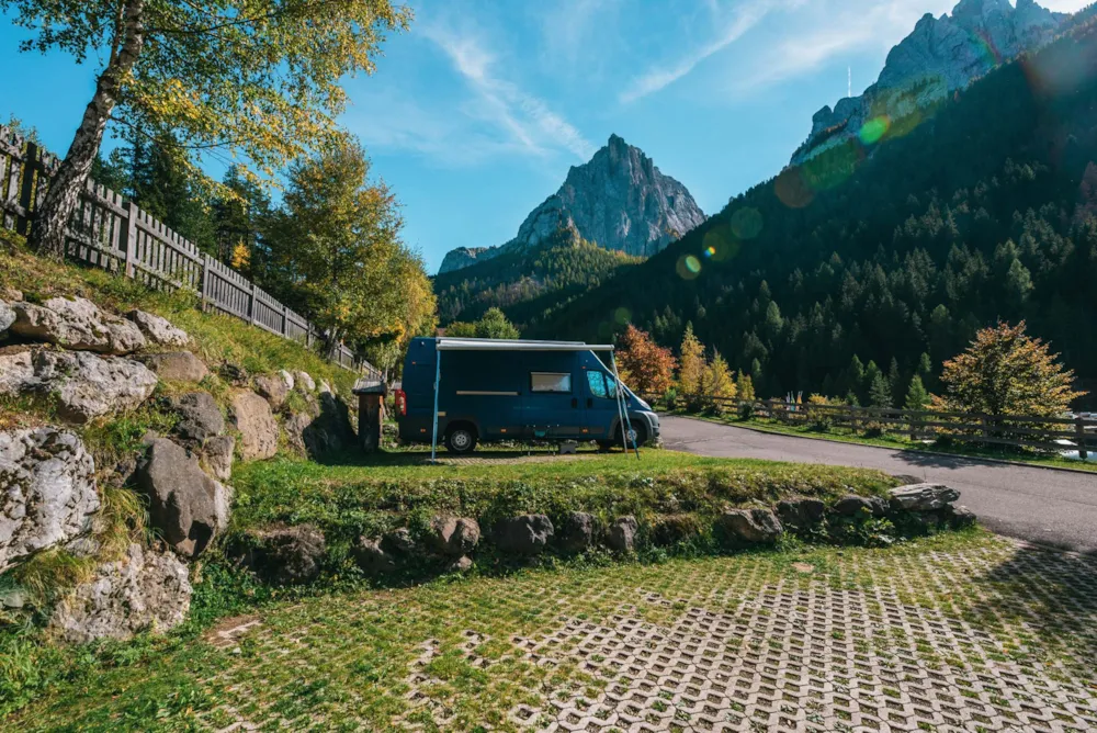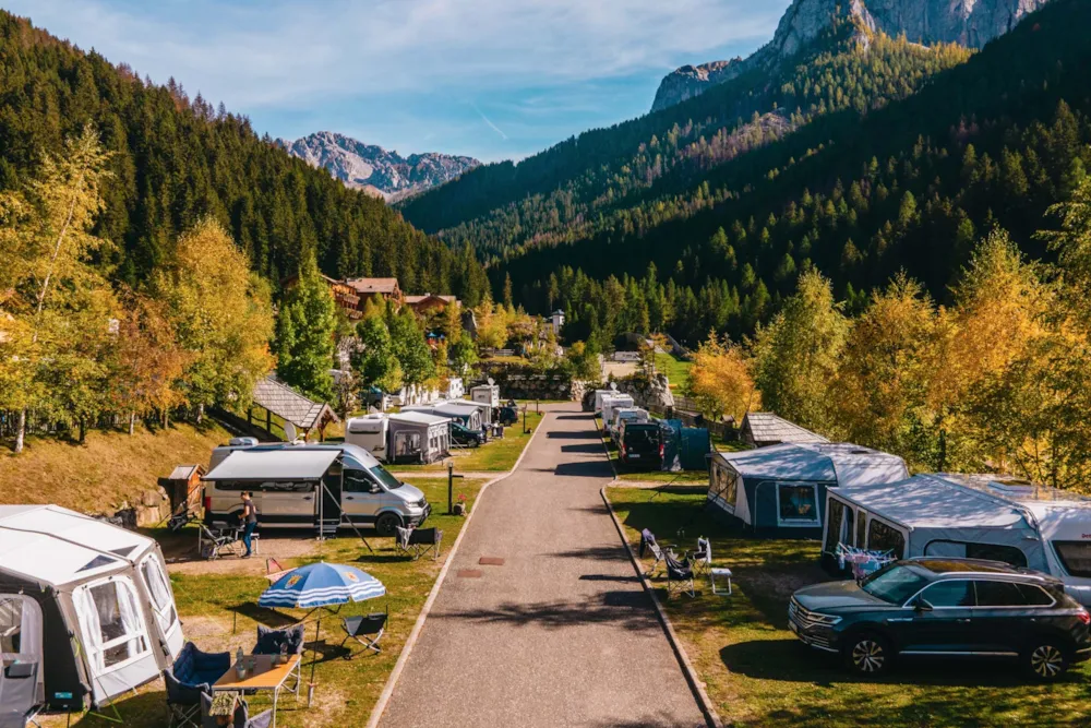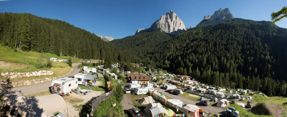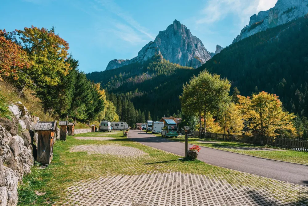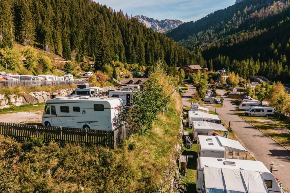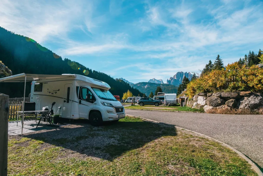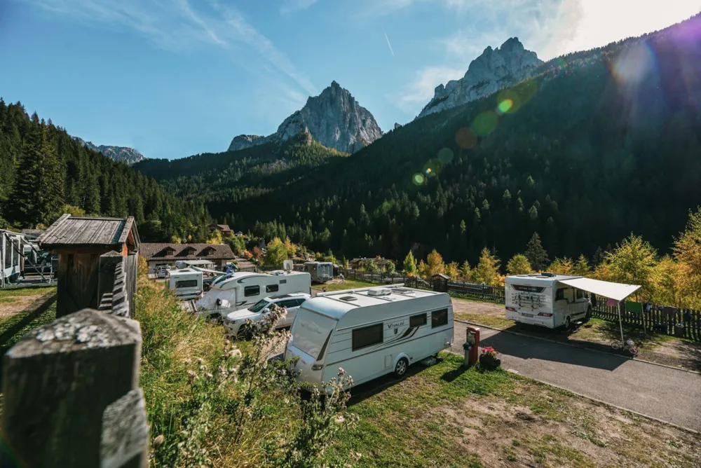 Stellplätze mit Panoramablick auf das UNESCO Weltnaturerbe Dolomiten in sehr sonniger Lage, mit einer Fläche bis zu 80 m2. Viele sind mit Grasgittersteinboden versehen, geeignet für Wohnmobile, Wohnwagen und Zelte.