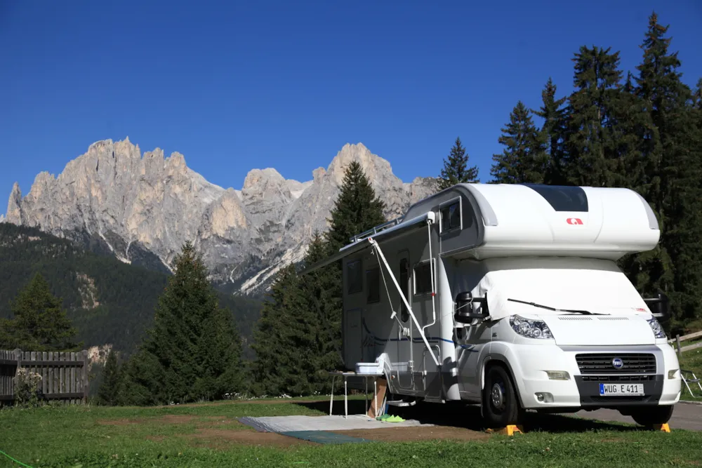Maxi Komfort Stellplatz mit Panoramablick auf die Dolomiten in sehr sonniger Lage, mit einer Fläche bis zu 120 m2. Einige sind mit Grasgittersteinboden versehen, geeignet für Wohnmobile, Wohnwagen und Familienzelte.