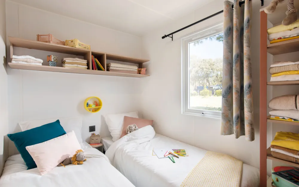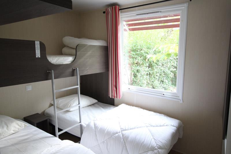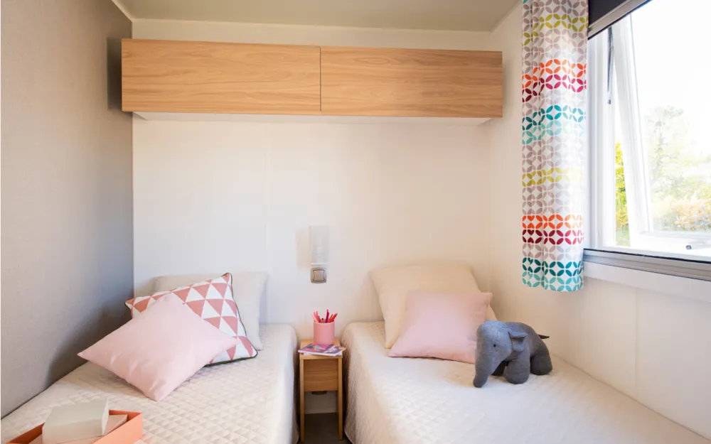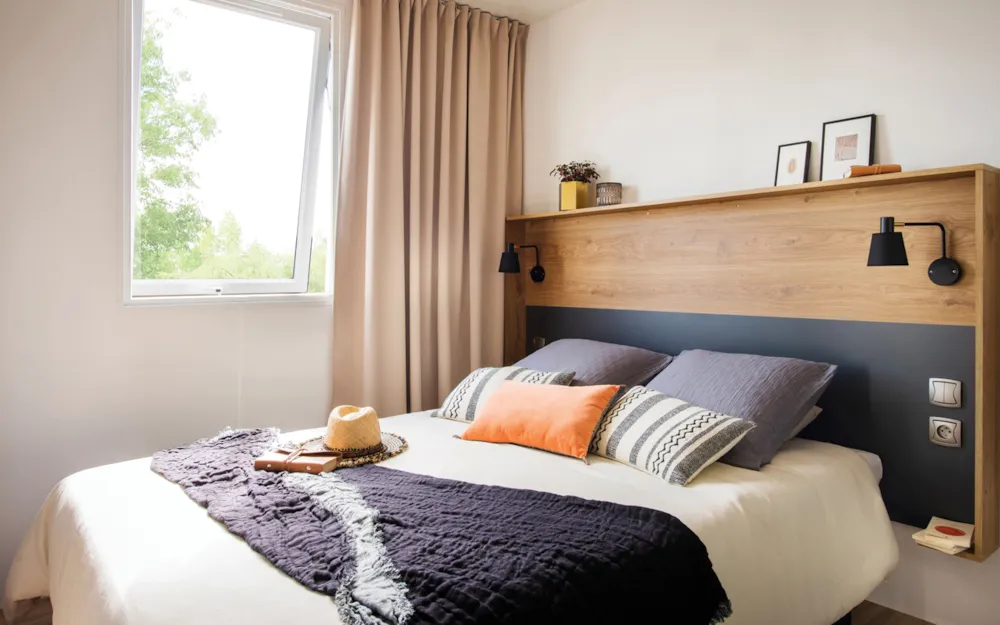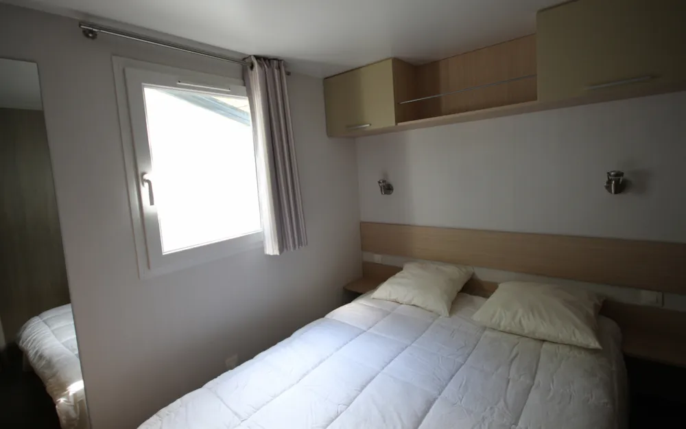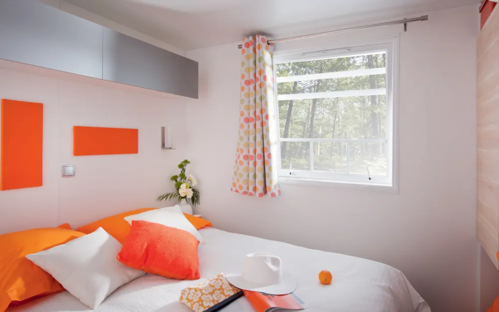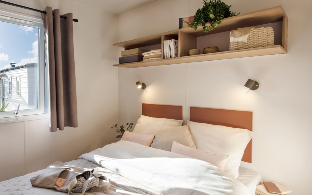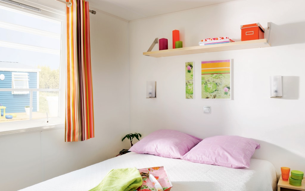 Die Mobilheime Cottage Evasion verfügen über 2 Schlafzimmer. Das Elternschlafzimmer umfasst ein großes Bett (160x200) und bietet Platz für ein Babybett. Diese Mobilheime befinden sich größtenteils in einem ruhigen Bereich des Campingplatzes.