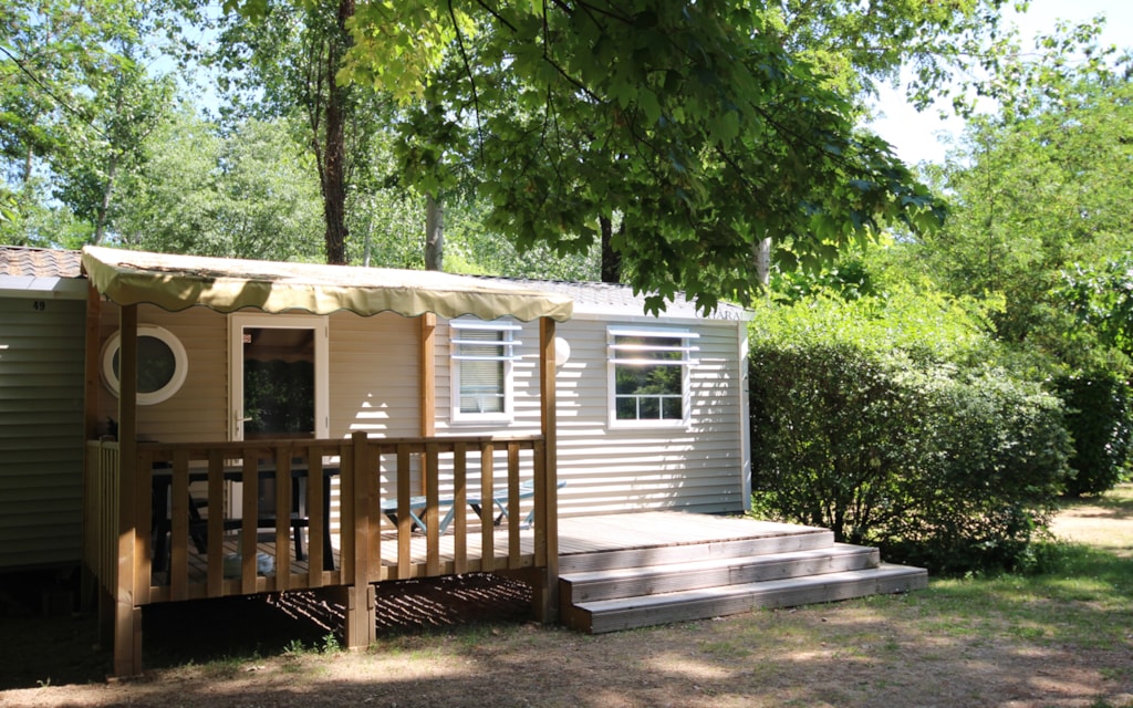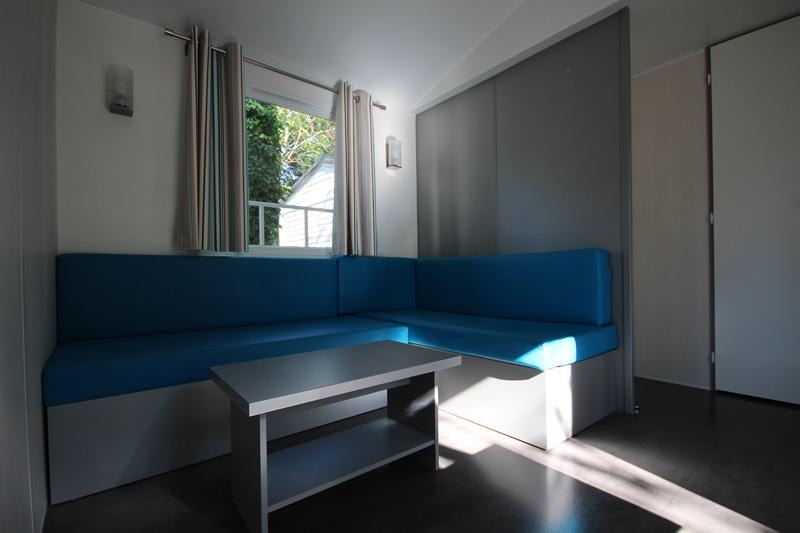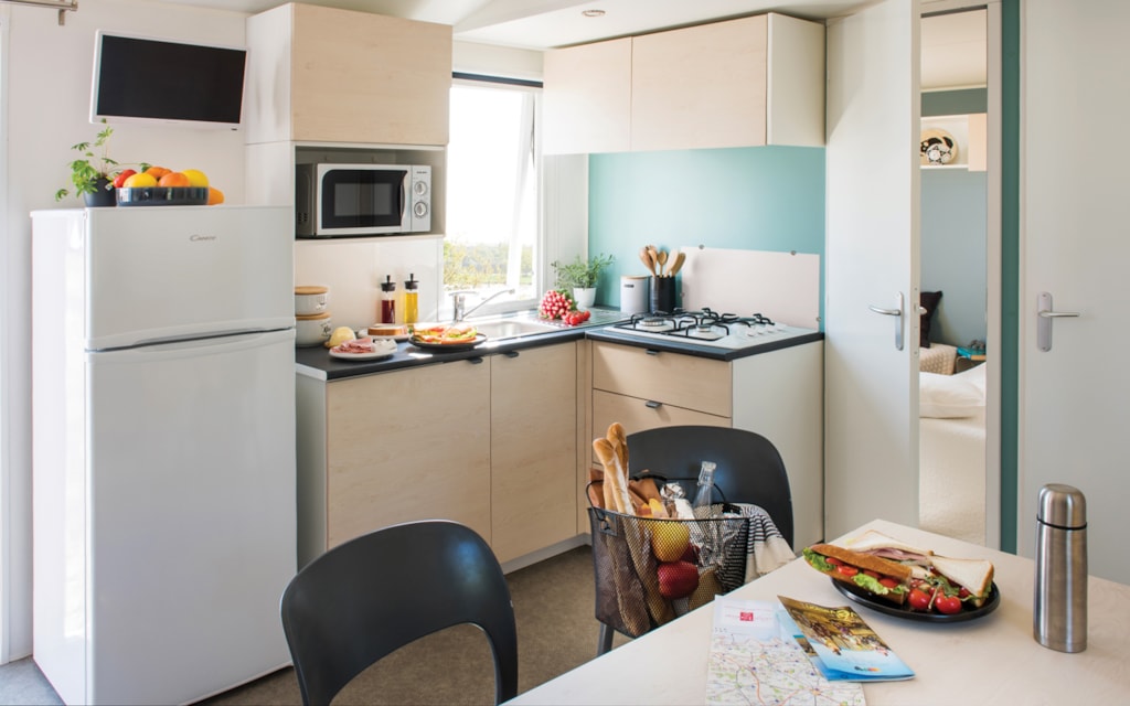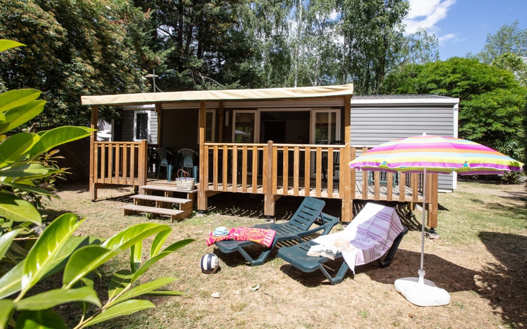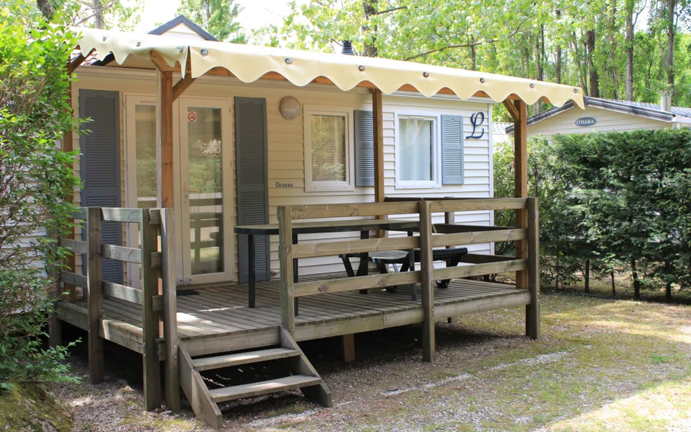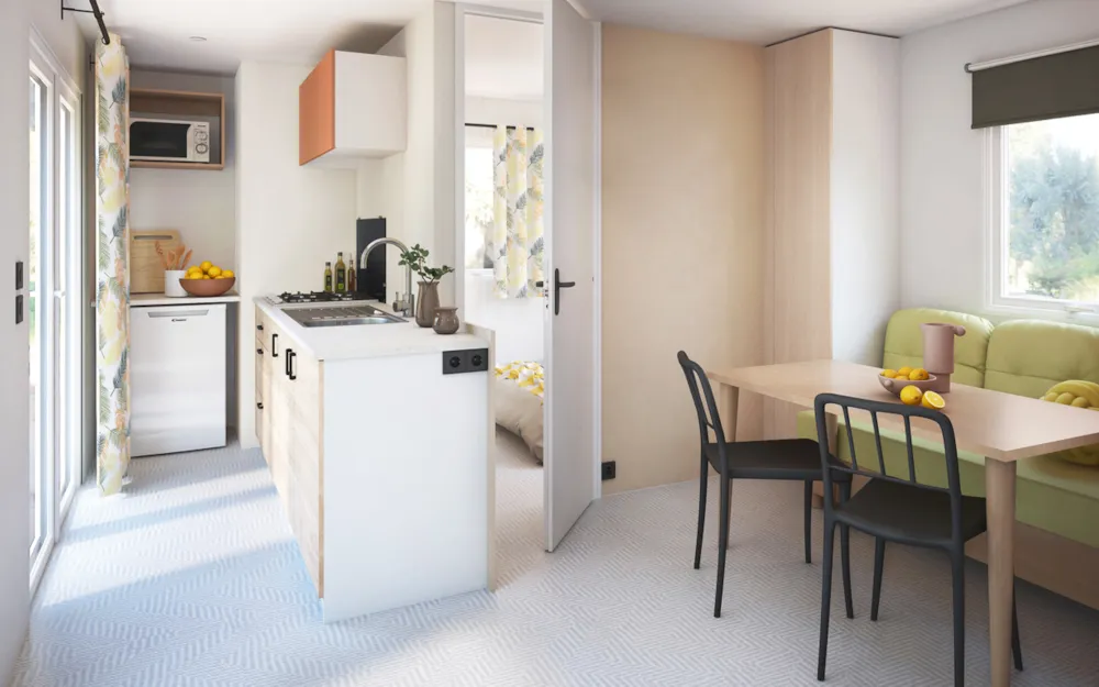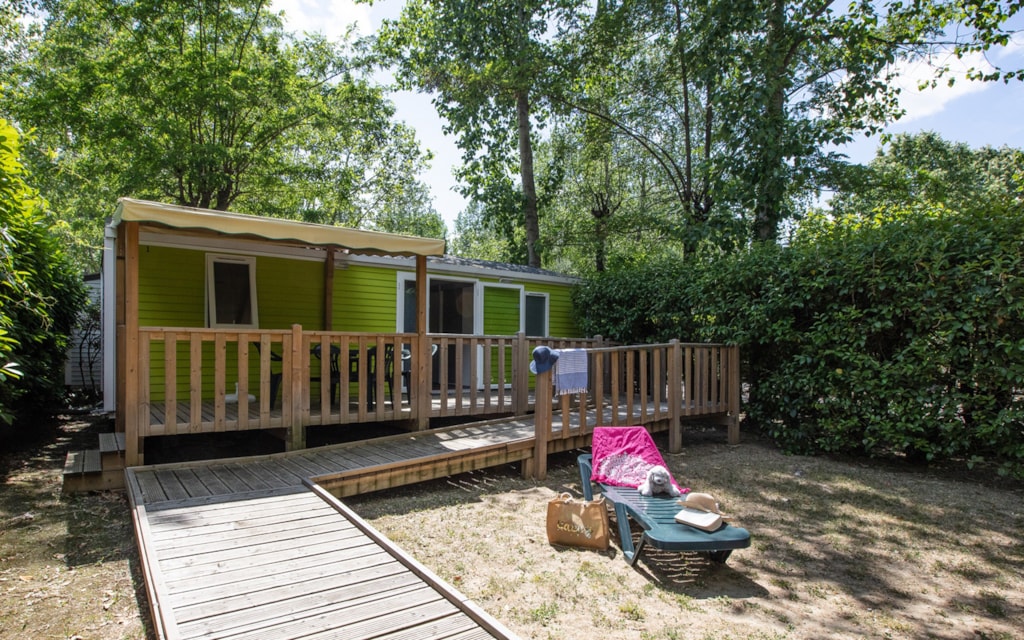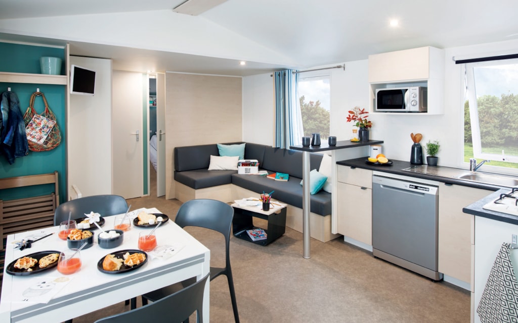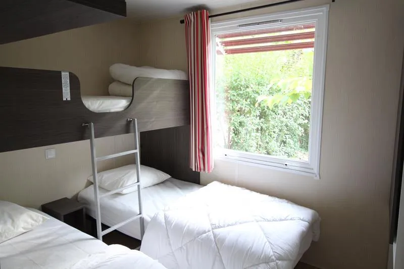 Die Mobilheime Cottage Evasion verfügen über 2 Schlafzimmer. Das Elternschlafzimmer umfasst ein großes Bett (160x200) und bietet Platz für ein Babybett. Diese Mobilheime befinden sich größtenteils in einem ruhigen Bereich des Campingplatzes.