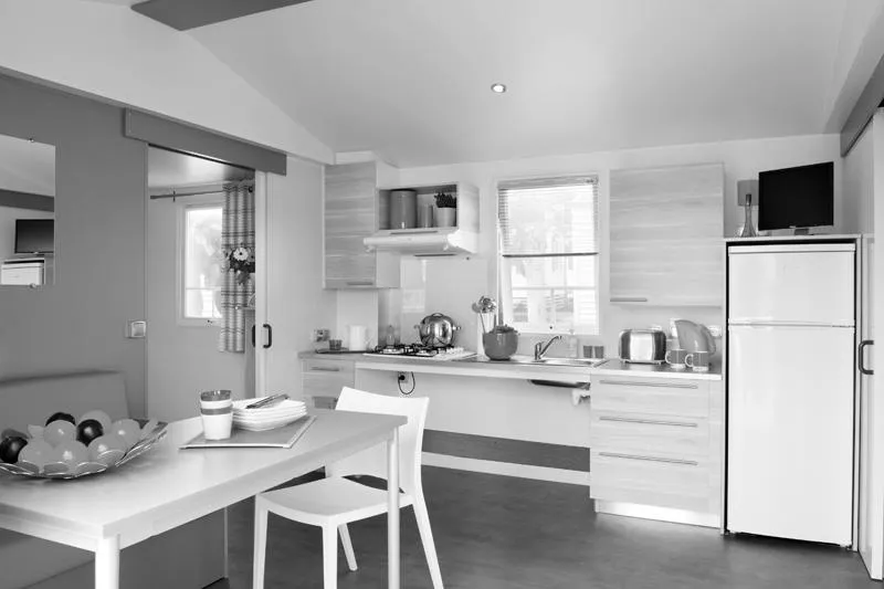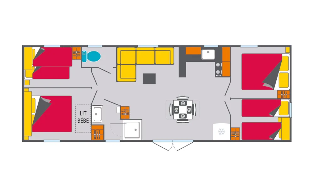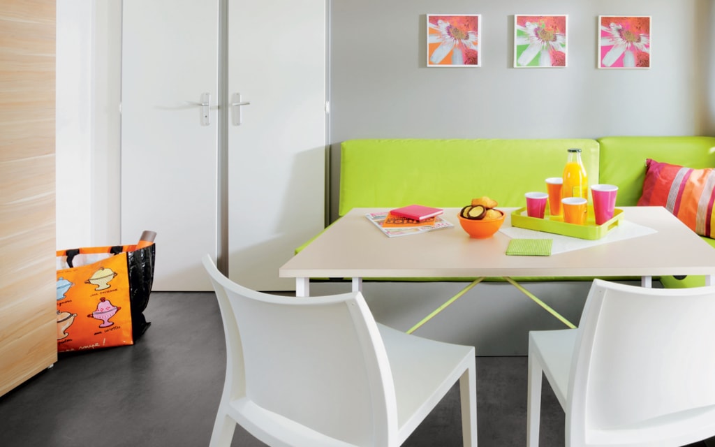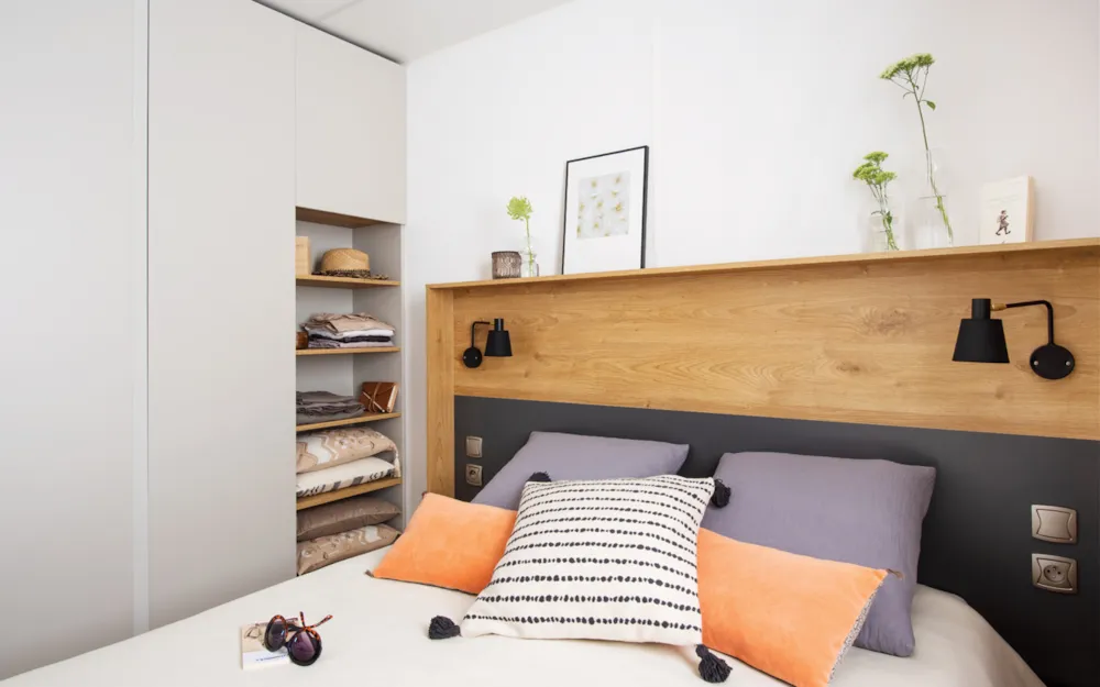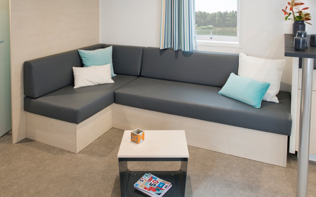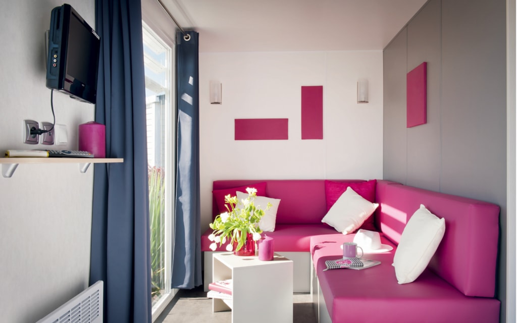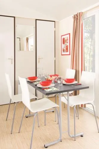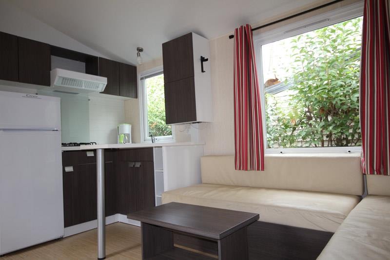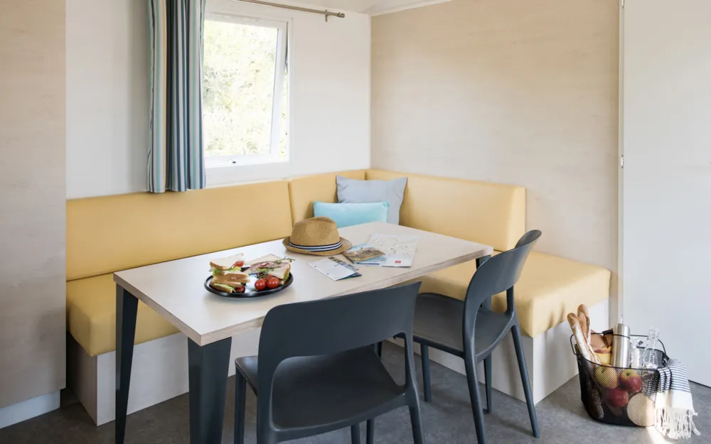 Die Mobilheime Cottage Evasion verfügen über 2 Schlafzimmer. Das Elternschlafzimmer umfasst ein großes Bett (160x200) und bietet Platz für ein Babybett. Diese Mobilheime befinden sich größtenteils in einem ruhigen Bereich des Campingplatzes.