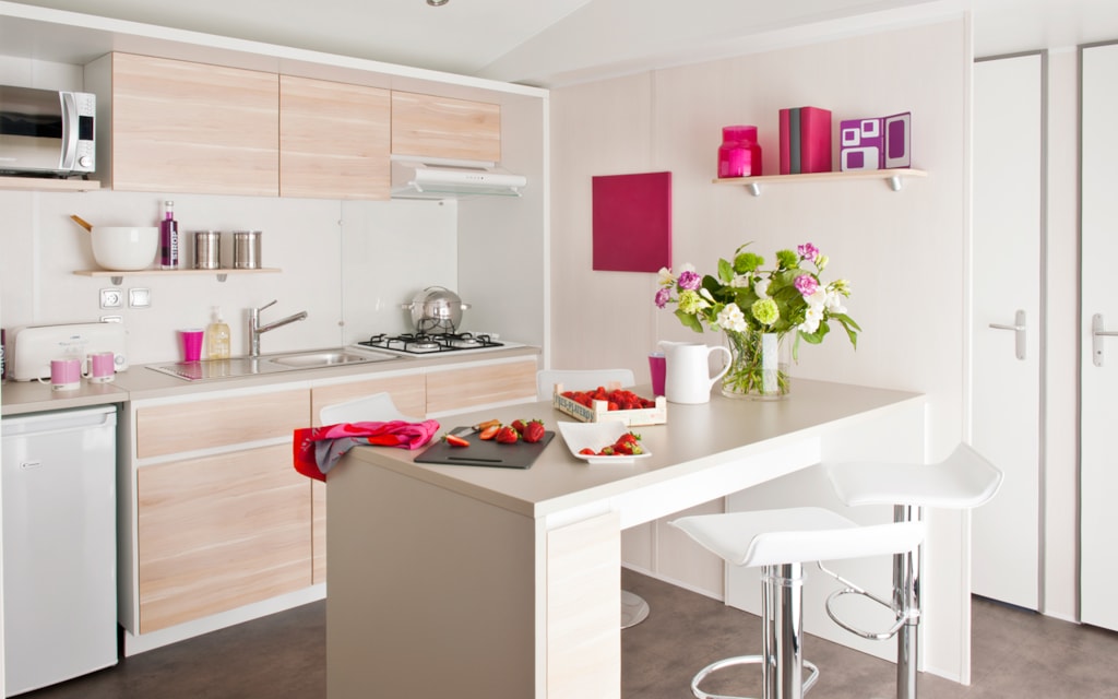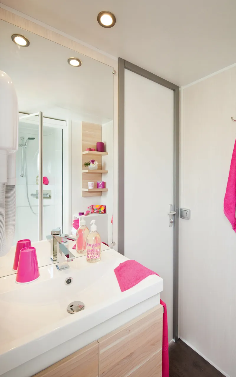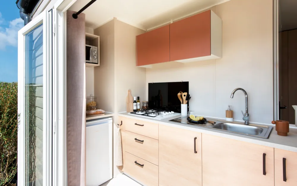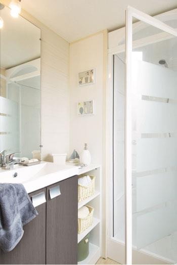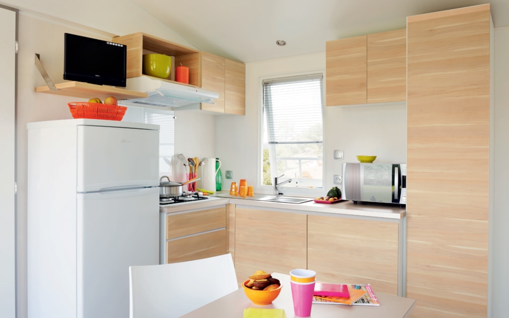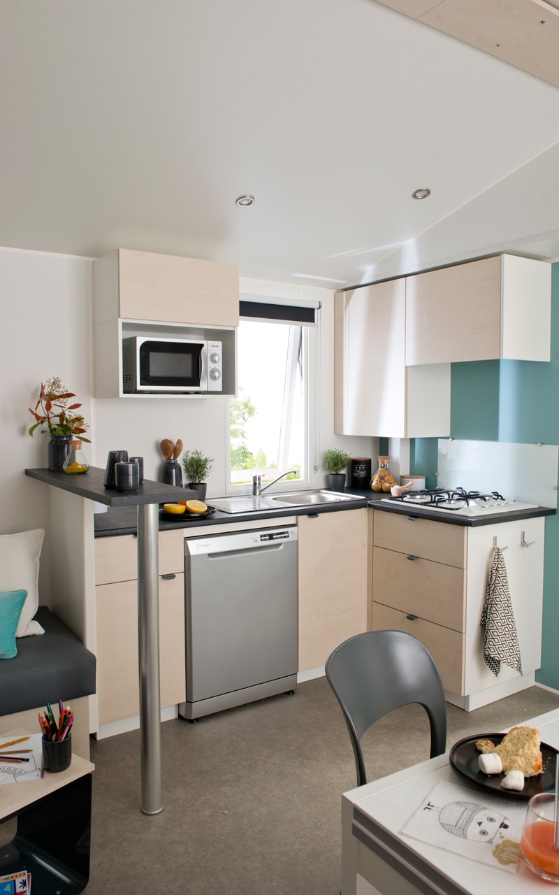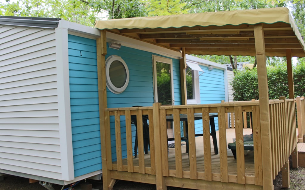 Die Mobilheime Cottage Evasion verfügen über 2 Schlafzimmer. Das Elternschlafzimmer umfasst ein großes Bett (160x200) und bietet Platz für ein Babybett. Diese Mobilheime befinden sich größtenteils in einem ruhigen Bereich des Campingplatzes.