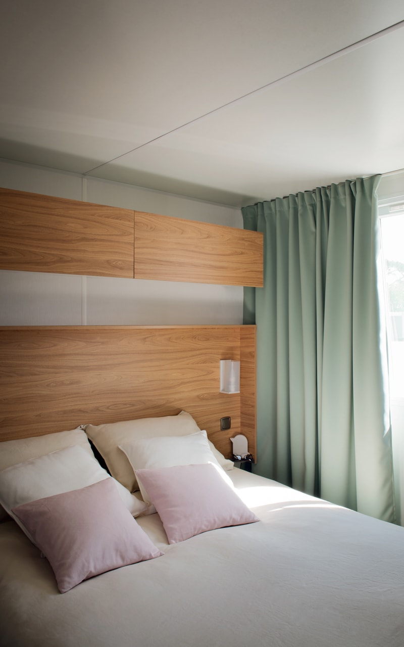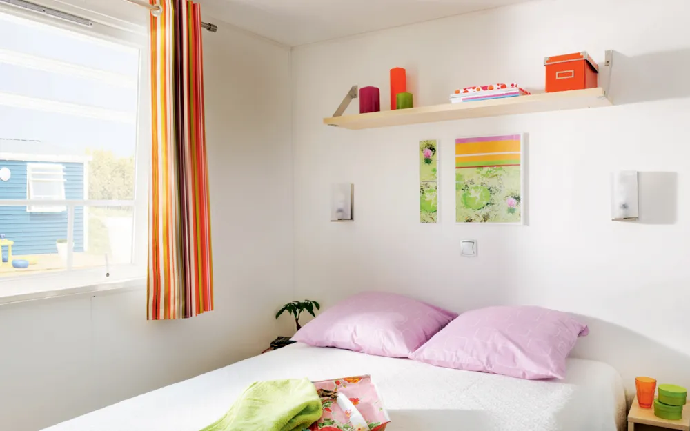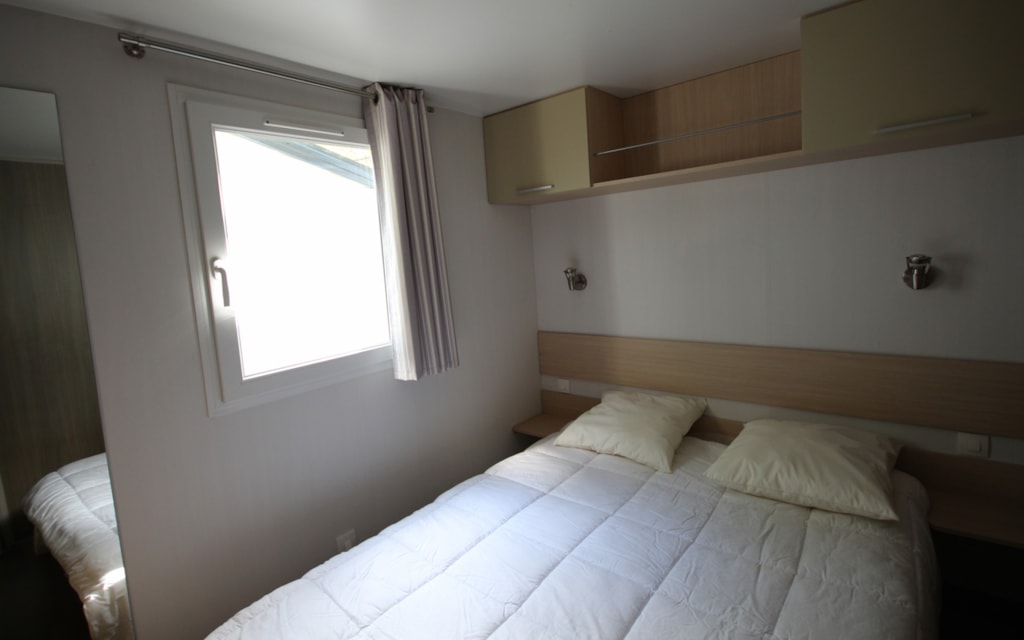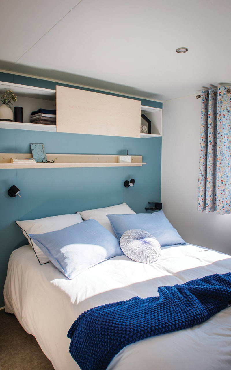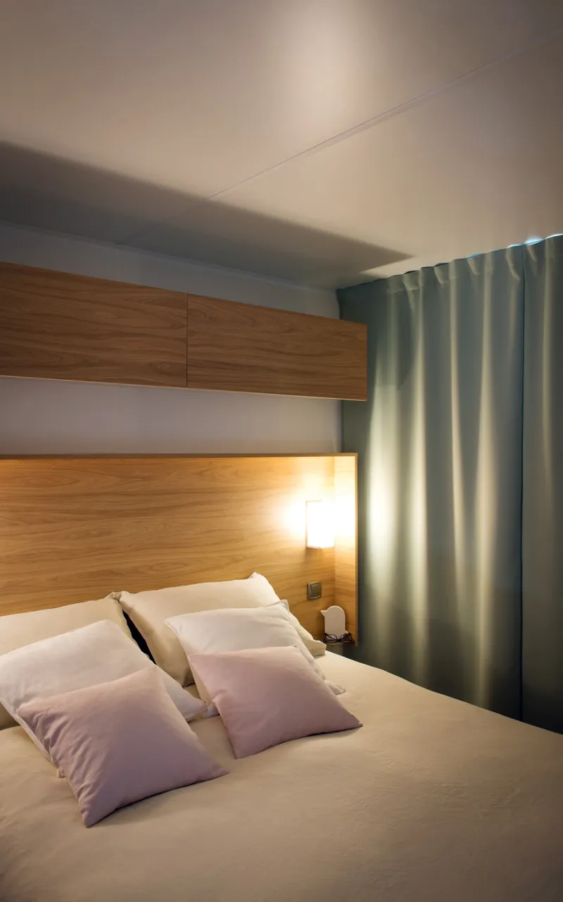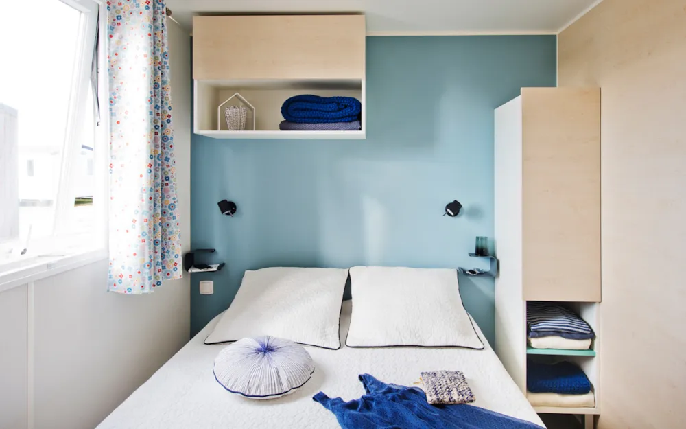 Die Mobilheime Cottage Riviera verfügen über 2 Schlafzimmer. Das Elternschlafzimmer umfasst ein großes Bett (160x200) und bietet Platz für ein Babybett. Diese Mobilheime befinden sich in einem ruhigen Bereich des Campingplatzes.