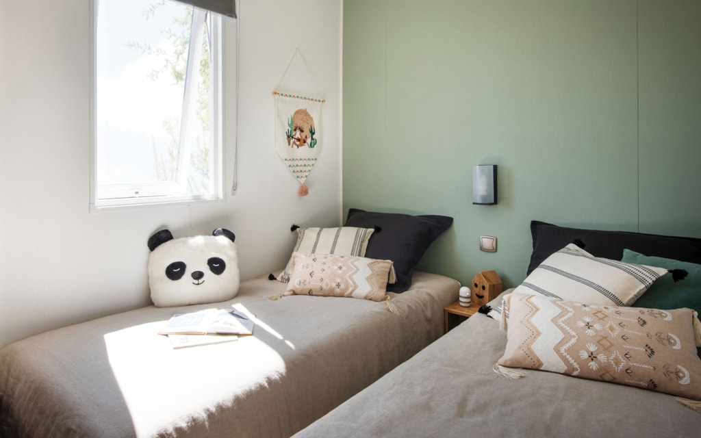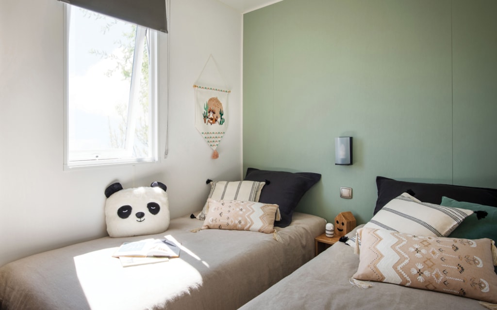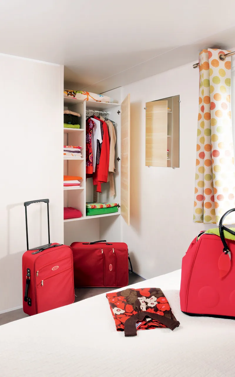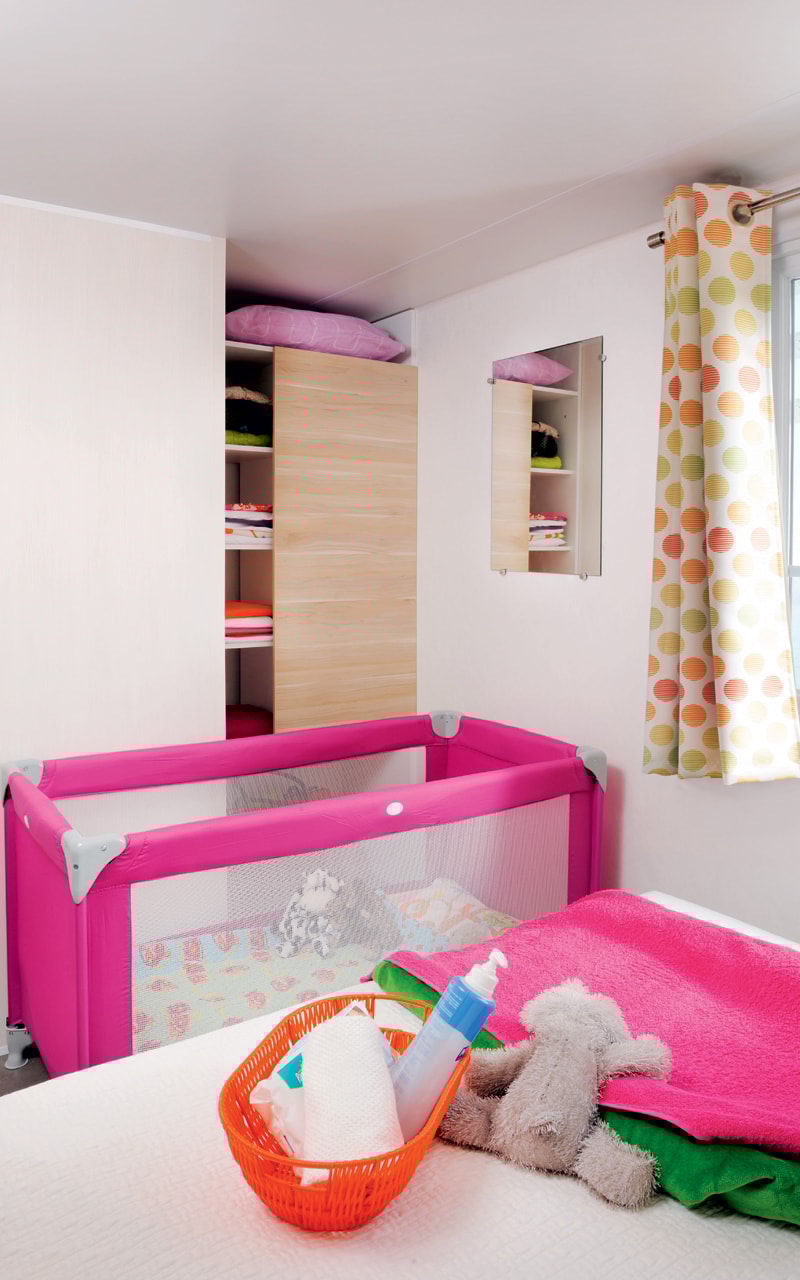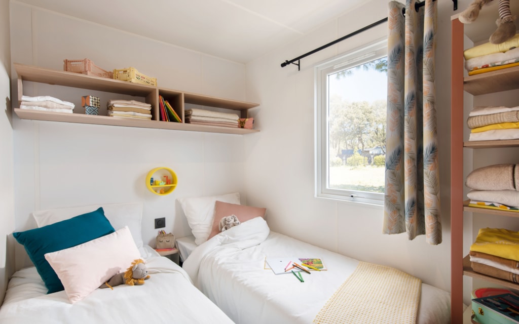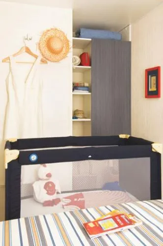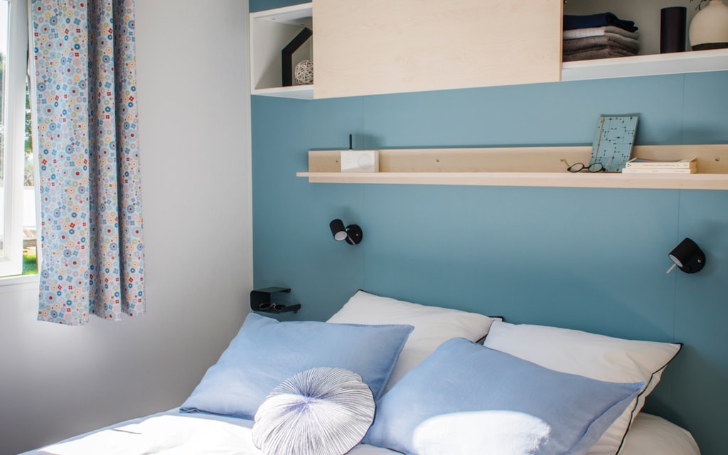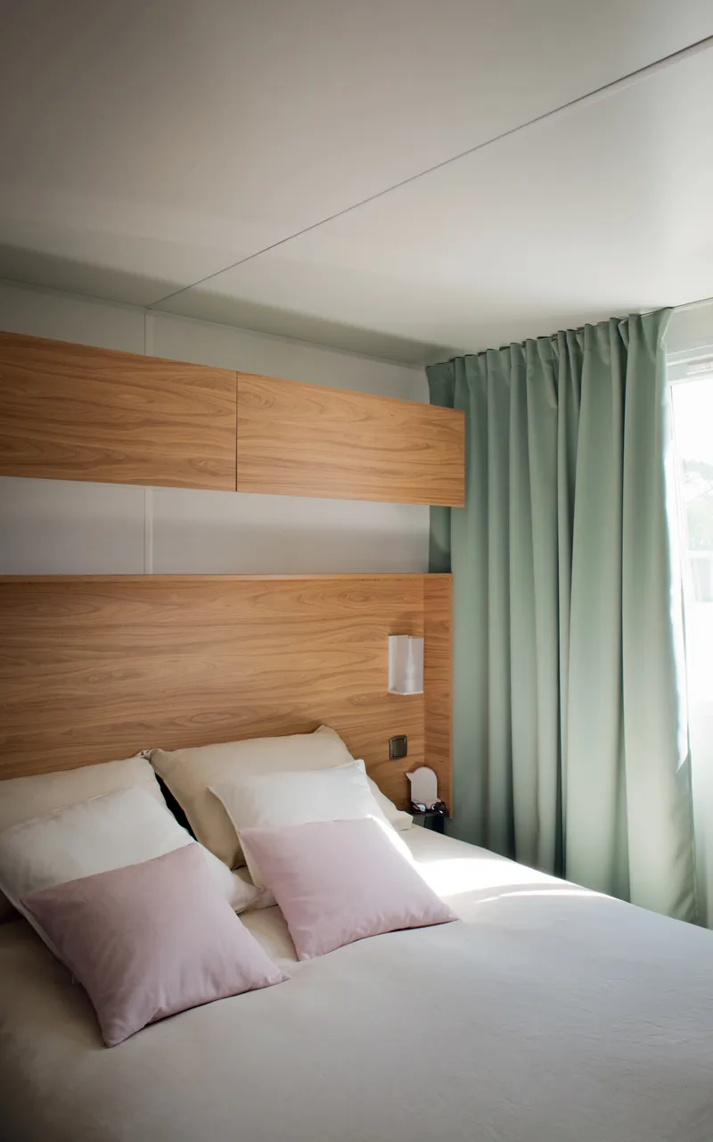 Die Mobilheime Cottage Riviera verfügen über 2 Schlafzimmer. Das Elternschlafzimmer umfasst ein großes Bett (160x200) und bietet Platz für ein Babybett. Diese Mobilheime befinden sich in einem ruhigen Bereich des Campingplatzes.