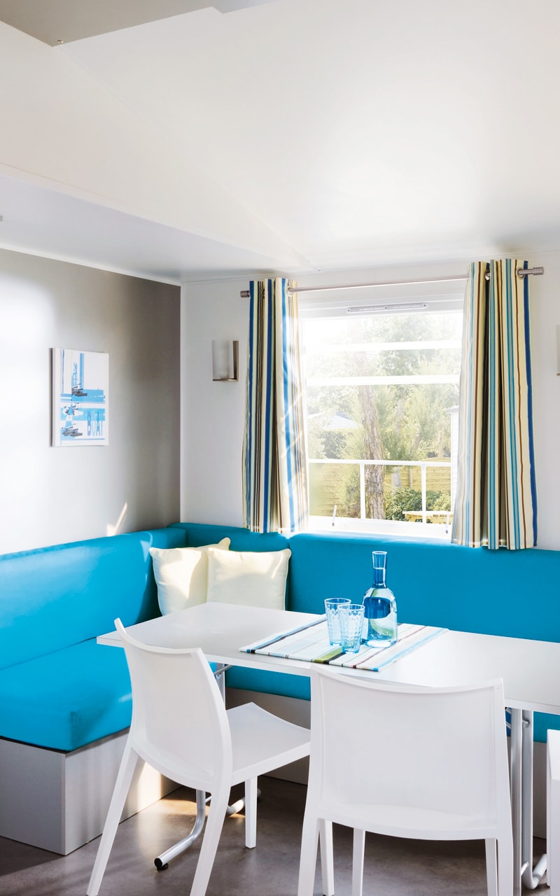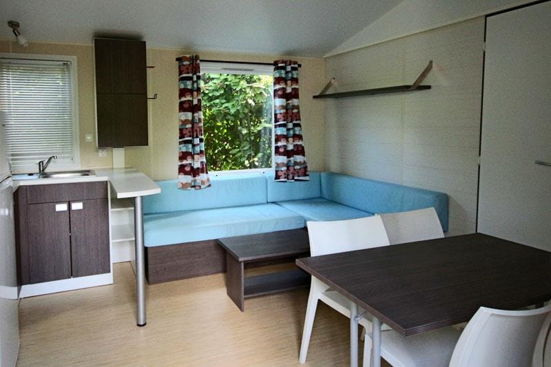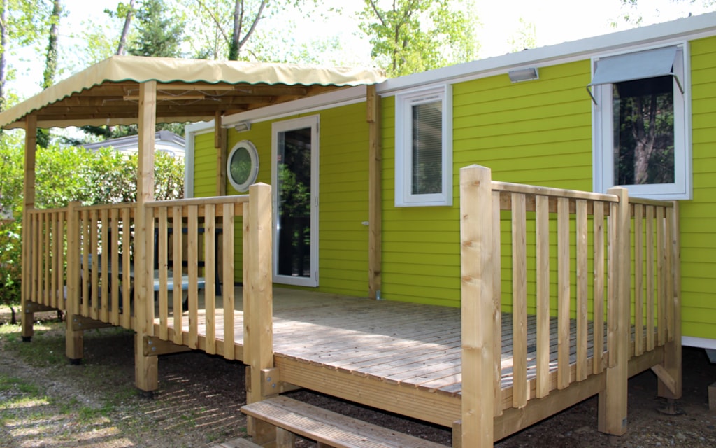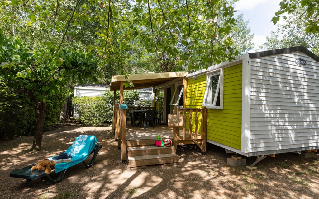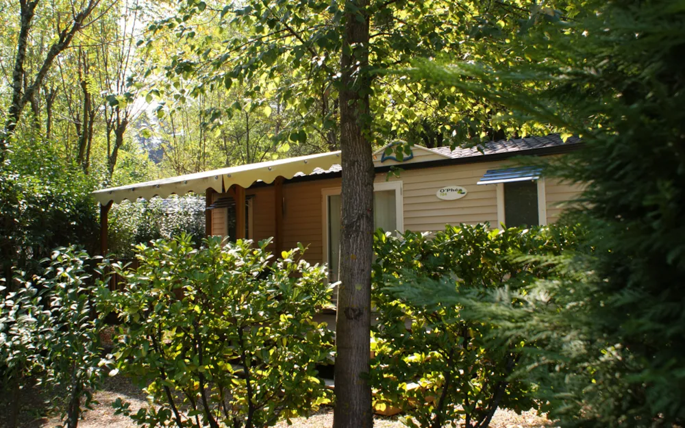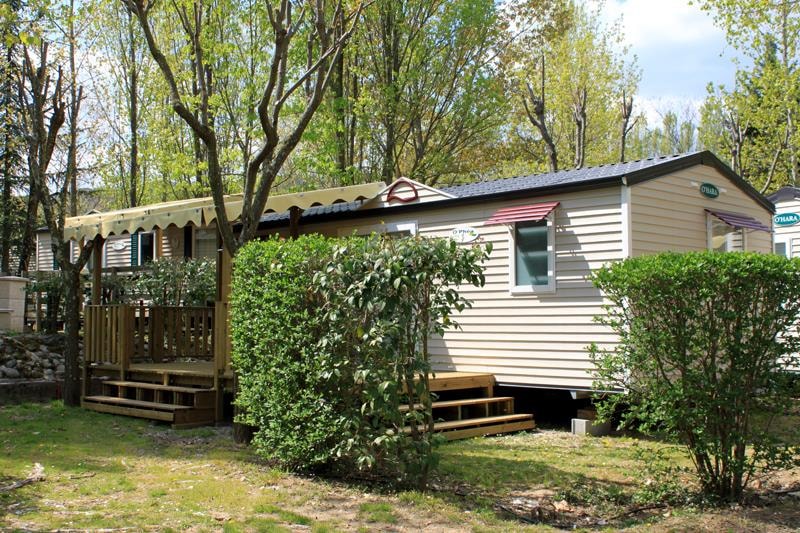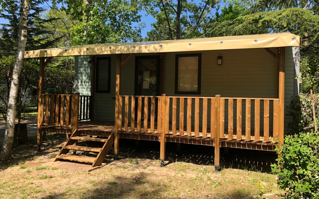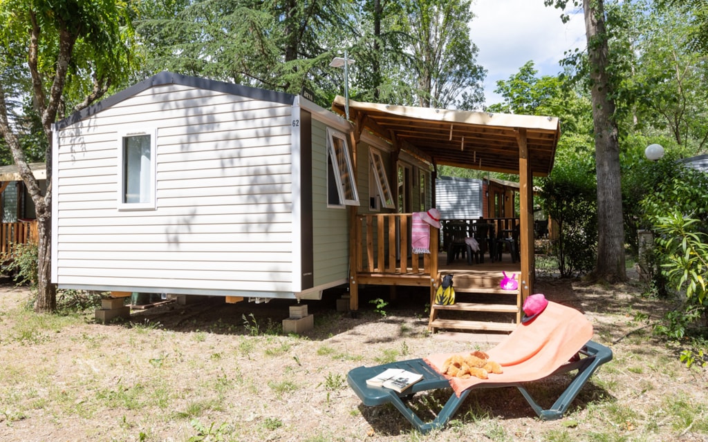 Die Mobilheime Cottage Riviera verfügen über 2 Schlafzimmer. Das Elternschlafzimmer umfasst ein großes Bett (160x200) und bietet Platz für ein Babybett. Diese Mobilheime befinden sich in einem ruhigen Bereich des Campingplatzes.