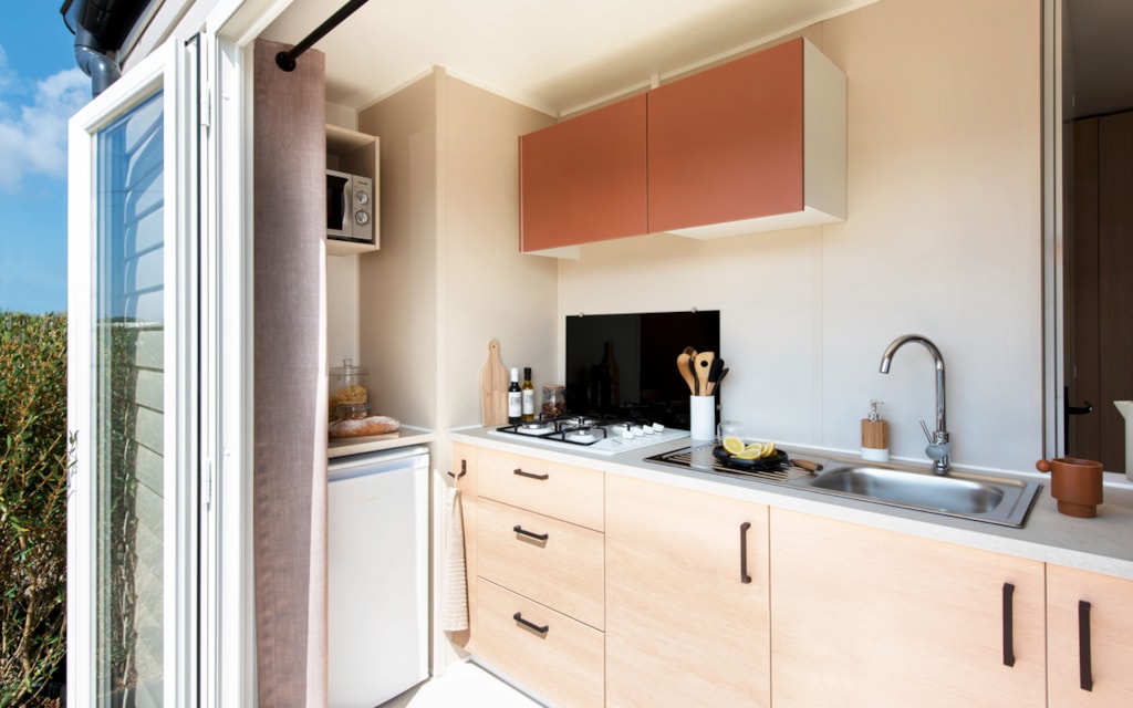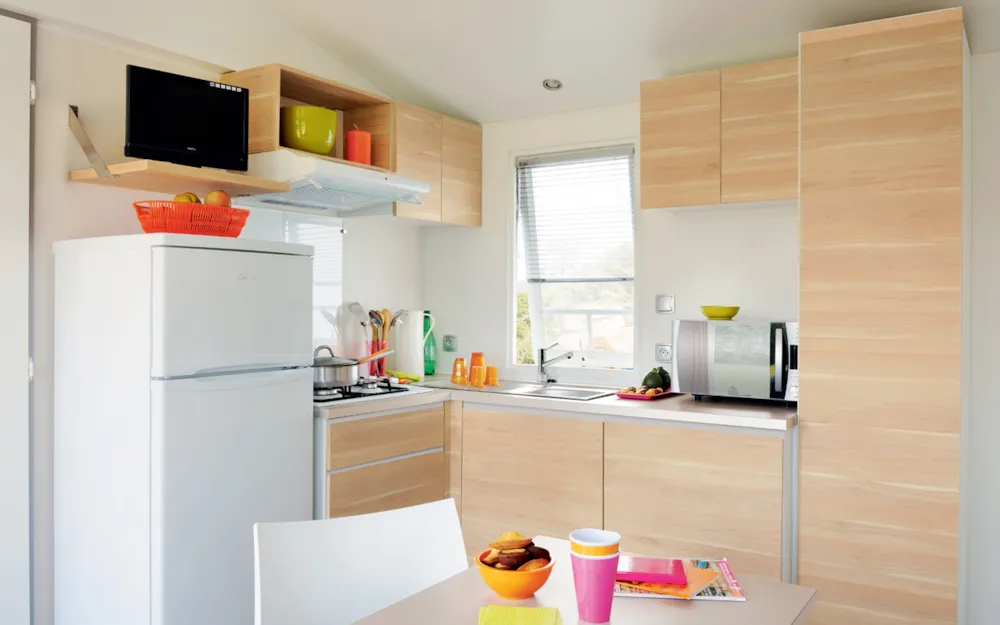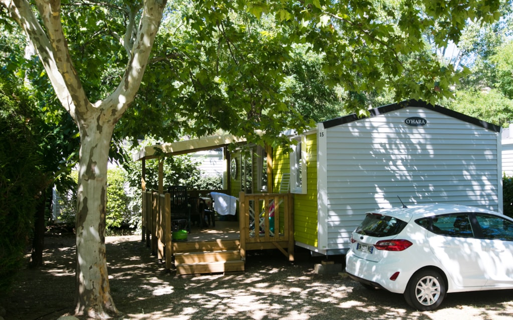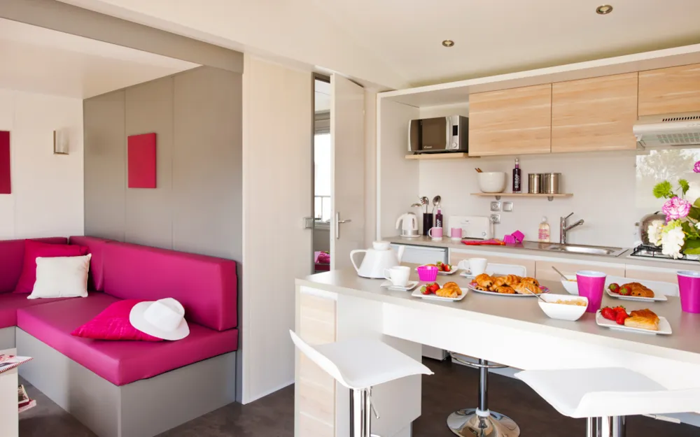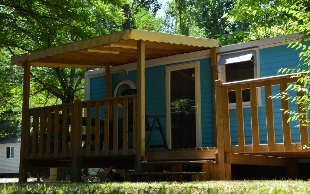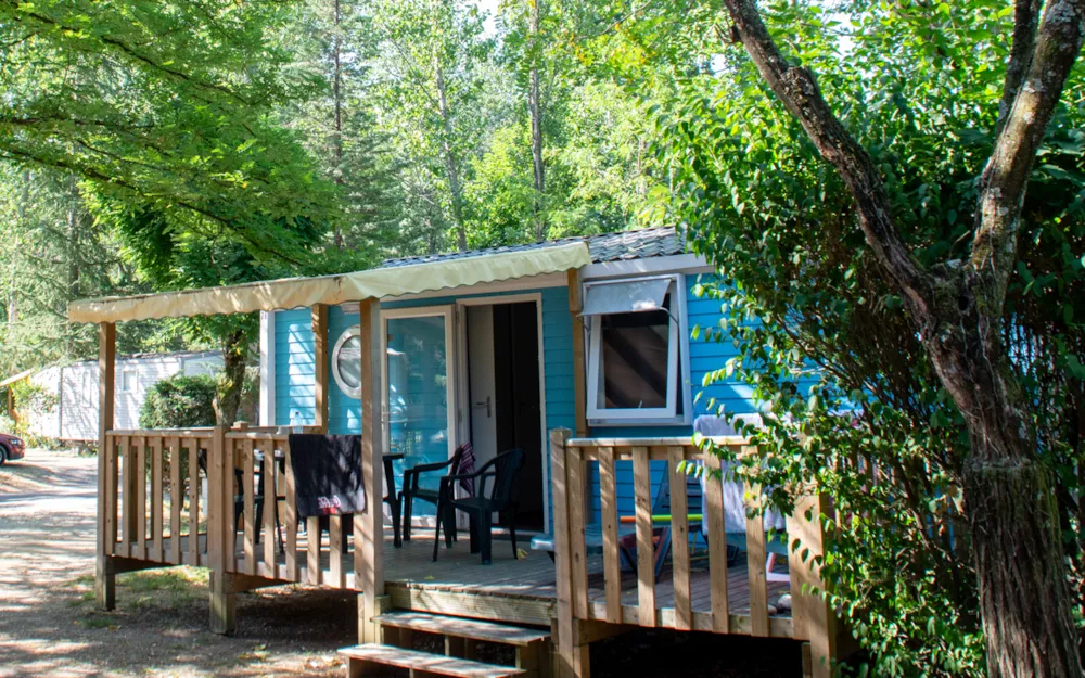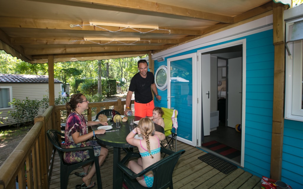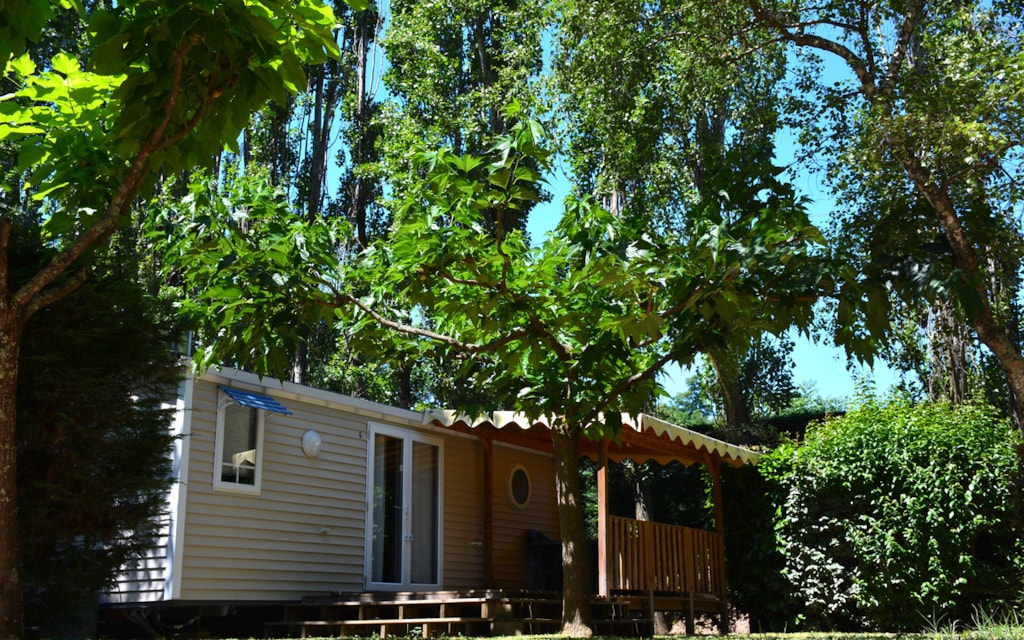 Die Mobilheime Cottage Riviera verfügen über 2 Schlafzimmer. Das Elternschlafzimmer umfasst ein großes Bett (160x200) und bietet Platz für ein Babybett. Diese Mobilheime befinden sich in einem ruhigen Bereich des Campingplatzes.