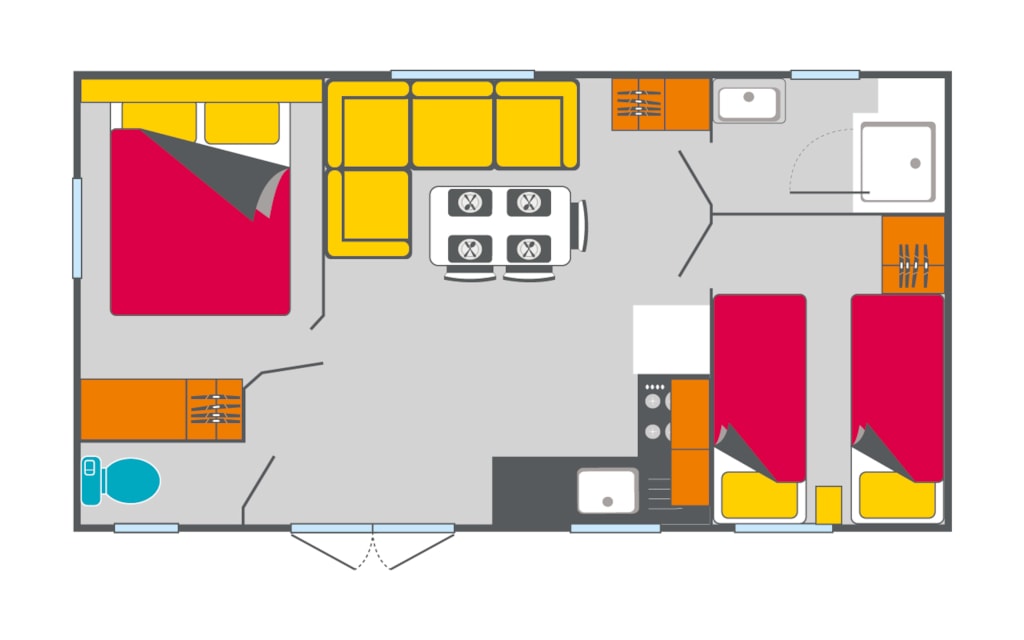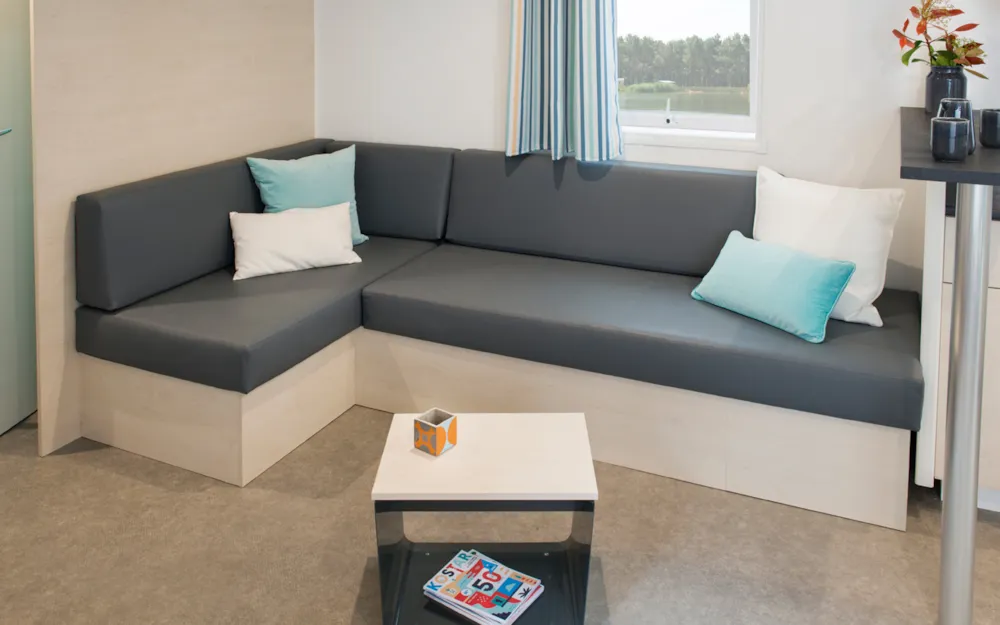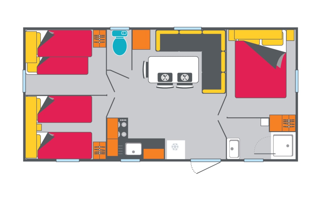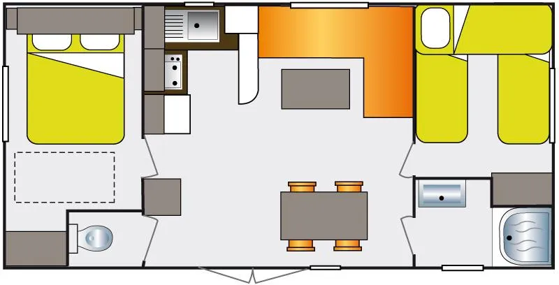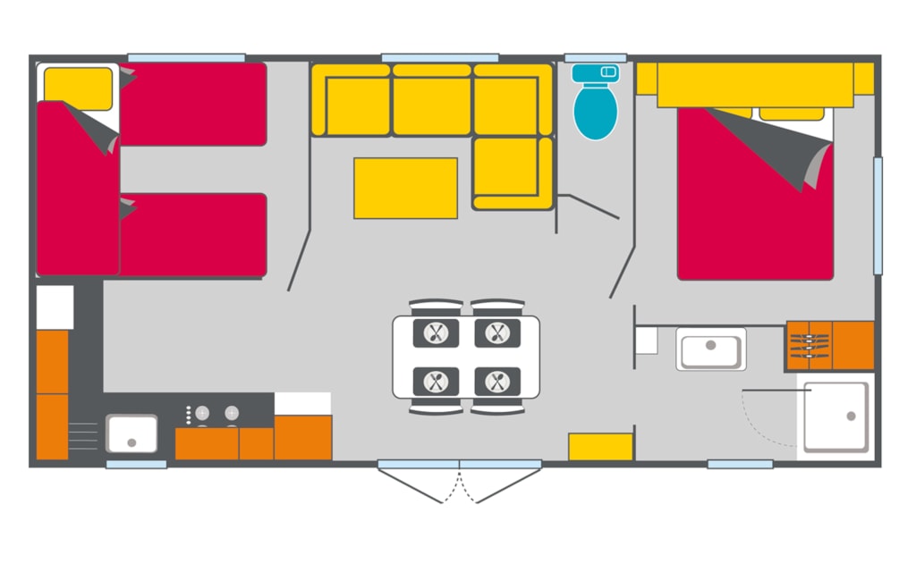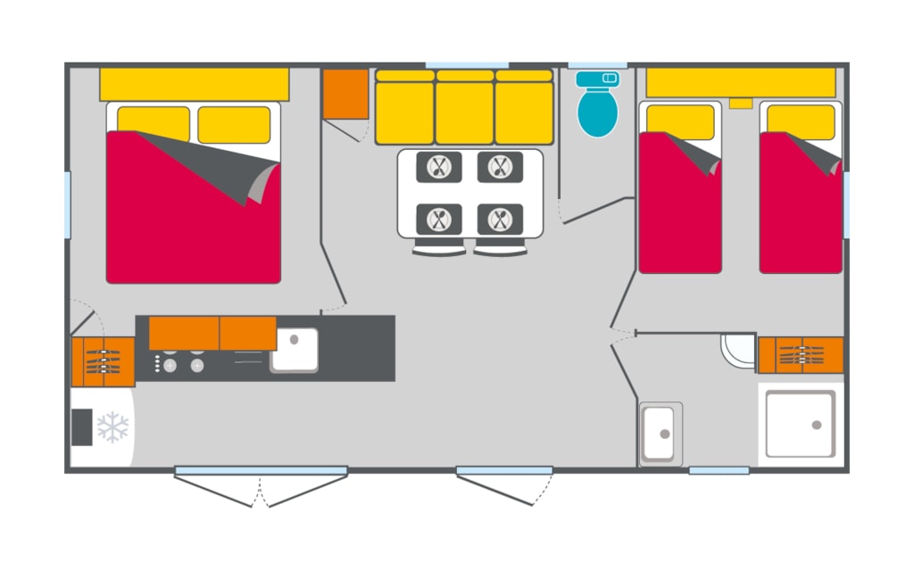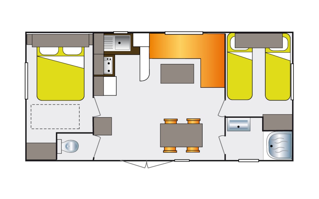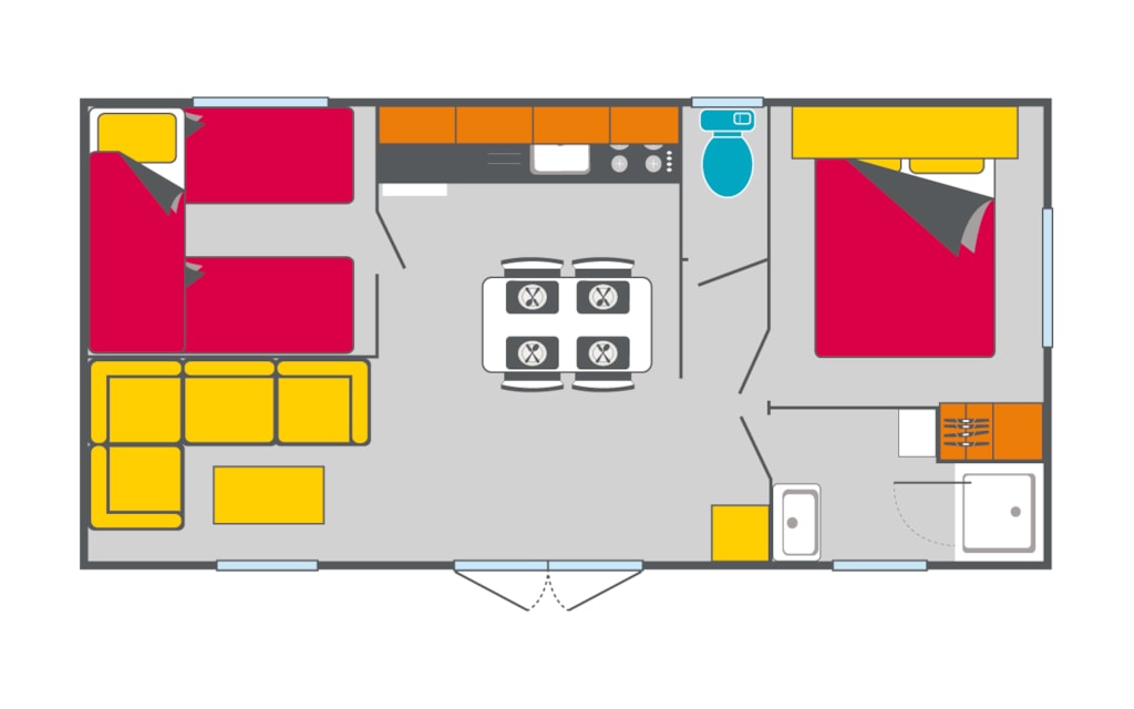 Die Mobilheime Cottage verfügen über 2 Schlafzimmer. Das Elternschlafzimmer enthält ein großes Bett (160x200) und bietet Platz für ein Babybett. Diese Mobilheime befinden sich größtenteils in einem ruhigen Bereich des Campingplatzes.