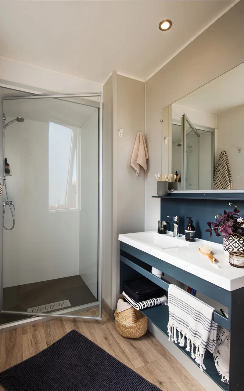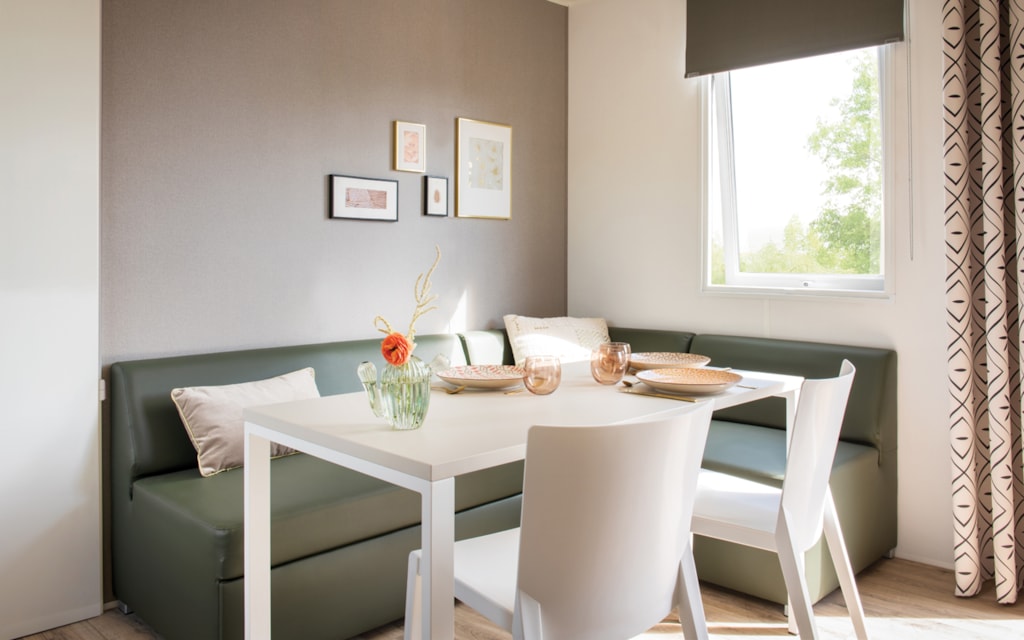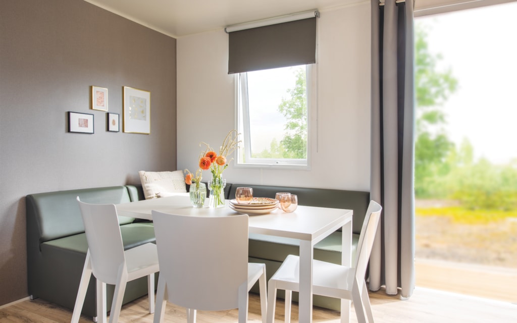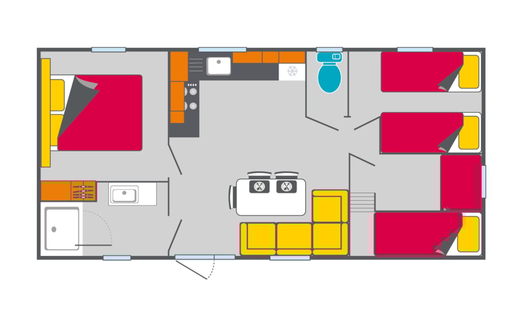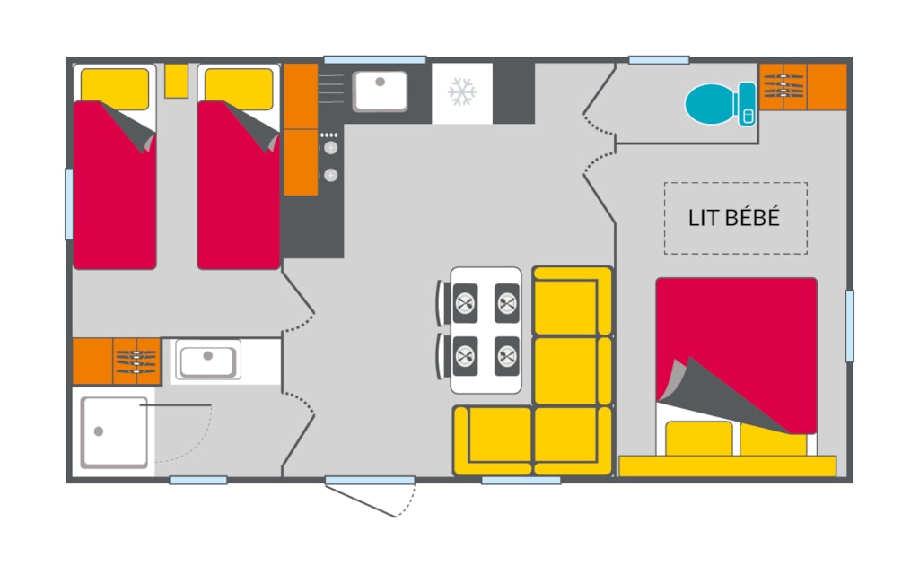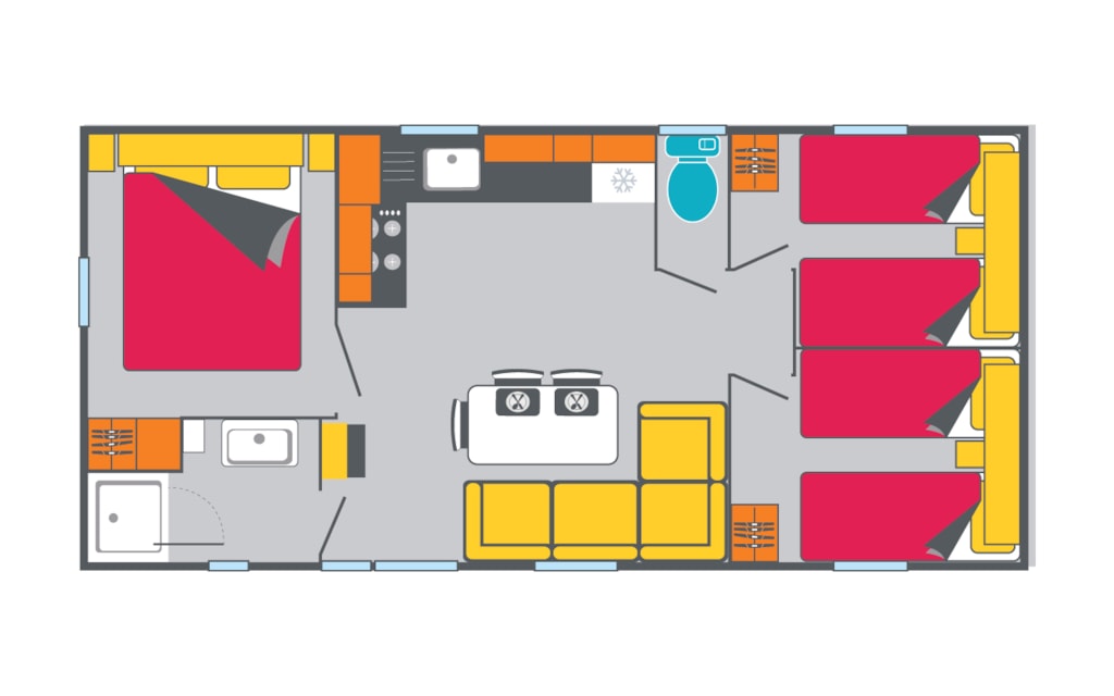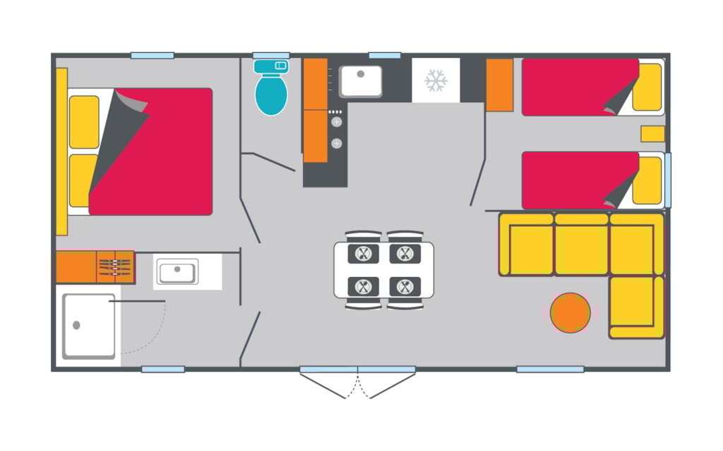 Die Mobilheime Cottage verfügen über 2 Schlafzimmer. Das Elternschlafzimmer enthält ein großes Bett (160x200) und bietet Platz für ein Babybett. Diese Mobilheime befinden sich größtenteils in einem ruhigen Bereich des Campingplatzes.