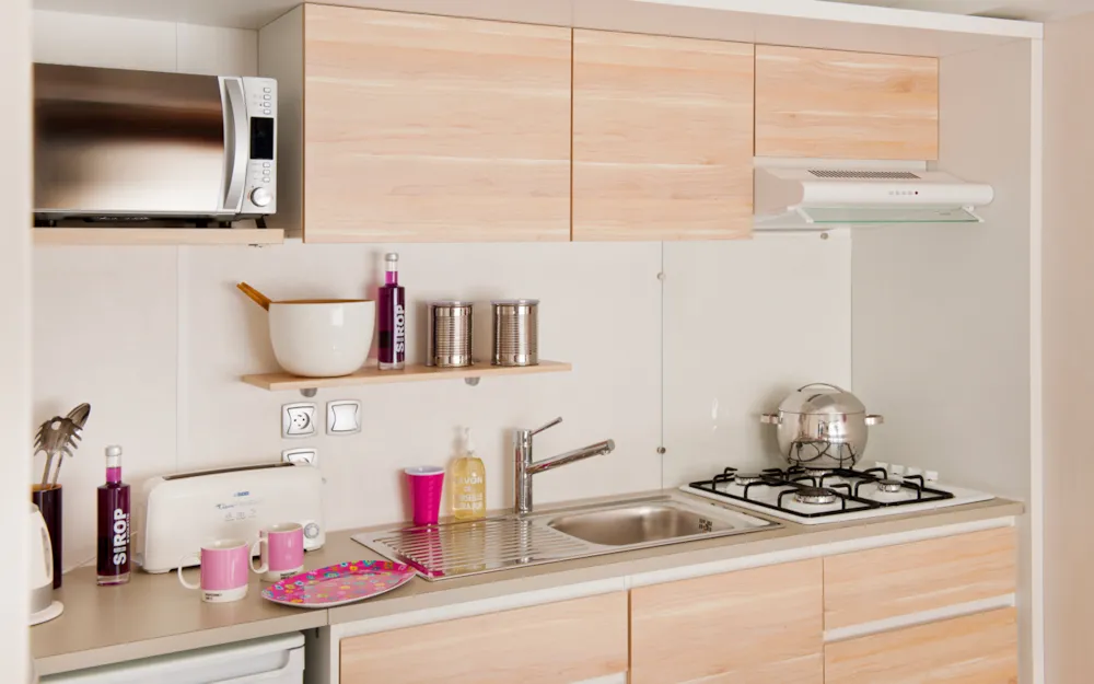 Dieses Mobilheim, das 2021 aufgefrischt wurde, ist ideal für kleine Familien während Ihres Urlaubs in der Süd-Ardèche. Es bietet Platz für eine Familie mit 2 Erwachsenen und 2 Kindern und verfügt über eine Glastür, die sich auf eine überdachte Holzterrasse mit Gartenmöbeln öffnet. Zwei durch ein Wohnzimmer getrennte Schlafzimmer, darunter das Elternschlafzimmer mit einem Doppelbett von 140x190 und das Kinderschlafzimmer mit zwei Einzelbetten von 80x190, eine Wohnküche, ein Badezimmer und ein separates WC.