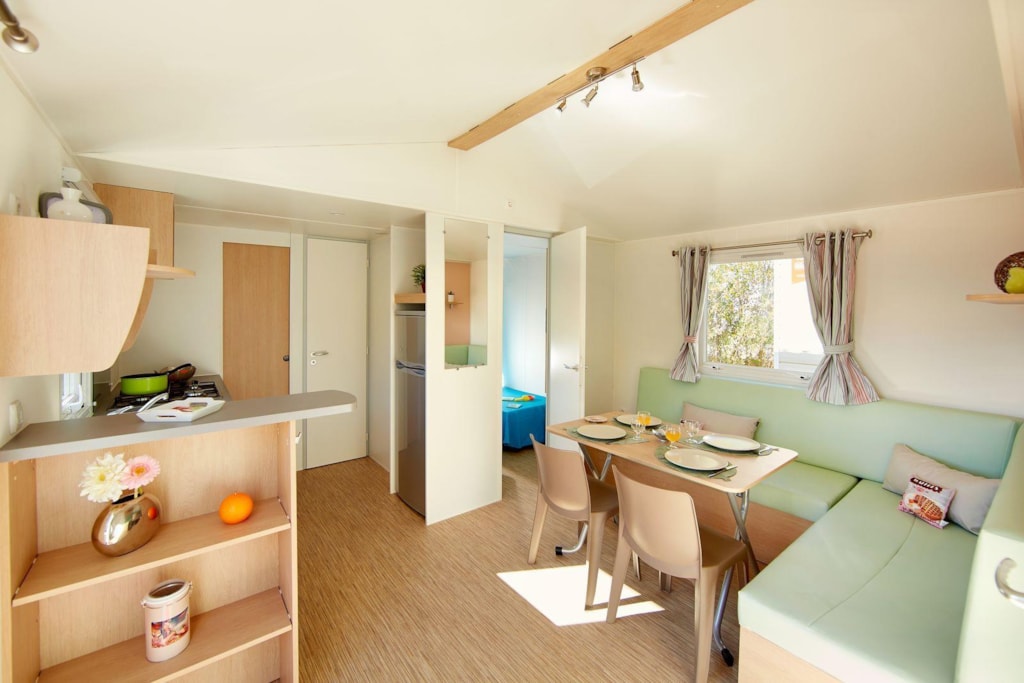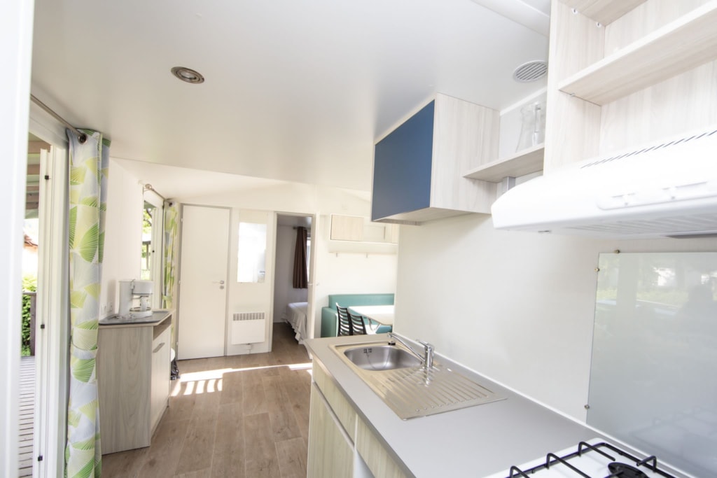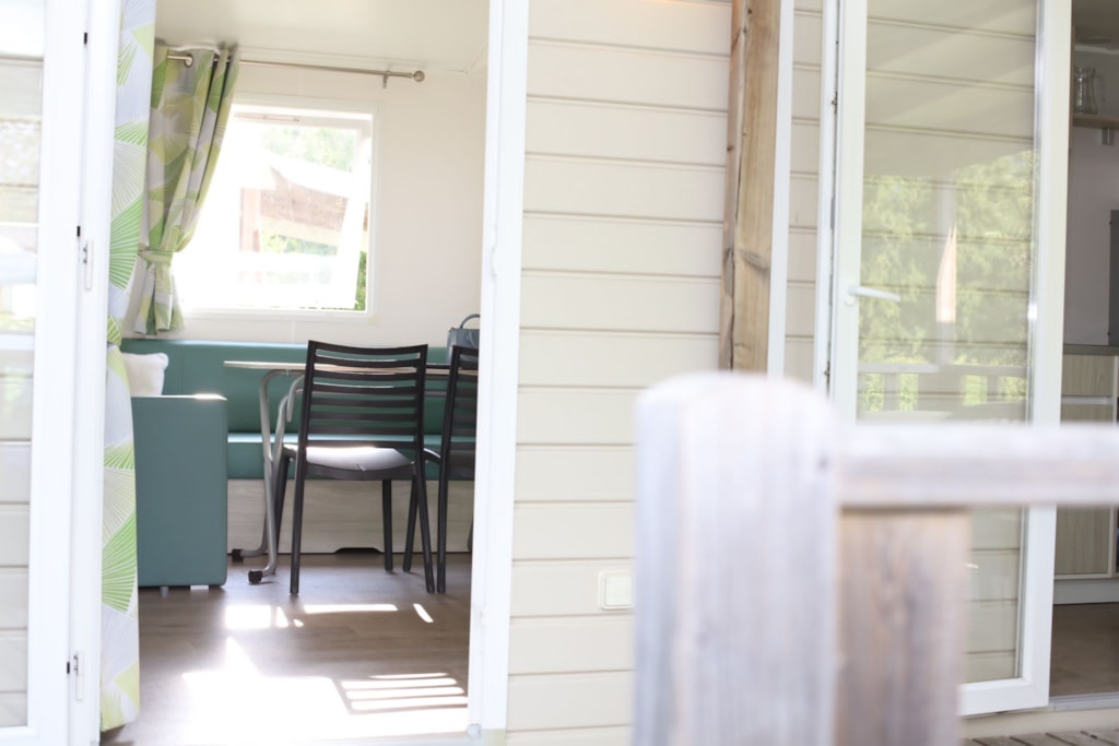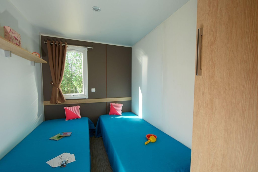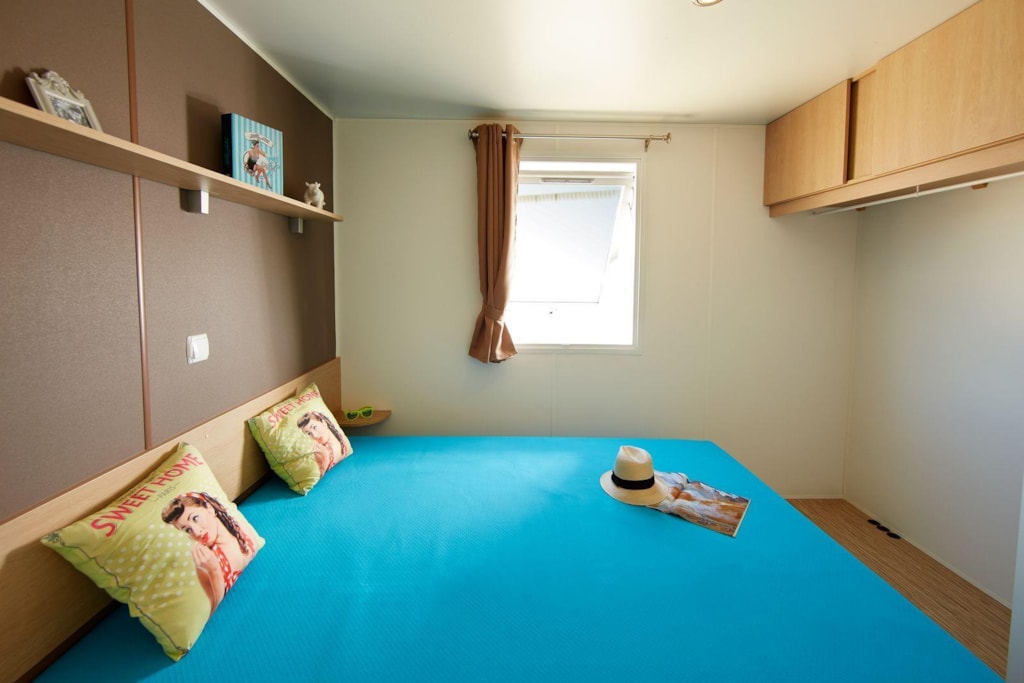 Diese 2016 für 4 bis 6 Personen konzipierten Mobilheime verfügen über ein Hauptschlafzimmer mit einem Doppelbett und ein Schlafzimmer mit zwei Einzelbetten. Im Wohnzimmer steht ein zusätzliches Bett für zwei Personen zur Verfügung. Für Ihren Komfort haben wir im Jahr 2024 eine Klimaanlage installiert. Badezimmer mit Dusche, WC, ausgestattete Küche (Kühlschrank, 4-Flammen-Kochfeld). Draußen eine Terrasse und Gartenmöbel. Ein Grill steht zur Verfügung.