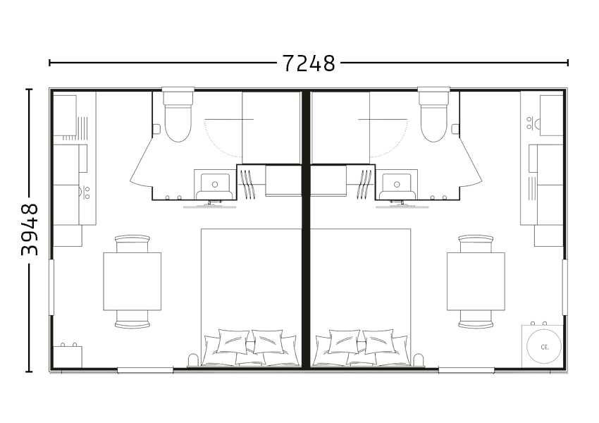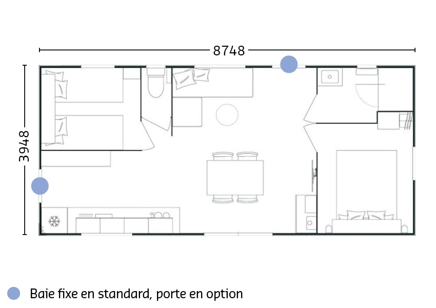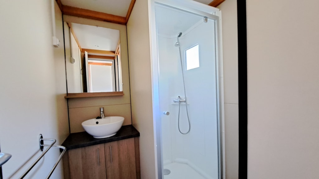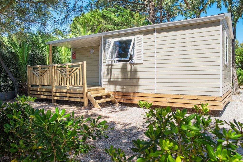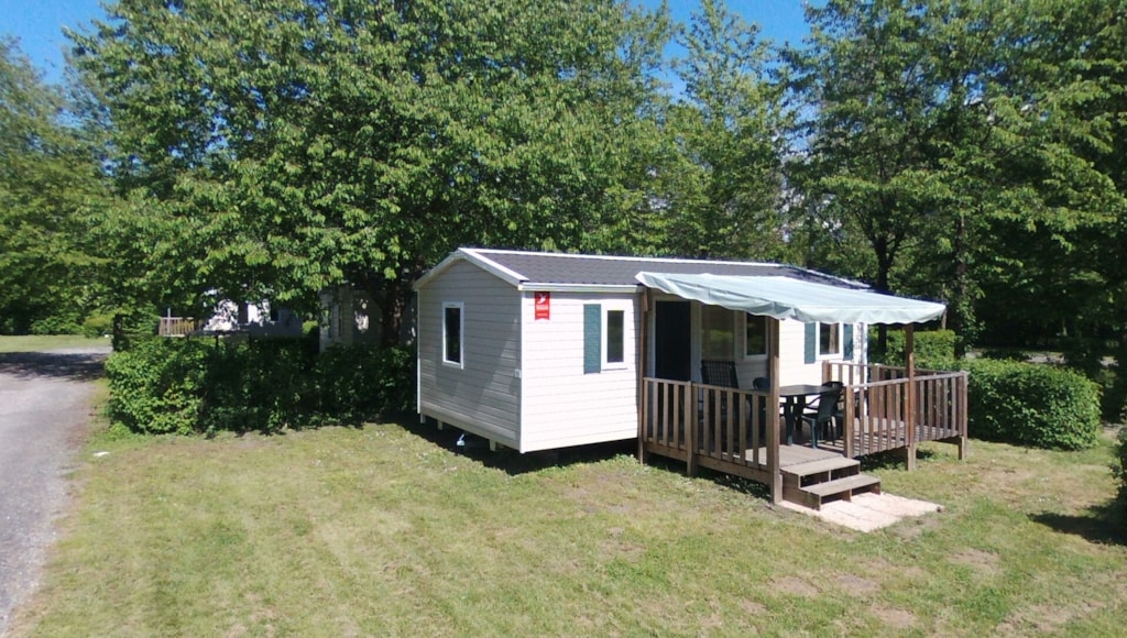 Diese 2016 für 4 bis 6 Personen konzipierten Mobilheime verfügen über ein Hauptschlafzimmer mit einem Doppelbett und ein Schlafzimmer mit zwei Einzelbetten. Im Wohnzimmer steht ein zusätzliches Bett für zwei Personen zur Verfügung. Für Ihren Komfort haben wir im Jahr 2024 eine Klimaanlage installiert. Badezimmer mit Dusche, WC, ausgestattete Küche (Kühlschrank, 4-Flammen-Kochfeld). Draußen eine Terrasse und Gartenmöbel. Ein Grill steht zur Verfügung.