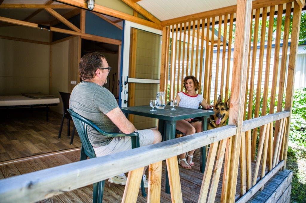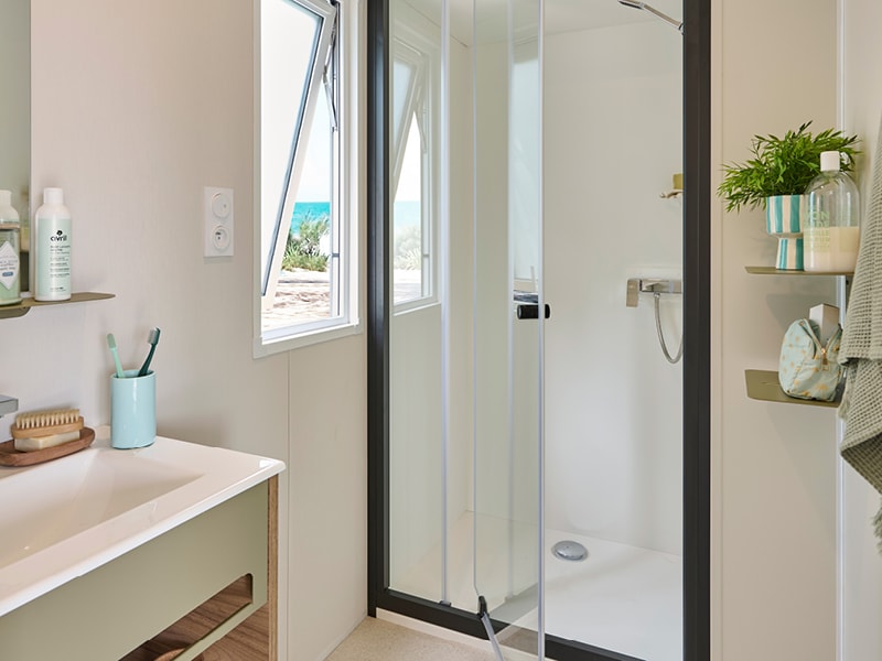 Unsere großzügigen Mobilheime sind ideal für große Familien oder Gruppen von Freunden und verfügen über 3 Schlafzimmer und eine Terrasse. Mit einer Fläche zwischen 32 und 35 m² bieten diese kleinen Häuschen allen Komfort für einen angenehmen Aufenthalt. Die überdachte Terrasse mit einer Fläche von 18 m² ist bei Urlaubern sehr beliebt. Hier können Sie im Freien essen oder einfach nur entspannen. Unsere Mobilheime sind für bis zu 6 Personen ausgelegt und verfügen über eine voll ausgestattete Küche. Sie profitieren von einer Spüle, einem Gas- oder Elektroherd, einem Kühlschrank mit Gefrierfach und einer Mikrowelle. Ein eigenes Badezimmer mit Dusche, Waschbecken und separatem WC sorgt für mehr Privatsphäre. Der Wohnbereich ist mit einer Sitzbank, einem Tisch und Stühlen ausgestattet, damit Sie es sich bequem machen können. So können Sie gesellige Momente bei einem guten Essen mit der Familie oder bei einem Gesellschaftsspiel genießen. Auf der überdachten Terrasse finden Sie Gartenmöbel und einen Wäscheständer. In den Schlafzimmern können die Eltern in einem 140 cm x 190 cm großen Bett schlafen, während die Kinder in den beiden anderen Zimmern in zwei Einzelbetten (90 cm x 190 cm) schlafen.