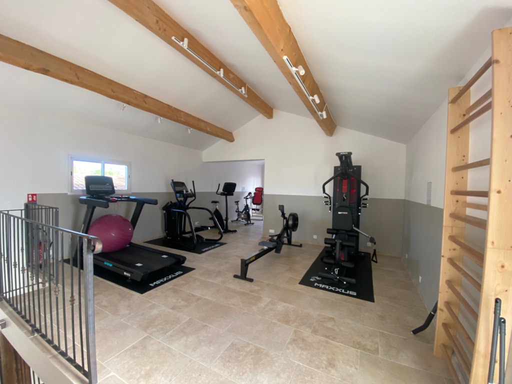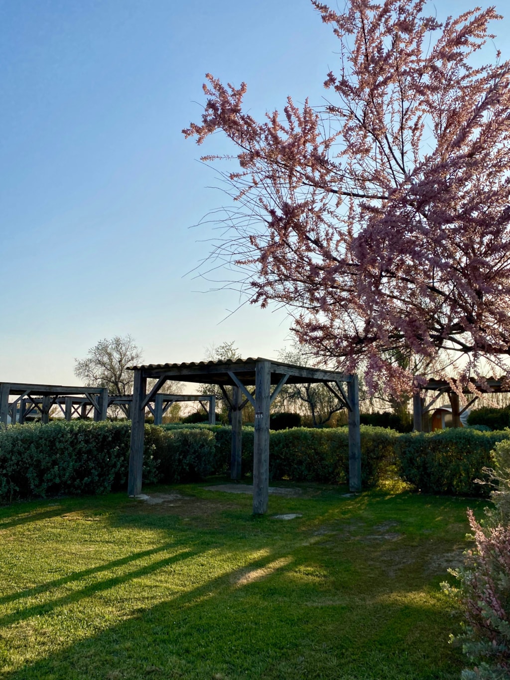 Kühlschrank, Mikrowelle, Elektroherd, Geschirr, Kochutensilien, Kaffeemaschine, Tisch, Hocker, möblierte Holzterrasse mit Gartenmöbeln und Pergola