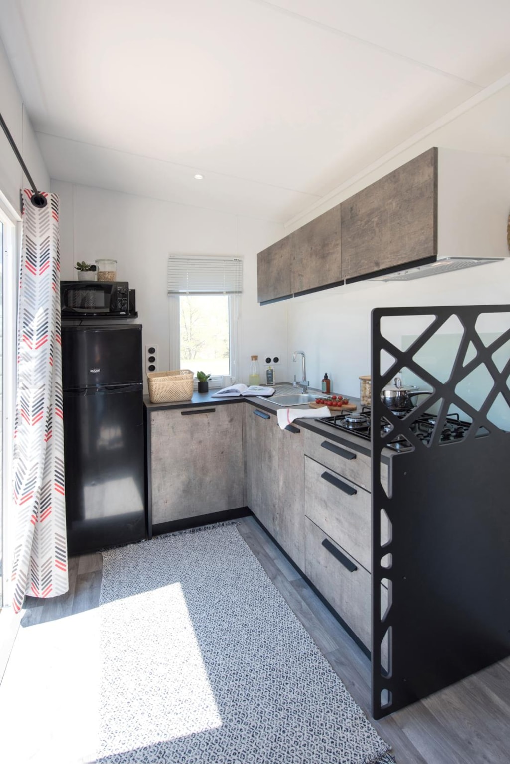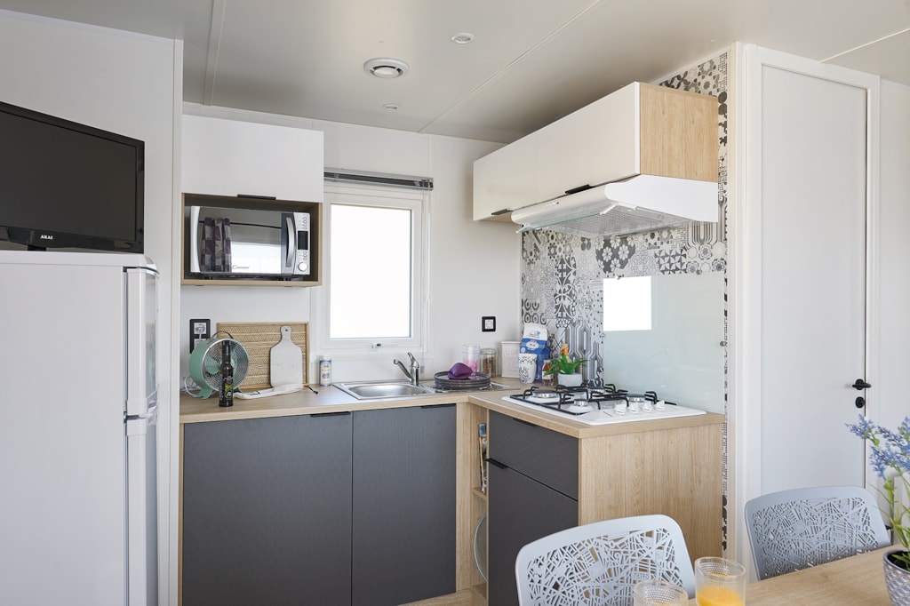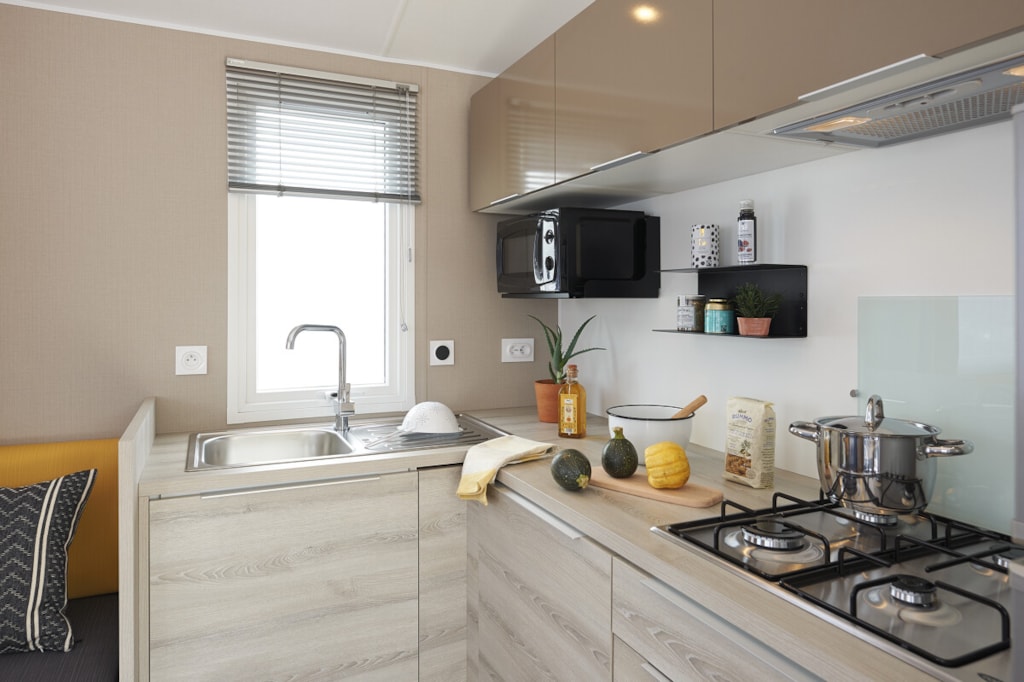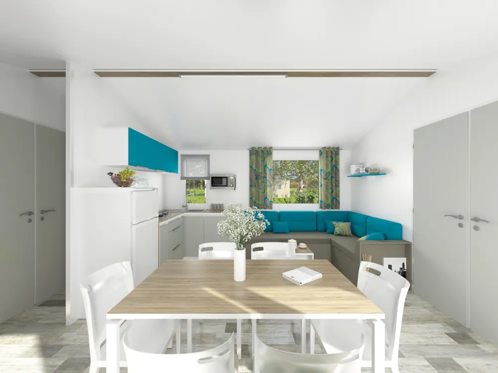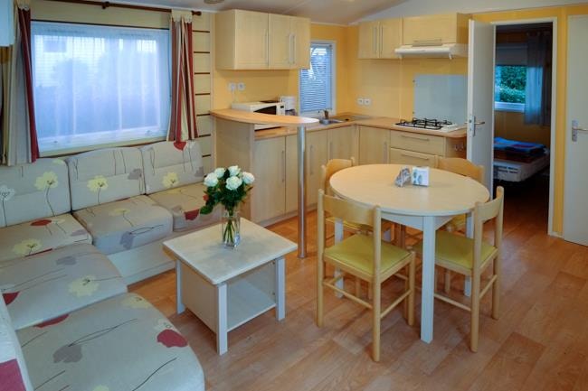 Unser 4-Zimmer-Modell ist das geräumigste des Campingplatzes und bietet Ihnen einen hohen Komfort mit seinem luftigen Wohnraum mit Sitzecke, in der sich eine Bank und ein Tisch befinden, und seiner Küche mit 4-Flammen-Gasherd, Mikrowelle und Kaffeemaschine für ein gemütliches Zusammensein mit der Familie oder mit Freunden.