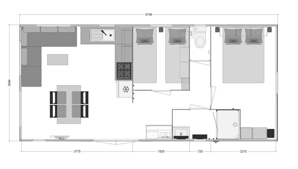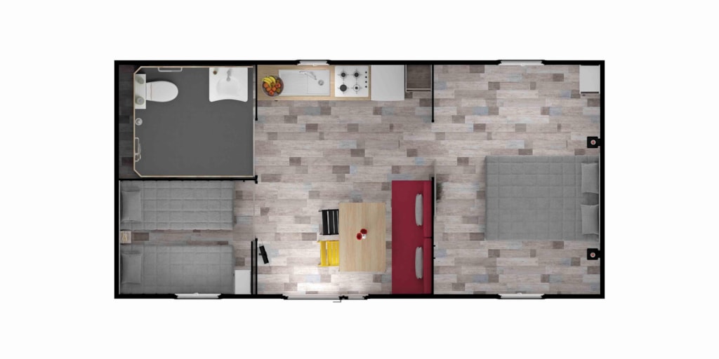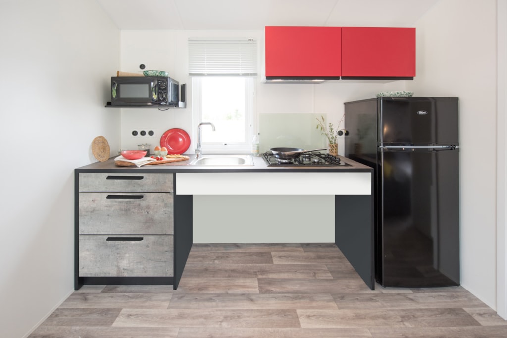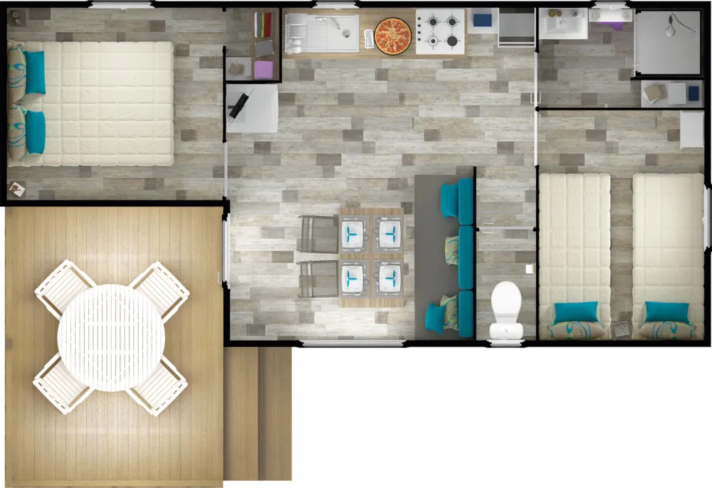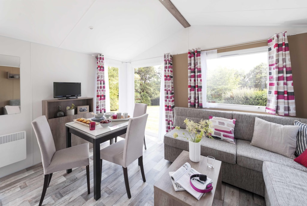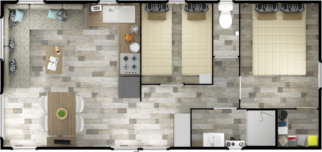 Unser 4-Zimmer-Modell ist das geräumigste des Campingplatzes und bietet Ihnen einen hohen Komfort mit seinem luftigen Wohnraum mit Sitzecke, in der sich eine Bank und ein Tisch befinden, und seiner Küche mit 4-Flammen-Gasherd, Mikrowelle und Kaffeemaschine für ein gemütliches Zusammensein mit der Familie oder mit Freunden.