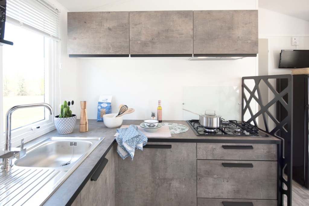 Diese Ferienhäuser verfügen über einen großen Wohnbereich mit Sitzbank und rechteckigem Tisch sowie eine Küchenzeile mit 4-Flammen-Gasherd, Mikrowelle und Kaffeemaschine, die der ganzen Familie gefallen wird.