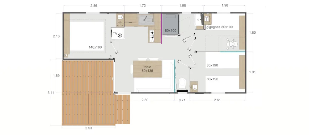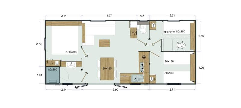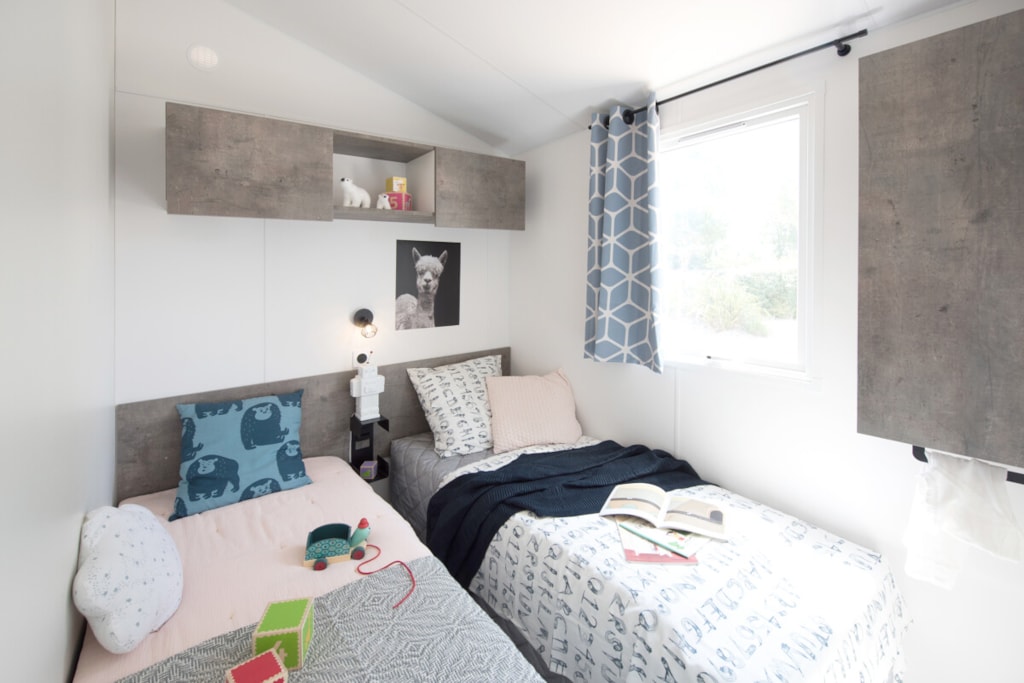 Dieses geräumige Mobilheim bietet Ihnen einen ruhigen und komfortablen Aufenthalt mit drei Schlafzimmern, die mit einem Doppelbett (140x190) und vier Einzelbetten (90x190) mit Decken und Kopfkissen ausgestattet sind.