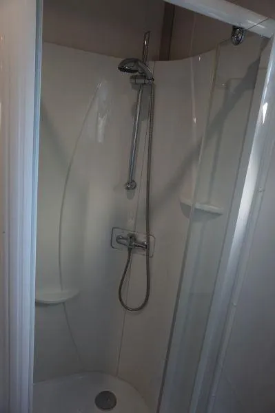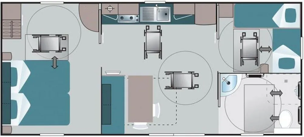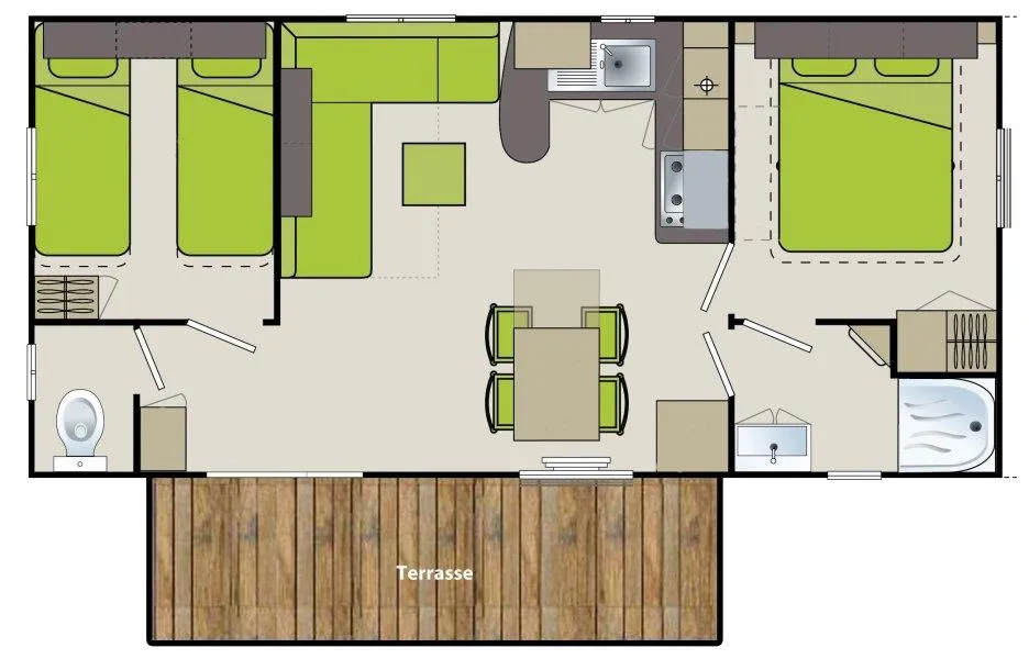 Das Mobilheim verfügt über : 1 Zimmer mit 1 Doppelbett 140X190cm. 1 Zimmer mit 2 Einzelbetten 80X190cm. Ein Badezimmer mit Dusche, Waschbecken und WC. 1 Küche mit Kühlschrank, Gasherd mit 4 Kochstellen, Mikrowelle, Kaffeemaschine. Das Wohnzimmer verfügt über einen Tisch mit Stühlen und eine Sitzbank. Die Terrasse ist aus Holz und überdacht mit Gartenmöbeln und Liegestühlen/Sonnenliegen. Infos: Bettdecken oder Federbetten und Kopfkissen sind vorhanden. Bettwäsche, Handtücher und Reinigungsmittel werden jedoch nicht bereitgestellt. Nicht vertragliche Fotos